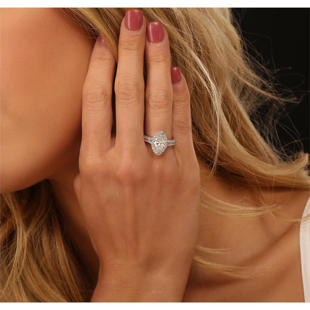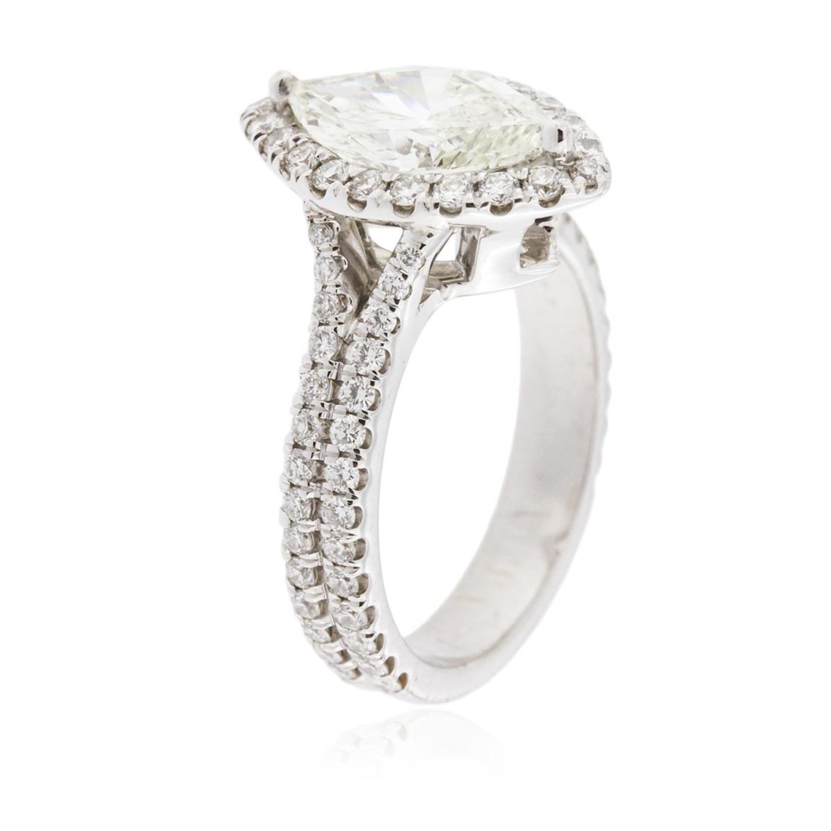 One electronically tested 18KT white gold Ladies combination cast & assembled engagement ring with a bright polish finish. Identified with markings of "18K". Condition is new. Containing: One prong set marquise shaped cut diamond, measuring 12.45 x 6.38 x 3.80mm (depth est.) approximate weight of 1.54ct. Clarity of SI-2, Color of M, Cut is Good. Seventy-Six bead set round brilliant cut diamonds, measuring 1.50 - 1.50 x 0.90mm (depth est.) approximate total weight of 76 Stones = 0.82ct. Clarity of SI-1 to SI-2, Color of G - H, Cut is Very Good. Total Weight of Diamonds 2.36ct. Total Weight of Ring 5.90gm. GGL Appraised at $22,485.00.
