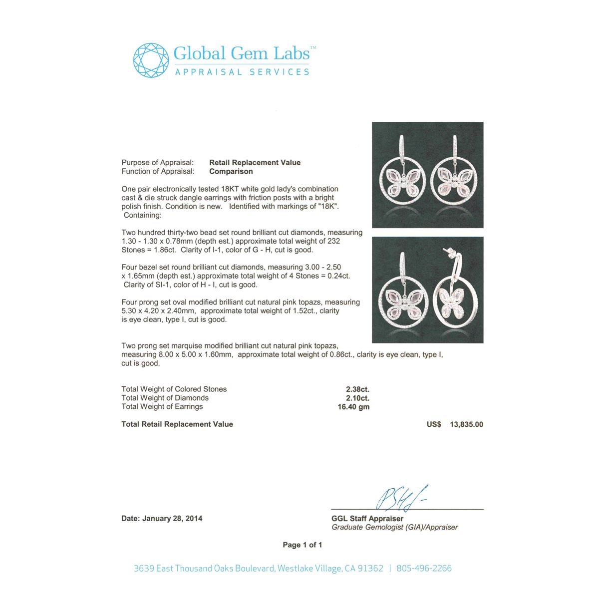 One pair electronically tested 18KT white gold Ladies combination cast & die struck dangle earrings with friction posts with a bright polish finish. Identified with markings of "18K". Condition is new. Containing: Two Hundred Thirty-Two bead set round brilliant cut diamonds, measuring 1.30 - 1.30 x 0.78mm (depth est.) approximate total weight of 232 Stones = 1.86ct. Clarity of I-1, Color of G - H, Cut is Good. Four bezel set round brilliant cut diamonds, measuring 3.00 - 2.50 x 1.65mm (depth est.) approximate total weight of 4 Stones = 0.24ct. Clarity of SI-1, Color of H - I, Cut is Good. Four prong set oval modified brilliant cut natural pink topaz, measuring 5.30 x 4.20 x 2.40mm, approximate total weight of 1.52ct., clarity is eye clean, type I, cut is good. Two prong set marquise modified brilliant cut natural pink topaz, measuring 8.00 x 5.00 x 1.60mm, approximate total weight of 0.86ct., clarity is eye clean, type I, cut is good. Total Weight of Colored Stones 2.38ct. Total Weight of Diamonds 2.10ct. Total Weight of Earrings 16.40gm. GGL Appraised at $13,835.00.