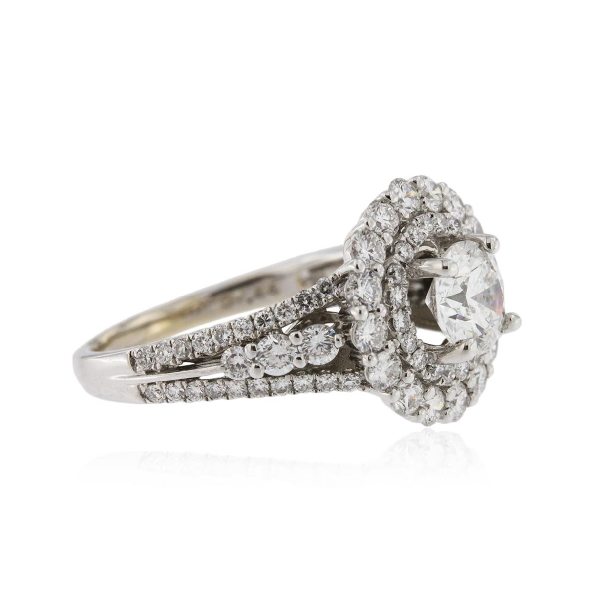 One electronically tested 18KT white gold Ladies combination cast & assembled engagement ring with a bright polish finish. Condition is new. Containing: One prong set round brilliant cut diamond, measuring 6.44 - 6.34 x 4.00mm (depth est.) approximate weight of 1.01ct. Clarity: SI-2. Color: D, Cut is Very Good. EGLUSA #US 9057411102D. Sixteen prong set round brilliant cut diamonds, measuring 2.30 - 2.30 x 1.38mm (depth est.) approximate. Total Weight of 16 Stones = 0.71ct. Clarity: VS-2 to SI-1. Color: I - J, Cut is Very Good. Six prong set round brilliant cut diamonds, measuring 2.10 - 2.10 x 1.26mm (depth est.) approximate. Total Weight of 6 Stones = 0.20ct. Clarity: VS-2 to SI-1. Color: I - J, Cut is Very Good. Sixty prong set round brilliant cut diamonds, measuring 1.30 - 1.30 x 0.78mm (depth est.) approximate. Total Weight of 60 Stones = 0.48ct. Clarity: SI-1 to SI-2. Color: I - J, Cut is Good. Total Weight of Diamonds 2.41ct. Total Weight of Ring 6.60 grams. GGL Appraised at $32,790.00.