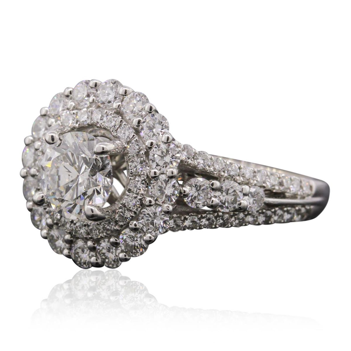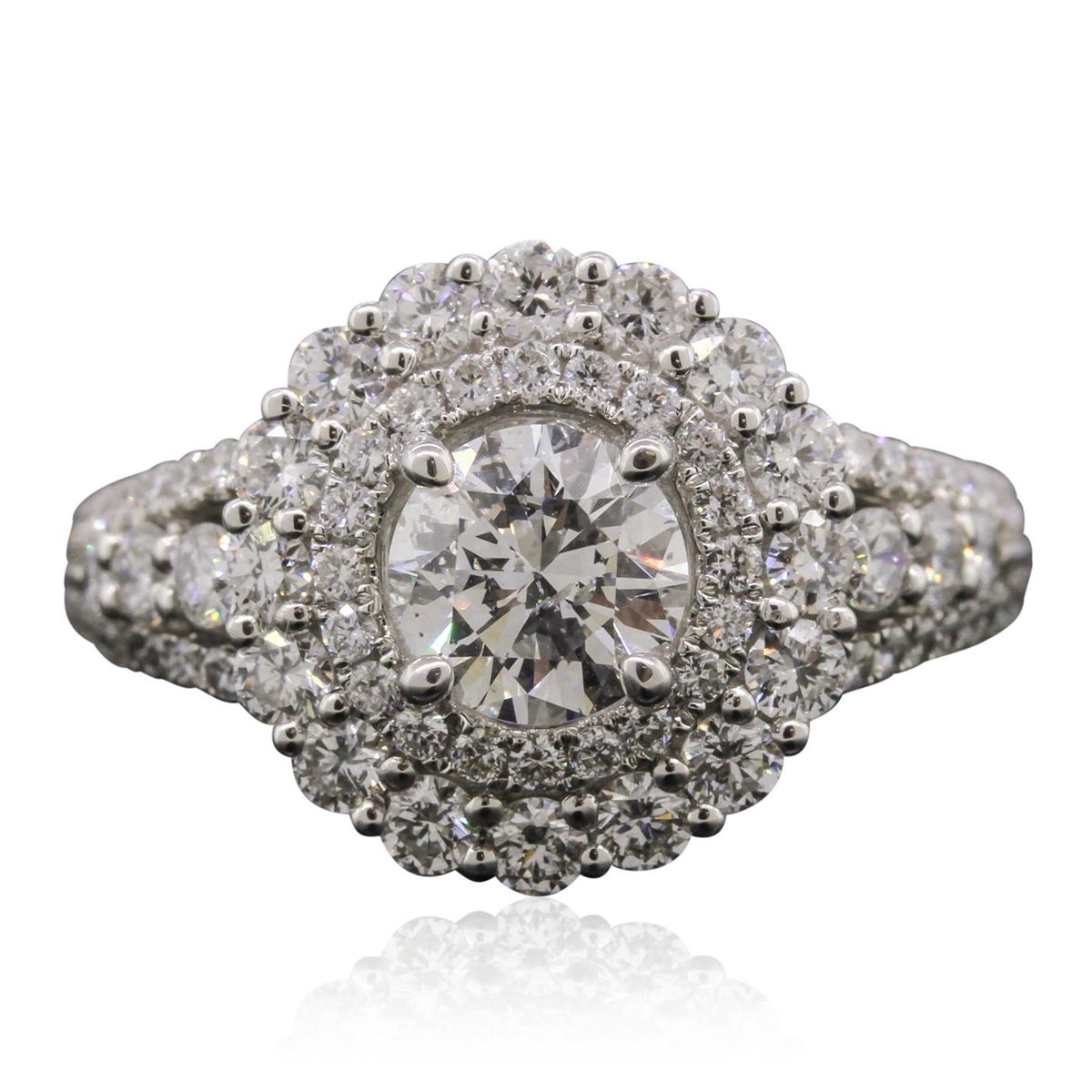 One electronically tested 18KT white gold Ladies combination cast & assembled engagement ring with a bright polish finish. Condition is new. Containing: One prong set round brilliant cut diamond, measuring 6.44 - 6.34 x 4.00mm (depth est.) approximate weight of 1.01ct. Clarity: SI-2. Color: D, Cut is Very Good. EGLUSA #US 9057411102D. Sixteen prong set round brilliant cut diamonds, measuring 2.30 - 2.30 x 1.38mm (depth est.) approximate. Total Weight of 16 Stones = 0.71ct. Clarity: VS-2 to SI-1. Color: I - J, Cut is Very Good. Six prong set round brilliant cut diamonds, measuring 2.10 - 2.10 x 1.26mm (depth est.) approximate. Total Weight of 6 Stones = 0.20ct. Clarity: VS-2 to SI-1. Color: I - J, Cut is Very Good. Sixty prong set round brilliant cut diamonds, measuring 1.30 - 1.30 x 0.78mm (depth est.) approximate. Total Weight of 60 Stones = 0.48ct. Clarity: SI-1 to SI-2. Color: I - J, Cut is Good. Total Weight of Diamonds 2.41ct. Total Weight of Ring 6.60 grams. GGL Appraised at $32,790.00.