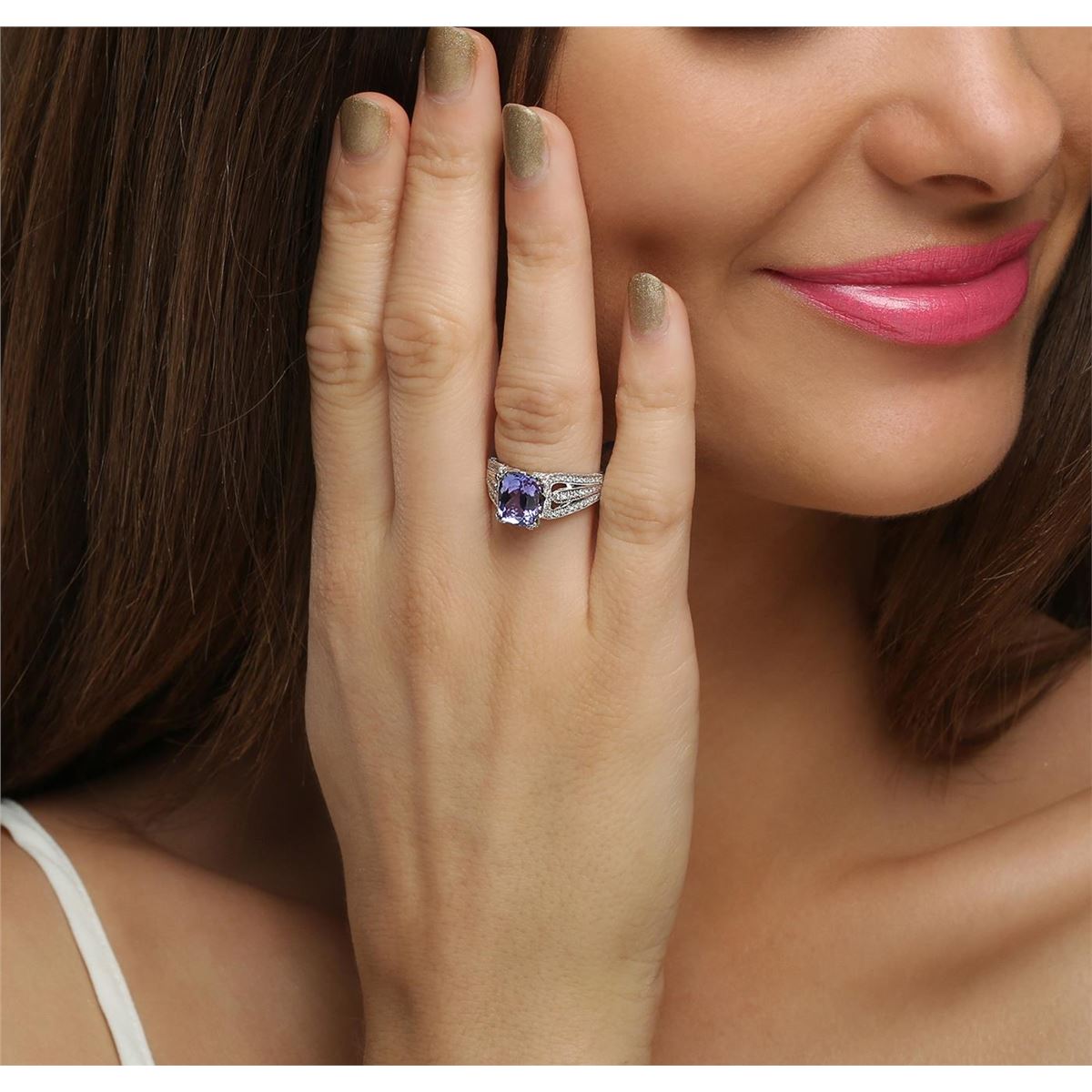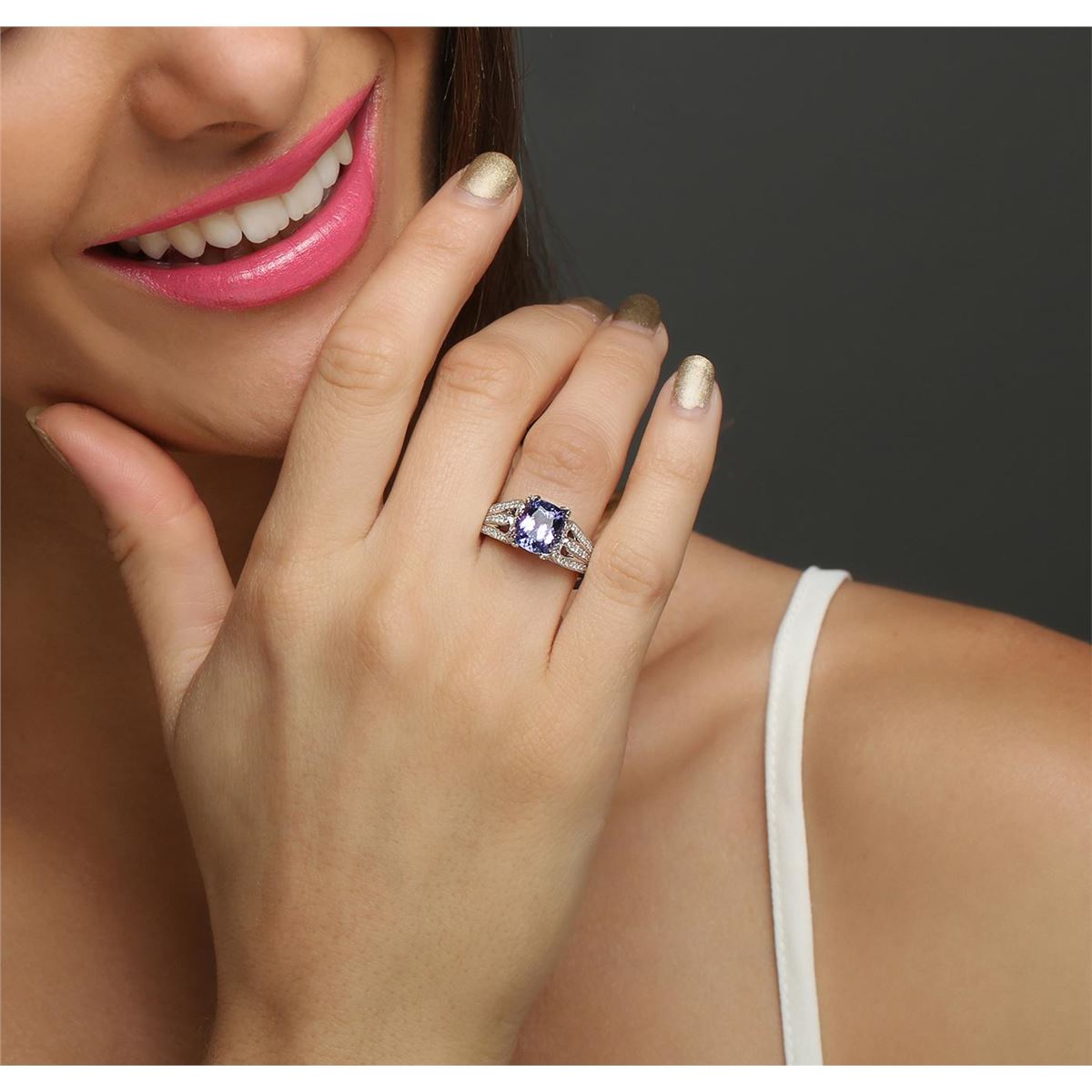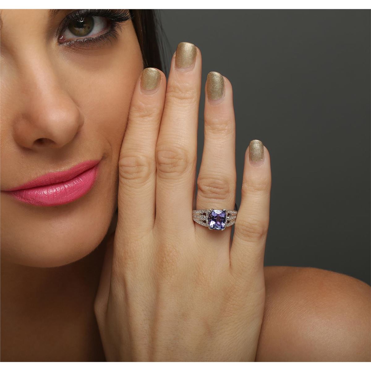 One electronically tested 18KT white gold ladies combination cast & assembled ring with a bright polish finish. Identified with markings of "750". Condition is new. Containing: One prong set rectangular cushion modified brilliant cut natural tanzanite, measuring 9.07 x 7.22 x 4.69mm, approximate weight of 2.42ct., clarity is eye clean, type I, medium light, very slightly grayish, violet color, (GIA V 4/3), cut is good. One Hundred Fifty-Two prong set round brilliant cut diamonds, measuring 1.30 - 1.10 x 0.72mm (depth est.) approximate total weight of 152 Stones = 0.61ct. Clarity: SI-1 to SI-2. Color: I - J, Cut is Good. Colored gemstones are presumed to have been subjected to commonly used enhancement processes. All diamonds and colored gemstones are graded in the mounting, unless otherwise stated. Total Weight of Colored Stones 2.42ct. Total Weight of Diamonds 0.61ct. Total Weight of Ring 7.10 grams. GGL Appraised at $8,565.00.