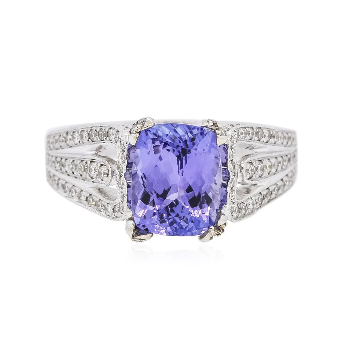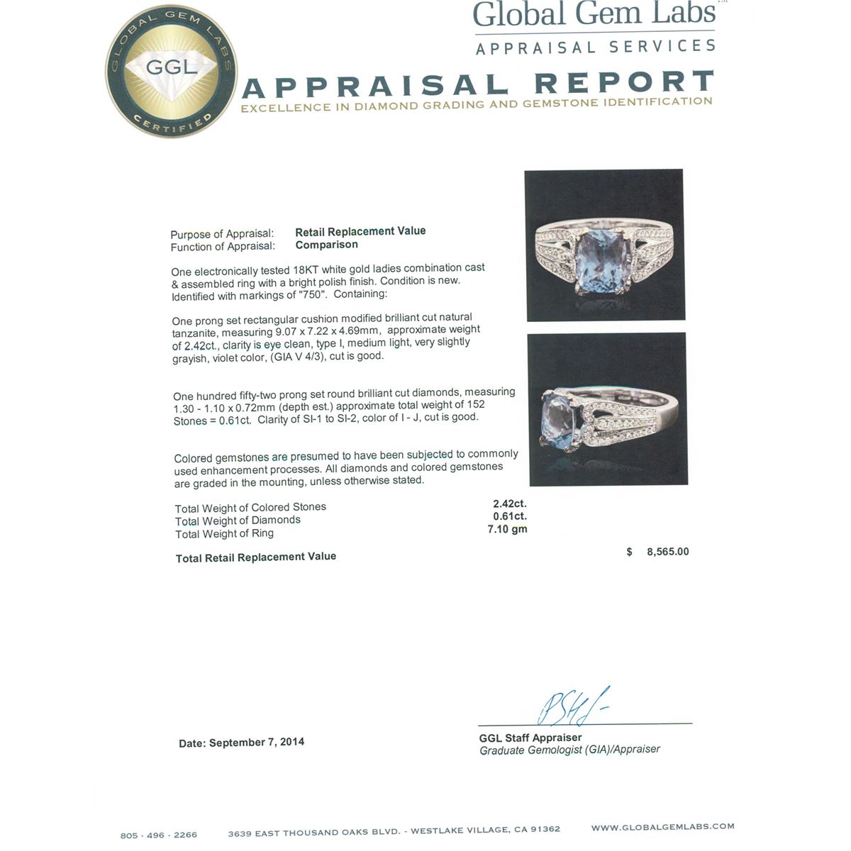 One electronically tested 18KT white gold ladies combination cast & assembled ring with a bright polish finish. Identified with markings of "750". Condition is new. Containing: One prong set rectangular cushion modified brilliant cut natural tanzanite, measuring 9.07 x 7.22 x 4.69mm, approximate weight of 2.42ct., clarity is eye clean, type I, medium light, very slightly grayish, violet color, (GIA V 4/3), cut is good. One Hundred Fifty-Two prong set round brilliant cut diamonds, measuring 1.30 - 1.10 x 0.72mm (depth est.) approximate total weight of 152 Stones = 0.61ct. Clarity: SI-1 to SI-2. Color: I - J, Cut is Good. Colored gemstones are presumed to have been subjected to commonly used enhancement processes. All diamonds and colored gemstones are graded in the mounting, unless otherwise stated. Total Weight of Colored Stones 2.42ct. Total Weight of Diamonds 0.61ct. Total Weight of Ring 7.10 grams. GGL Appraised at $8,565.00.