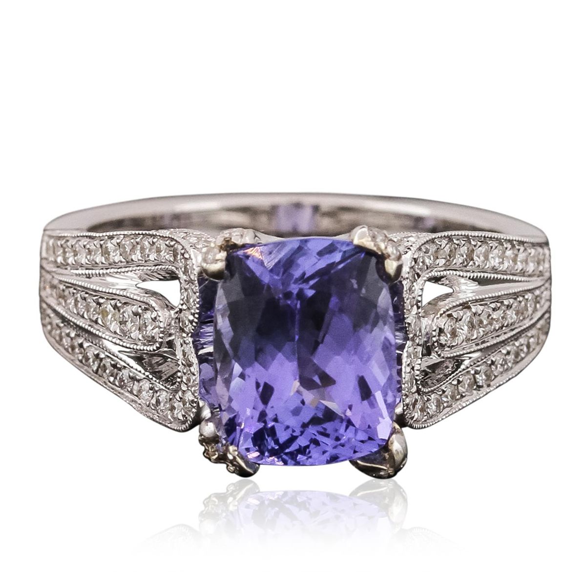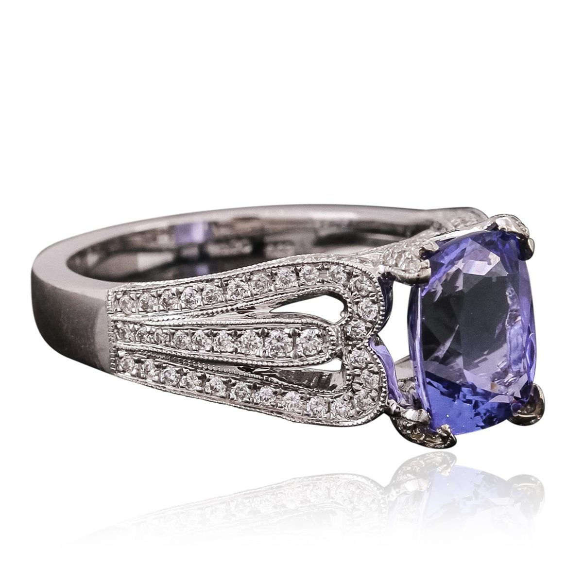 One electronically tested 18KT white gold ladies combination cast & assembled ring with a bright polish finish. Identified with markings of "750". Condition is new. Containing: One prong set rectangular cushion modified brilliant cut natural tanzanite, measuring 9.07 x 7.22 x 4.69mm, approximate weight of 2.42ct., clarity is eye clean, type I, medium light, very slightly grayish, violet color, (GIA V 4/3), cut is good. One Hundred Fifty-Two prong set round brilliant cut diamonds, measuring 1.30 - 1.10 x 0.72mm (depth est.) approximate total weight of 152 Stones = 0.61ct. Clarity: SI-1 to SI-2. Color: I - J, Cut is Good. Colored gemstones are presumed to have been subjected to commonly used enhancement processes. All diamonds and colored gemstones are graded in the mounting, unless otherwise stated. Total Weight of Colored Stones 2.42ct. Total Weight of Diamonds 0.61ct. Total Weight of Ring 7.10 grams. GGL Appraised at $8,565.00.