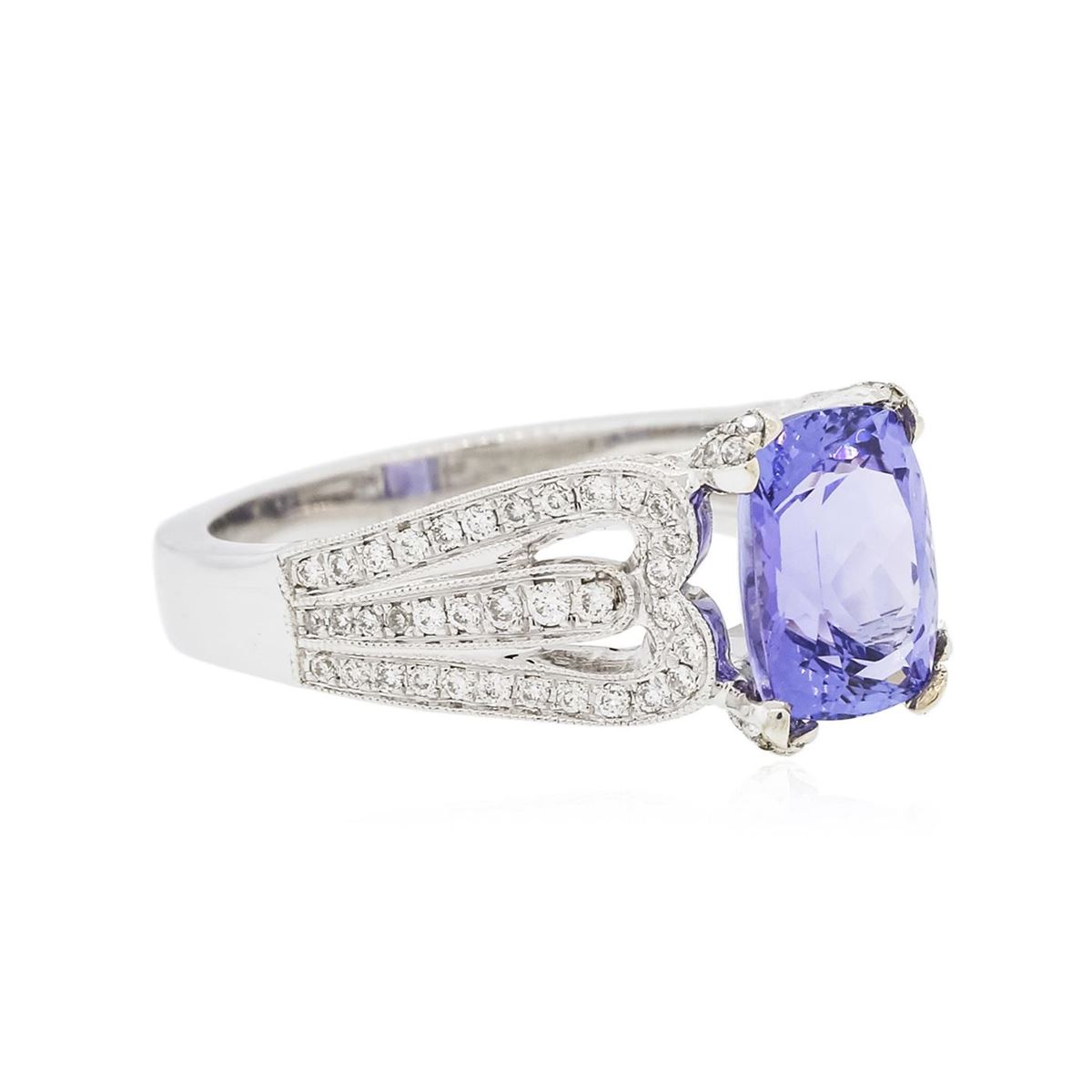 One electronically tested 18KT white gold ladies combination cast & assembled ring with a bright polish finish. Identified with markings of "750". Condition is new. Containing: One prong set rectangular cushion modified brilliant cut natural tanzanite, measuring 9.07 x 7.22 x 4.69mm, approximate weight of 2.42ct., clarity is eye clean, type I, medium light, very slightly grayish, violet color, (GIA V 4/3), cut is good. One Hundred Fifty-Two prong set round brilliant cut diamonds, measuring 1.30 - 1.10 x 0.72mm (depth est.) approximate total weight of 152 Stones = 0.61ct. Clarity: SI-1 to SI-2. Color: I - J, Cut is Good. Colored gemstones are presumed to have been subjected to commonly used enhancement processes. All diamonds and colored gemstones are graded in the mounting, unless otherwise stated. Total Weight of Colored Stones 2.42ct. Total Weight of Diamonds 0.61ct. Total Weight of Ring 7.10 grams. GGL Appraised at $8,565.00.