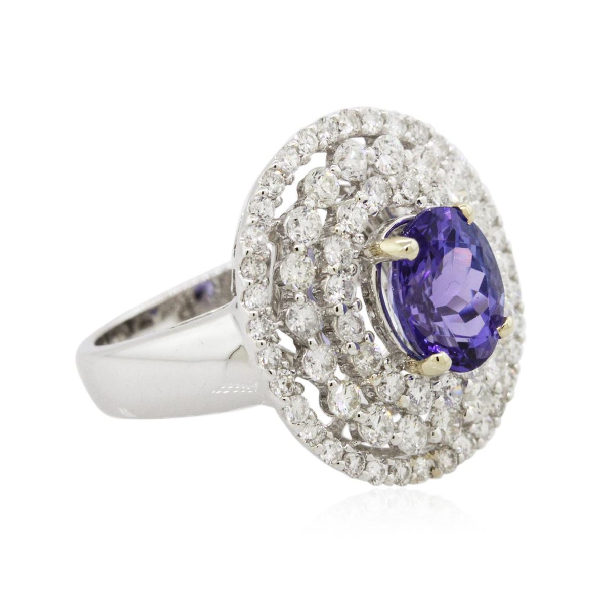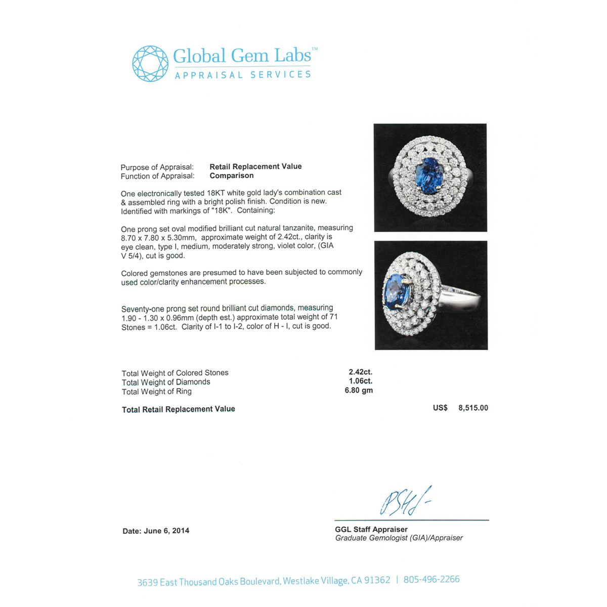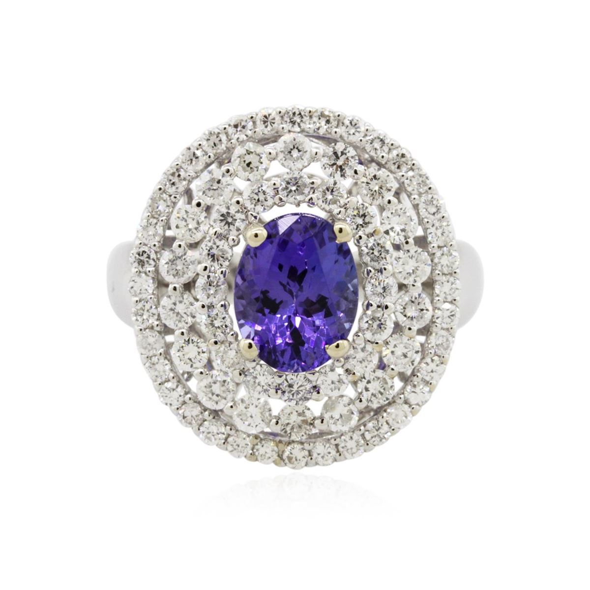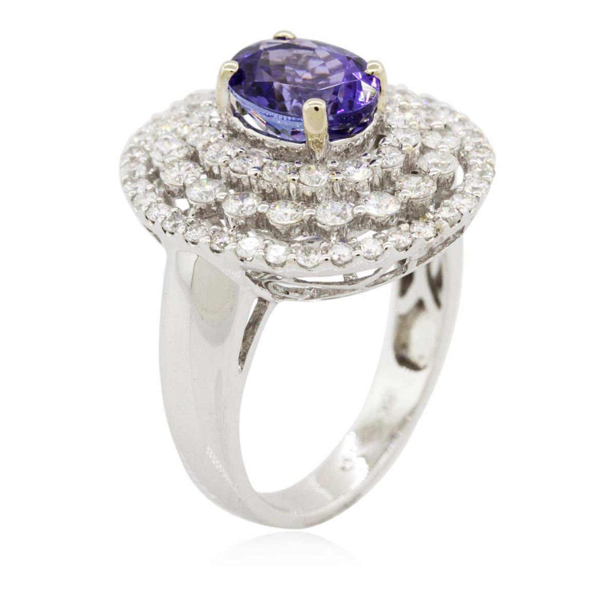 One electronically tested 18KT white gold Ladies combination cast & assembled ring with a bright polish finish. Condition is new. Identified with markings of "18K". Containing: One prong set oval modified brilliant cut natural tanzanite, measuring 8.70 x 7.80 x 5.30mm, approximate weight of 2.42ct., clarity is eye clean, type I, medium, moderately strong, violet color, (GIA V 5/4), cut is good. Colored gemstones are presumed to have been subjected to commonly used color/clarity enhancement processes. Seventy-One prong set round brilliant cut diamonds, measuring 1.90 - 1.30 x 0.96mm (depth est.) approximate. Total Weight of 71 Stones = 1.06ct. Clarity: I-1 to I-2. Color: H - I, Cut is Good. Total Weight of Colored Stones 2.42ct. Total Weight of Diamonds 1.06ct. Total Weight of Ring 6.80 grams. GGL Appraised at $8,515.00.