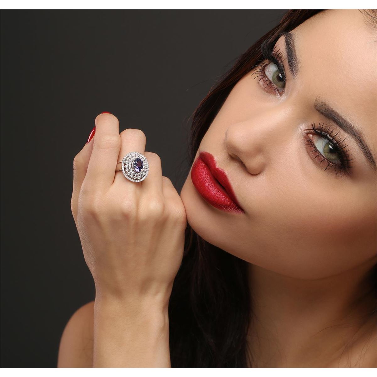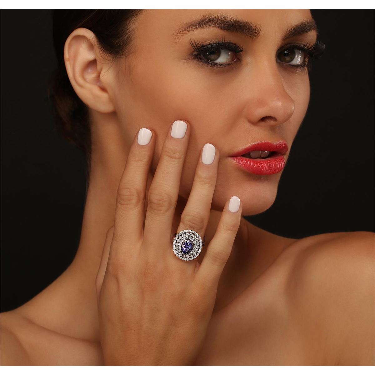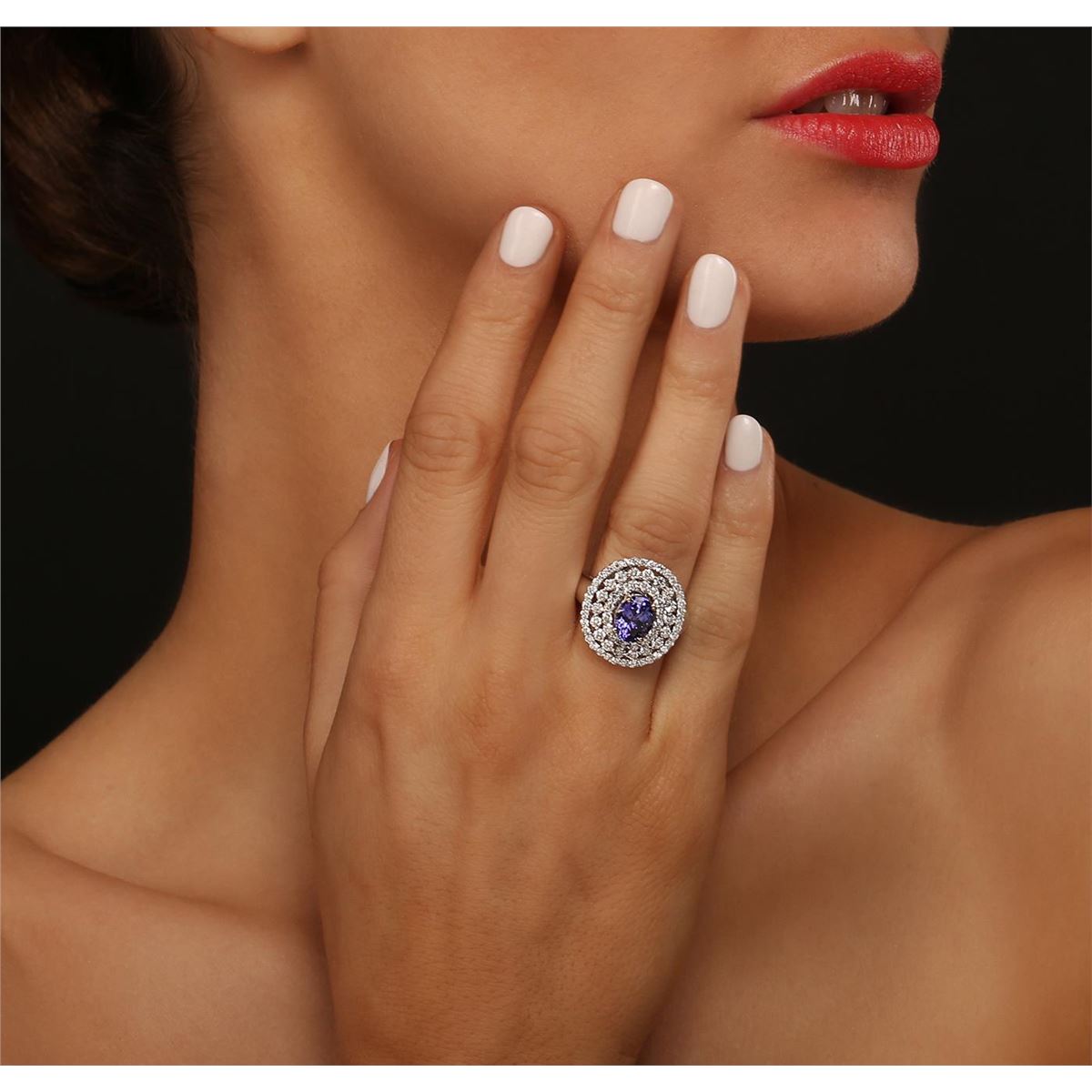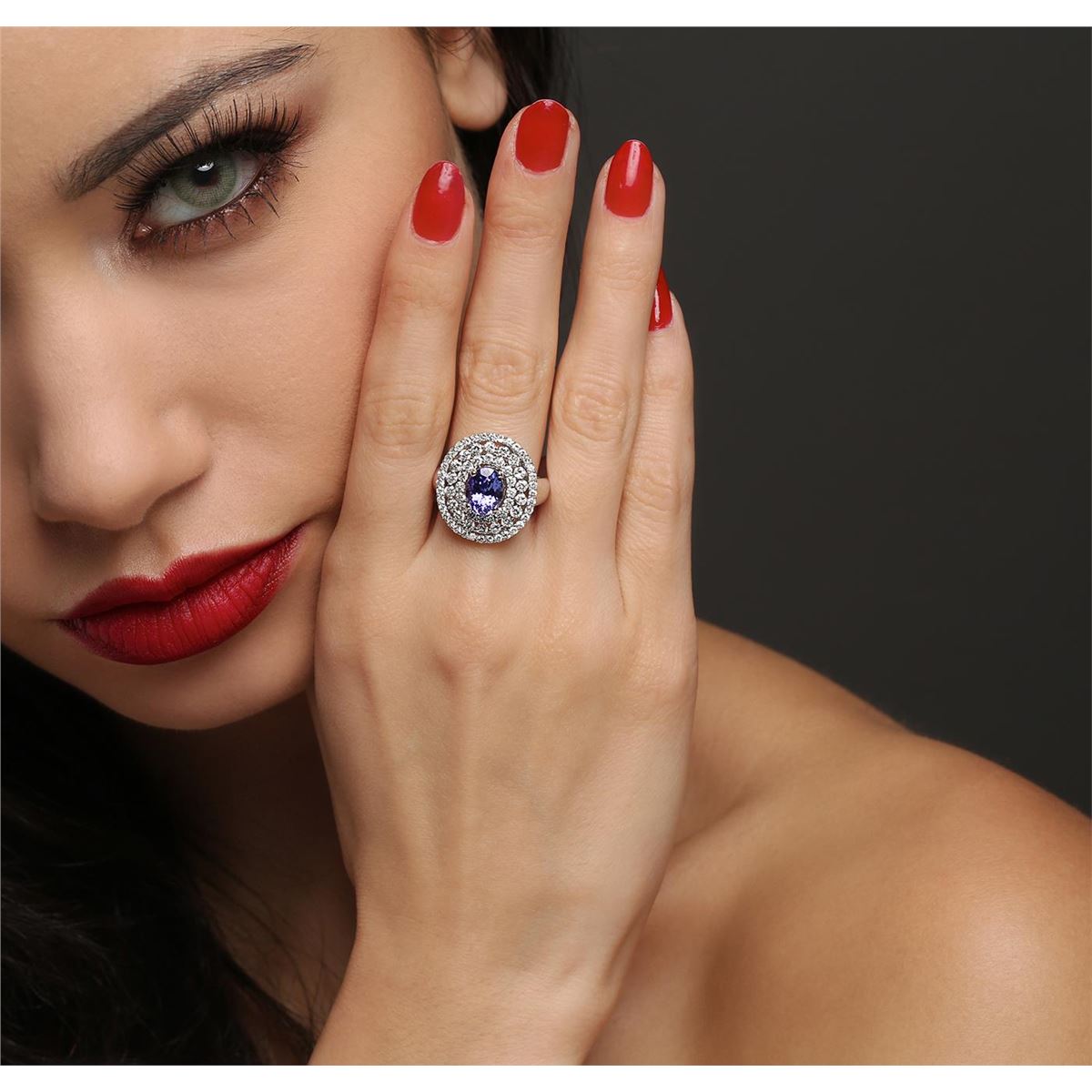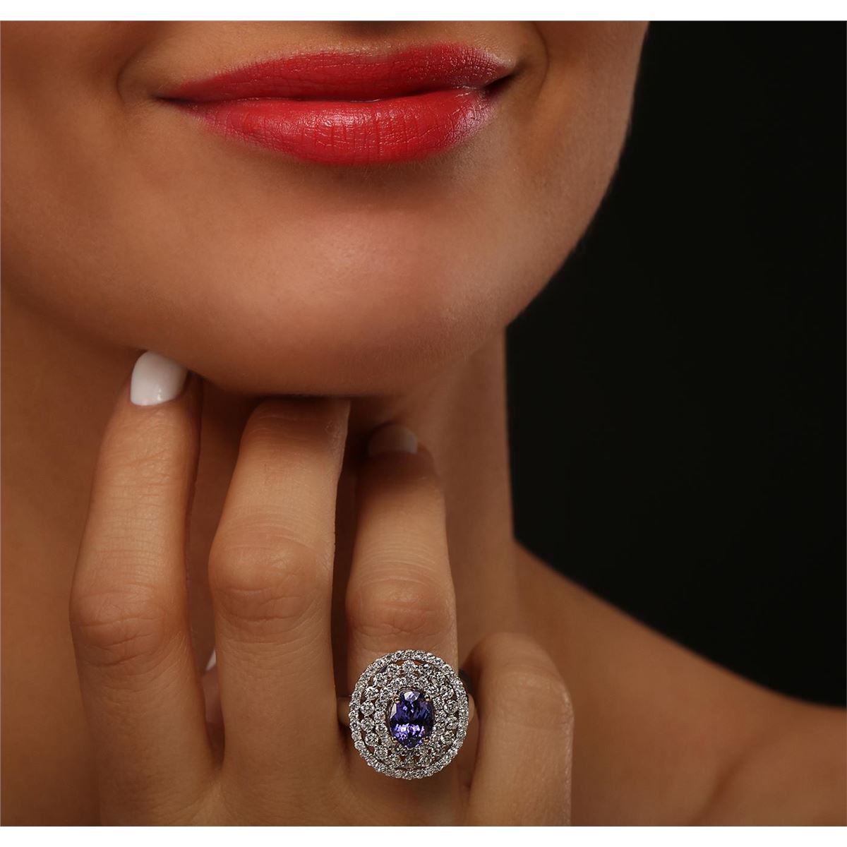 One electronically tested 18KT white gold Ladies combination cast & assembled ring with a bright polish finish. Condition is new. Identified with markings of "18K". Containing: One prong set oval modified brilliant cut natural tanzanite, measuring 8.70 x 7.80 x 5.30mm, approximate weight of 2.42ct., clarity is eye clean, type I, medium, moderately strong, violet color, (GIA V 5/4), cut is good. Colored gemstones are presumed to have been subjected to commonly used color/clarity enhancement processes. Seventy-One prong set round brilliant cut diamonds, measuring 1.90 - 1.30 x 0.96mm (depth est.) approximate. Total Weight of 71 Stones = 1.06ct. Clarity: I-1 to I-2. Color: H - I, Cut is Good. Total Weight of Colored Stones 2.42ct. Total Weight of Diamonds 1.06ct. Total Weight of Ring 6.80 grams. GGL Appraised at $8,515.00.