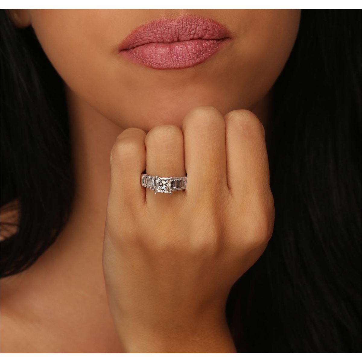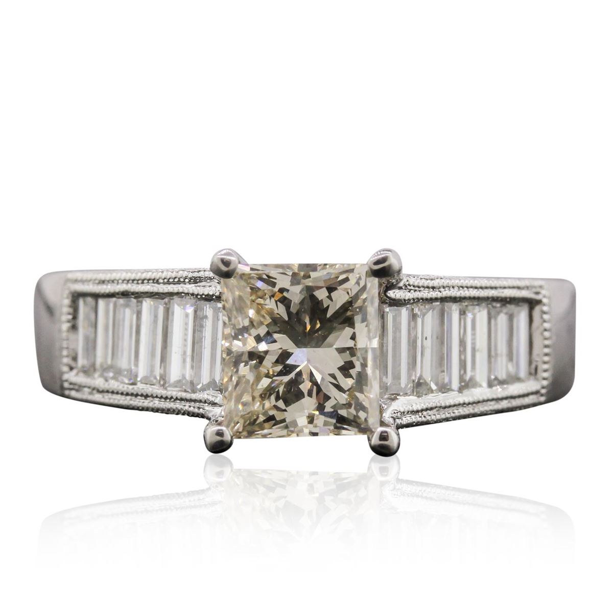 One electronically tested 18KT white gold ladies cast diamond unity ring. The featured diamond is supported by diamond set shoulders and completed by a two and one-half millimeter wide band. Bright polish finish with milgrain detailing throughout. Identified with markings of "18K 750". Condition is new, good workmanship. Containing: One prong set princess cut diamond, measuring 6.40 x 5.80 x 4.40mm (depth est.) approximate weight of 1.38ct with a strong blue fluorescence. Faint brown secondary color throughout. Graded in the setting. Clarity: SI-1. Color: L Depth 75.9%. Table 70.7%. Twelve channel set baguette cut diamonds, measuring from 3.30 x 1.20 x 1.02mm (depth est.) to 3.80 x 1.50 x 1.28mm (depth est.) approximate. Total Weight of 12 Stones = 0.74ct. Graded in the setting. Clarity: VVS-2 to VS-2. Color: G - I Thirty-Four bead set round brilliant cut diamonds, measuring 1.30 - 1.00 x 0.69mm (depth est.) approximate. Total Weight of 34 Stones = 0.31ct. Graded in the setting. Clarity: VS-2 to SI-2. Color: G - I. Total Weight of Diamonds 2.43ct. Total Weight of Ring 7.50 grams. AIG Appraised at $20,500.00.