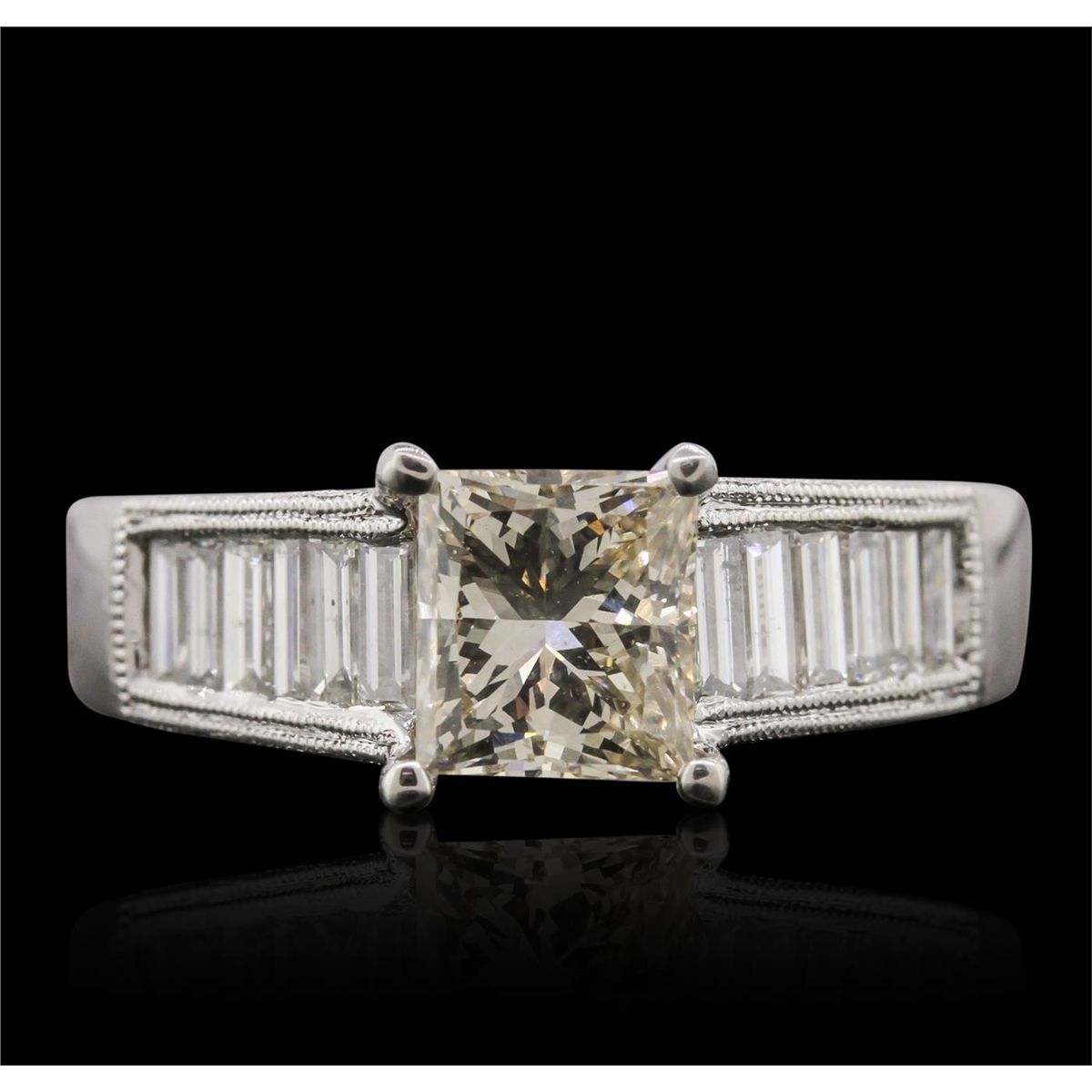 One electronically tested 18KT white gold ladies cast diamond unity ring. The featured diamond is supported by diamond set shoulders and completed by a two and one-half millimeter wide band. Bright polish finish with milgrain detailing throughout. Identified with markings of "18K 750". Condition is new, good workmanship. Containing: One prong set princess cut diamond, measuring 6.40 x 5.80 x 4.40mm (depth est.) approximate weight of 1.38ct with a strong blue fluorescence. Faint brown secondary color throughout. Graded in the setting. Clarity: SI-1. Color: L Depth 75.9%. Table 70.7%. Twelve channel set baguette cut diamonds, measuring from 3.30 x 1.20 x 1.02mm (depth est.) to 3.80 x 1.50 x 1.28mm (depth est.) approximate. Total Weight of 12 Stones = 0.74ct. Graded in the setting. Clarity: VVS-2 to VS-2. Color: G - I Thirty-Four bead set round brilliant cut diamonds, measuring 1.30 - 1.00 x 0.69mm (depth est.) approximate. Total Weight of 34 Stones = 0.31ct. Graded in the setting. Clarity: VS-2 to SI-2. Color: G - I. Total Weight of Diamonds 2.43ct. Total Weight of Ring 7.50 grams. AIG Appraised at $20,500.00.