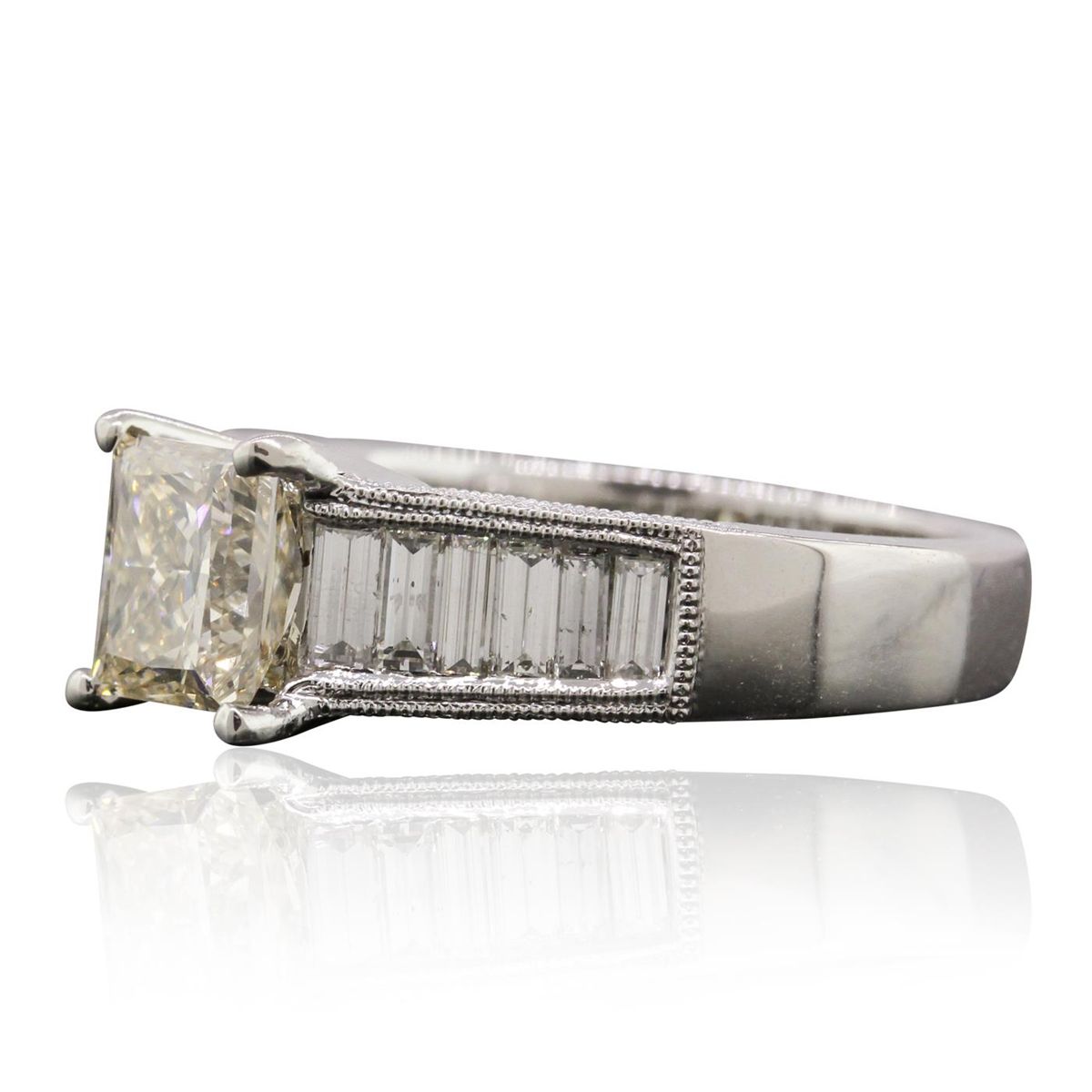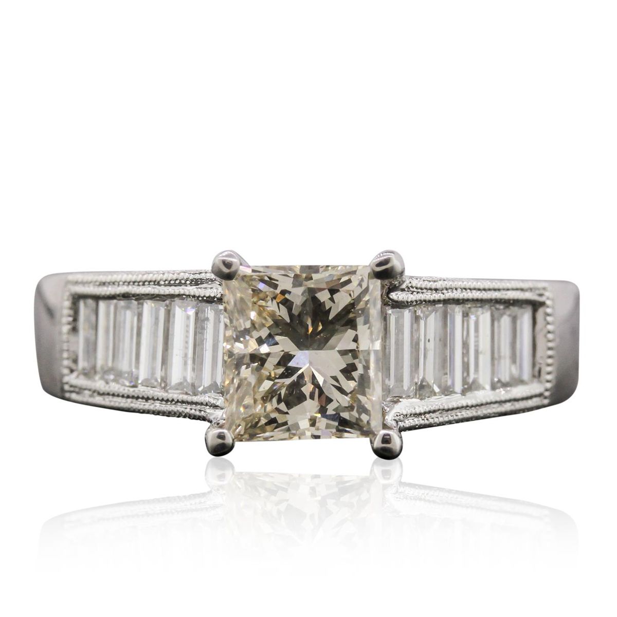One electronically tested 18KT white gold ladies cast diamond unity ring. The featured diamond is supported by diamond set shoulders and completed by a two and one-half millimeter wide band. Bright polish finish with milgrain detailing throughout. Identified with markings of "18K 750". Condition is new, good workmanship. Containing: One prong set princess cut diamond, measuring 6.40 x 5.80 x 4.40mm (depth est.) approximate weight of 1.38ct with a strong blue fluorescence. Faint brown secondary color throughout. Graded in the setting. Clarity: SI-1. Color: L Depth 75.9%. Table 70.7%. Twelve channel set baguette cut diamonds, measuring from 3.30 x 1.20 x 1.02mm (depth est.) to 3.80 x 1.50 x 1.28mm (depth est.) approximate. Total Weight of 12 Stones = 0.74ct. Graded in the setting. Clarity: VVS-2 to VS-2. Color: G - I Thirty-Four bead set round brilliant cut diamonds, measuring 1.30 - 1.00 x 0.69mm (depth est.) approximate. Total Weight of 34 Stones = 0.31ct. Graded in the setting. Clarity: VS-2 to SI-2. Color: G - I. Total Weight of Diamonds 2.43ct. Total Weight of Ring 7.50 grams. AIG Appraised at $20,500.00.