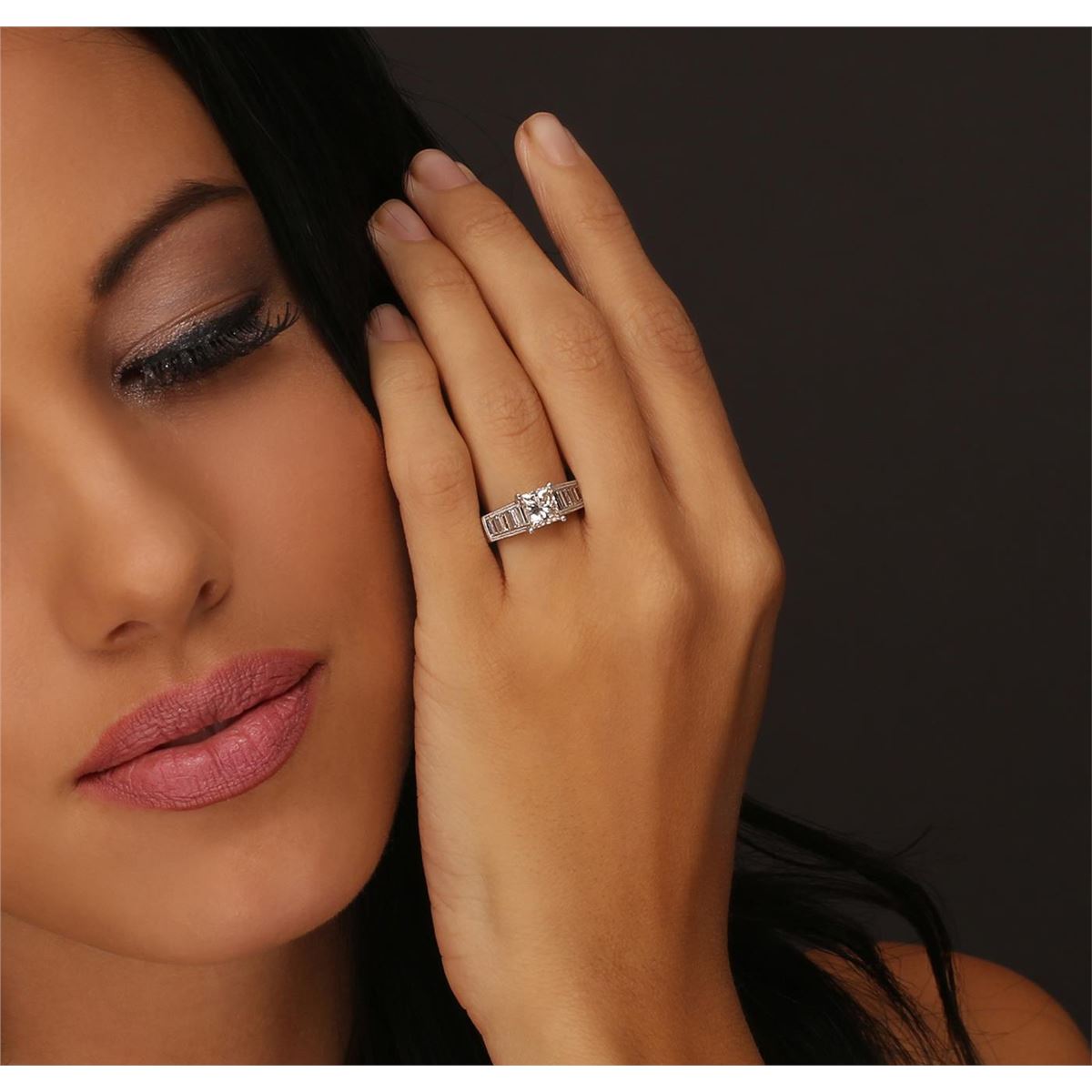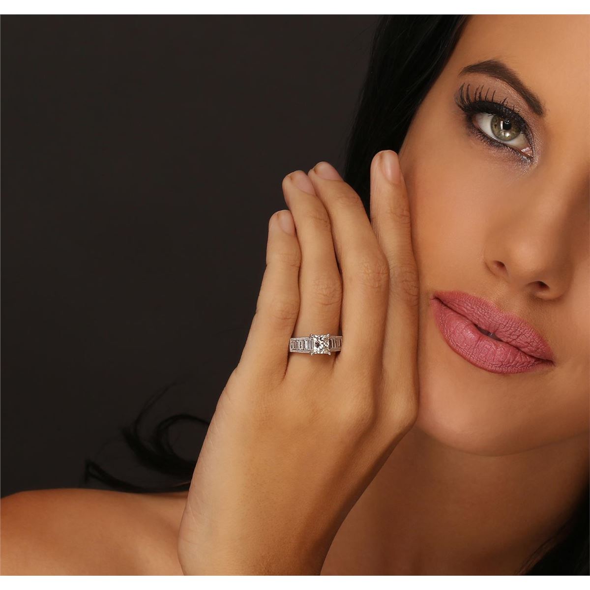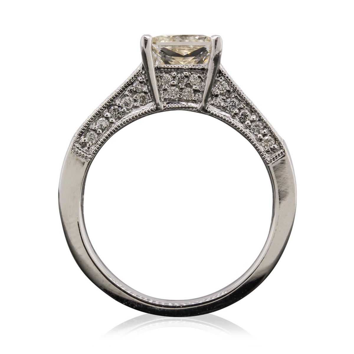 One electronically tested 18KT white gold ladies cast diamond unity ring. The featured diamond is supported by diamond set shoulders and completed by a two and one-half millimeter wide band. Bright polish finish with milgrain detailing throughout. Identified with markings of "18K 750". Condition is new, good workmanship. Containing: One prong set princess cut diamond, measuring 6.40 x 5.80 x 4.40mm (depth est.) approximate weight of 1.38ct with a strong blue fluorescence. Faint brown secondary color throughout. Graded in the setting. Clarity: SI-1. Color: L Depth 75.9%. Table 70.7%. Twelve channel set baguette cut diamonds, measuring from 3.30 x 1.20 x 1.02mm (depth est.) to 3.80 x 1.50 x 1.28mm (depth est.) approximate. Total Weight of 12 Stones = 0.74ct. Graded in the setting. Clarity: VVS-2 to VS-2. Color: G - I Thirty-Four bead set round brilliant cut diamonds, measuring 1.30 - 1.00 x 0.69mm (depth est.) approximate. Total Weight of 34 Stones = 0.31ct. Graded in the setting. Clarity: VS-2 to SI-2. Color: G - I. Total Weight of Diamonds 2.43ct. Total Weight of Ring 7.50 grams. AIG Appraised at $20,500.00.