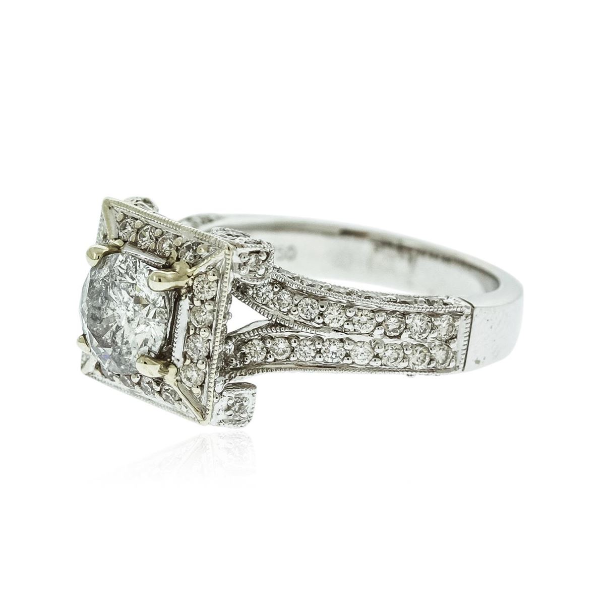 One electronically tested 18KT white gold ladies cast diamond unity ring. The featured diamond is set within a stylized diamond bezel supported by an elaborate diamond set under gallery and shoulders, completed by a three millimeter wide band. Bright polish finish with milgrain detailing throughout. Identified with markings of "18K 750". Condition is good. Containing: One prong set round brilliant cut diamond, measuring 6.60 - 6.55 x 4.00mm (depth est.) approximate weight of 1.15ct. Graded in the setting. Clarity: I-1 . Color: 60.9%. Table 57.8%. One Hundred Four bead & bezel set round brilliant cut diamonds, measuring 1.60 - 1.30 x 0.87mm (depth est.) approximate total weight of 104 Stones = 1.30ct. Graded in the setting. Clarity: VS-1 to SI-1. Color: H - J. Total Weight of Diamonds 2.45ct. Total Weight of Unity Ring 7.81 grams. AIG Appraised at $20,865.00.