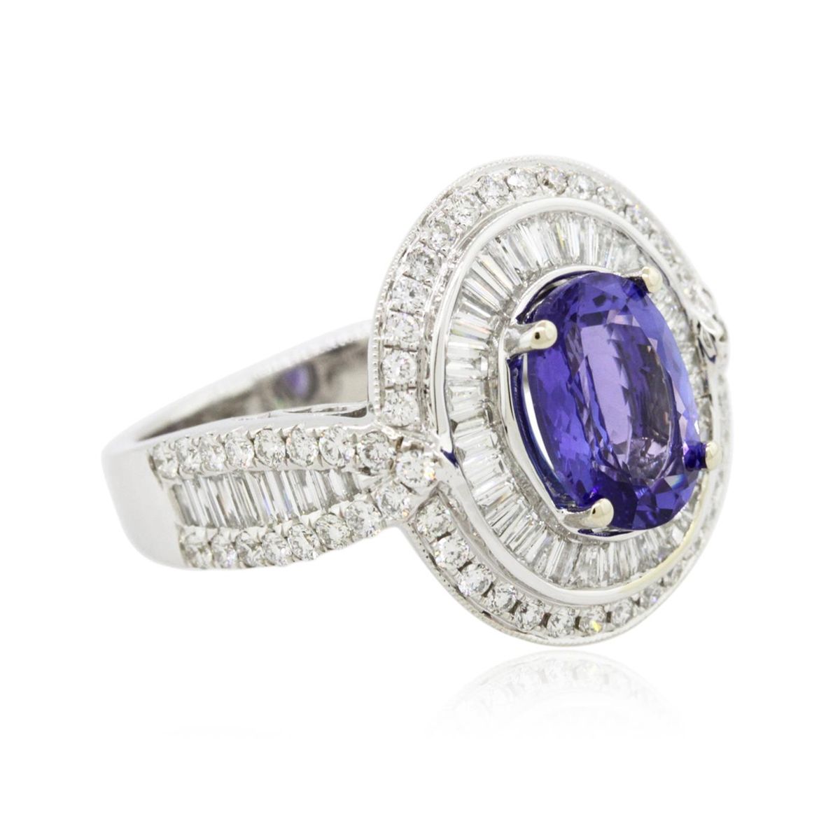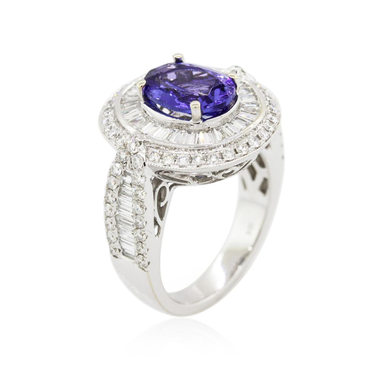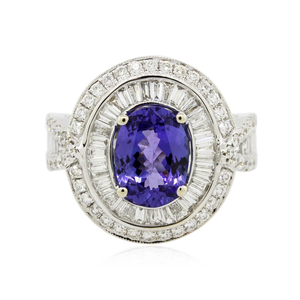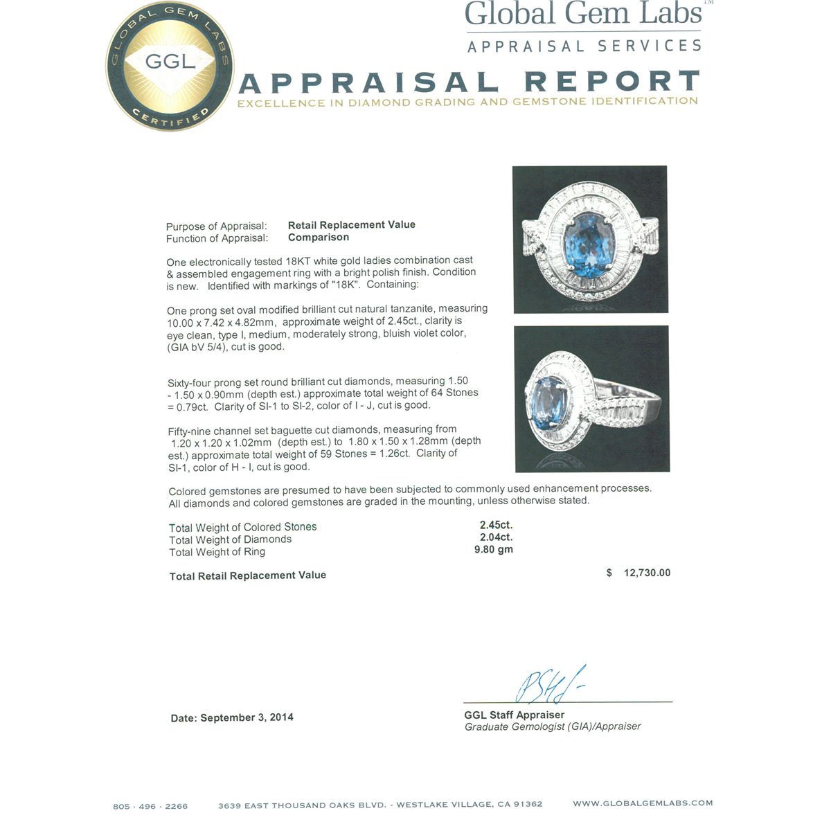 One electronically tested 18KT white gold ladies combination cast & assembled engagement ring with a bright polish finish. Identified with markings of "18K". Condition is new. Containing: One prong set oval modified brilliant cut natural tanzanite, measuring 10.00 x 7.42 x 4.82mm, approximate weight of 2.45ct., clarity is eye clean, type I, medium, moderately strong, bluish violet color, (GIA bV 5/4), cut is good. Sixty-Four prong set round brilliant cut diamonds, measuring 1.50 - 1.50 x 0.90mm (depth est.) approximate total weight of 64 Stones = 0.79ct. Clarity: SI-1 to SI-2. Color: I - J, Cut is Good. Fifty-Nine channel set baguette cut diamonds, measuring from 1.20 x 1.20 x 1.02mm (depth est.) to 1.80 x 1.50 x 1.28mm (depth est.) approximate total weight of 59 Stones = 1.26ct. Clarity: SI-1. Color: H - I, Cut is Good. Colored gemstones are presumed to have been subjected to commonly used enhancement processes. All diamonds and colored gemstones are graded in the mounting, unless otherwise stated. Total Weight of Colored Stones 2.45ct. Total Weight of Diamonds 2.04ct. Total Weight of Ring 9.80 grams. GGL Appraised at $12,730.00.