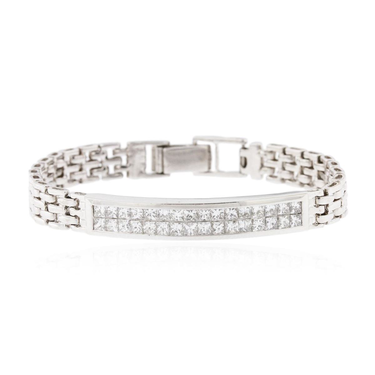 One electronically tested 18KT white gold ladies cast & assembled diamond bracelet with a bright polish finish. Condition is new, good workmanship. Six inch length bracelet features a rigid diamond set section supported by a designer watch style bracelet terminating in a fold over locking clasp. Identified with markings of "18K". Containing: Thirty-Two invisible set princess cut diamonds, measuring 2.30 x 2.30 x 1.73mm (depth est.) approximate. Total Weight of 32 Stones = 2.50ct. Measurements are an average for the group. Graded in the setting. Clarity: VS-1 to SI-1. Color: G - I. Total Weight of Diamonds 2.50ct. Total Weight of Bracelet 21.30 grams. AIG Appraised at $12,500.00.
