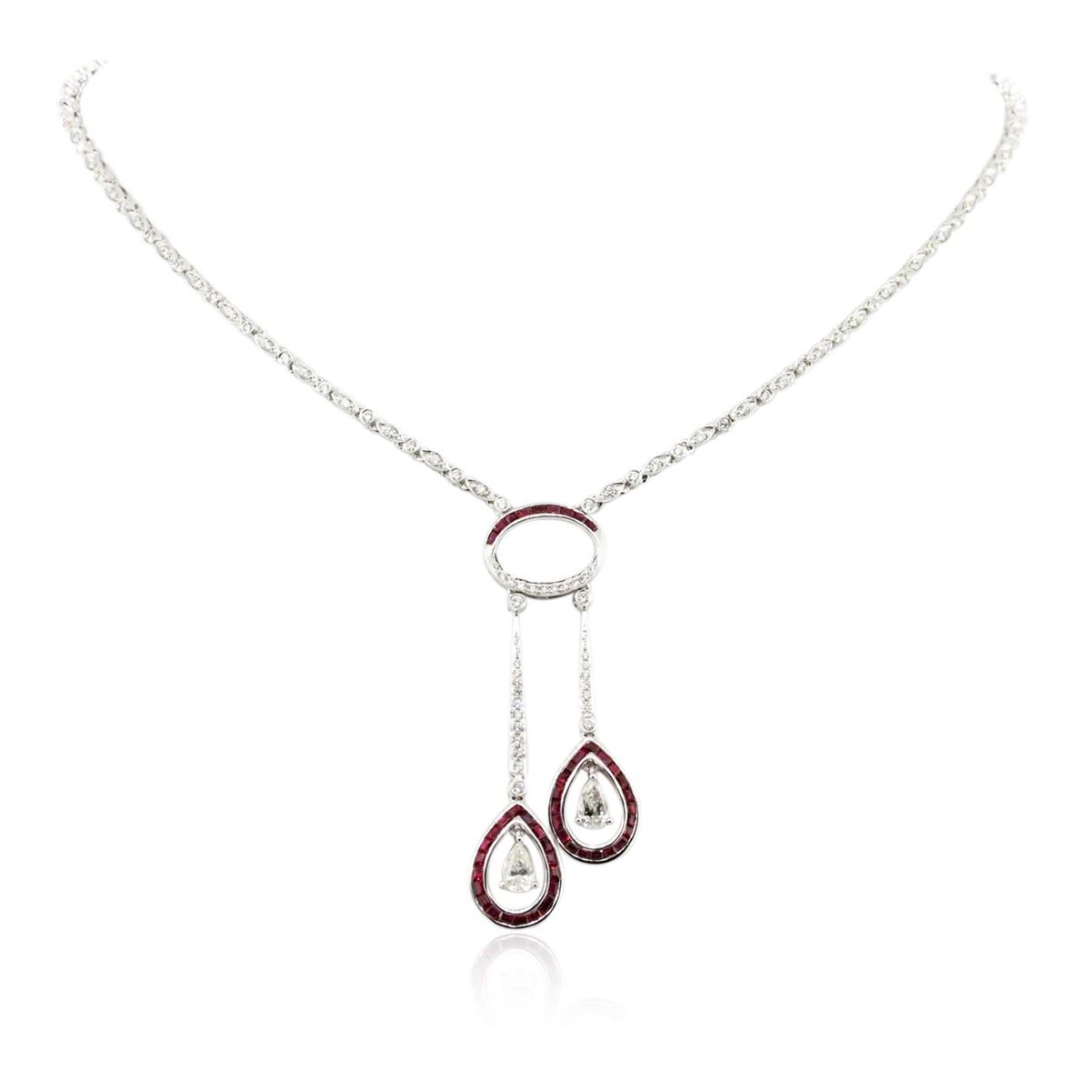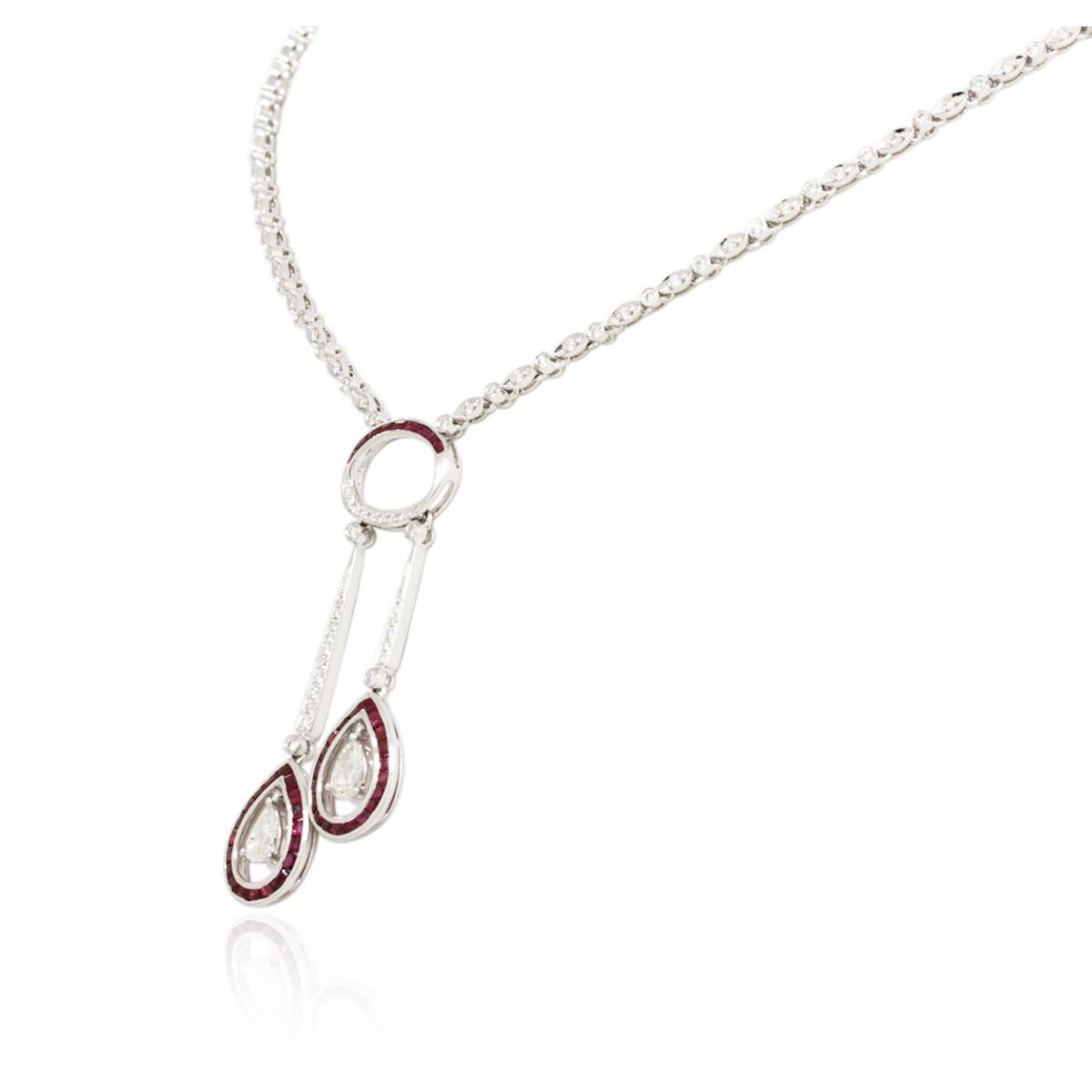 One electronically tested 18KT white gold ladies cast & assembled diamond and ruby necklace with a bright polish finish. Sixteen inch length necklace features a stylized diamond and ruby open oval pendant accented by two diamond and ruby drops supported by a flexible diamond ribbon, terminating in a concealed clasp with safety bar. Identified with markings of "18K".The necklace is reminiscent of the jewelry designs from the Art Deco Period. The Paris Exposition of Decorative Arts and Modern Manufacturers in 1925 gave the movement its name. The Art Deco Period is characterized with jewelry designs composed of bold geometric designs, & cubism. Condition is new, good workmanship. Containing: Two prong set pear shaped cut diamonds, measuring 6.50 x 4.00 x 2.60mm (depth est.) approximate total weight of 2 Stones = 0.89ct. Graded in the setting. Clarity: SI-1 to SI-2. Color: G - H One Hundred Forty-Six prong and bezel set round brilliant cut diamonds, measuring 1.70 - 1.40 x 0.93mm (depth est.) approximate total weight of 146 Stones = 2.08ct. Graded in the setting. Clarity: VVS-1 to VS-1. Color: F - H Forty-eight channel set baguette step cut natural rubies, measuring 2.50 x 2.10 x 0.90mm, approximate total weight of 2.50ct., clarity is slightly included, type II, dark, very slightly brownish, slightly purplish red color, (GIA slpR 7/3), cut is good. Transmitting light with a minimum of distortion, transparent. Naturally occurring internal & external characteristics are present. Color grade is an average for the group. Measurements & the color grade are an average for the group. Graded in the setting. Total Weight of Colored Stones 2.50ct. Total Weight of Diamonds 2.97ct. Total Weight of Necklace 21.40 grams. AIG Appraised at $20,960.00.