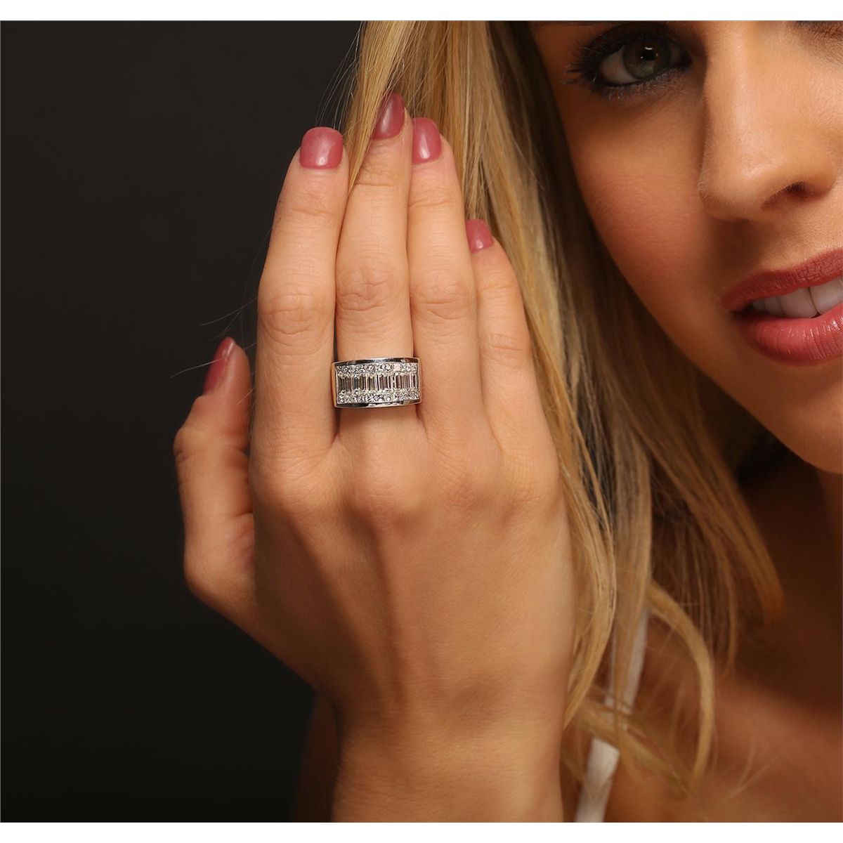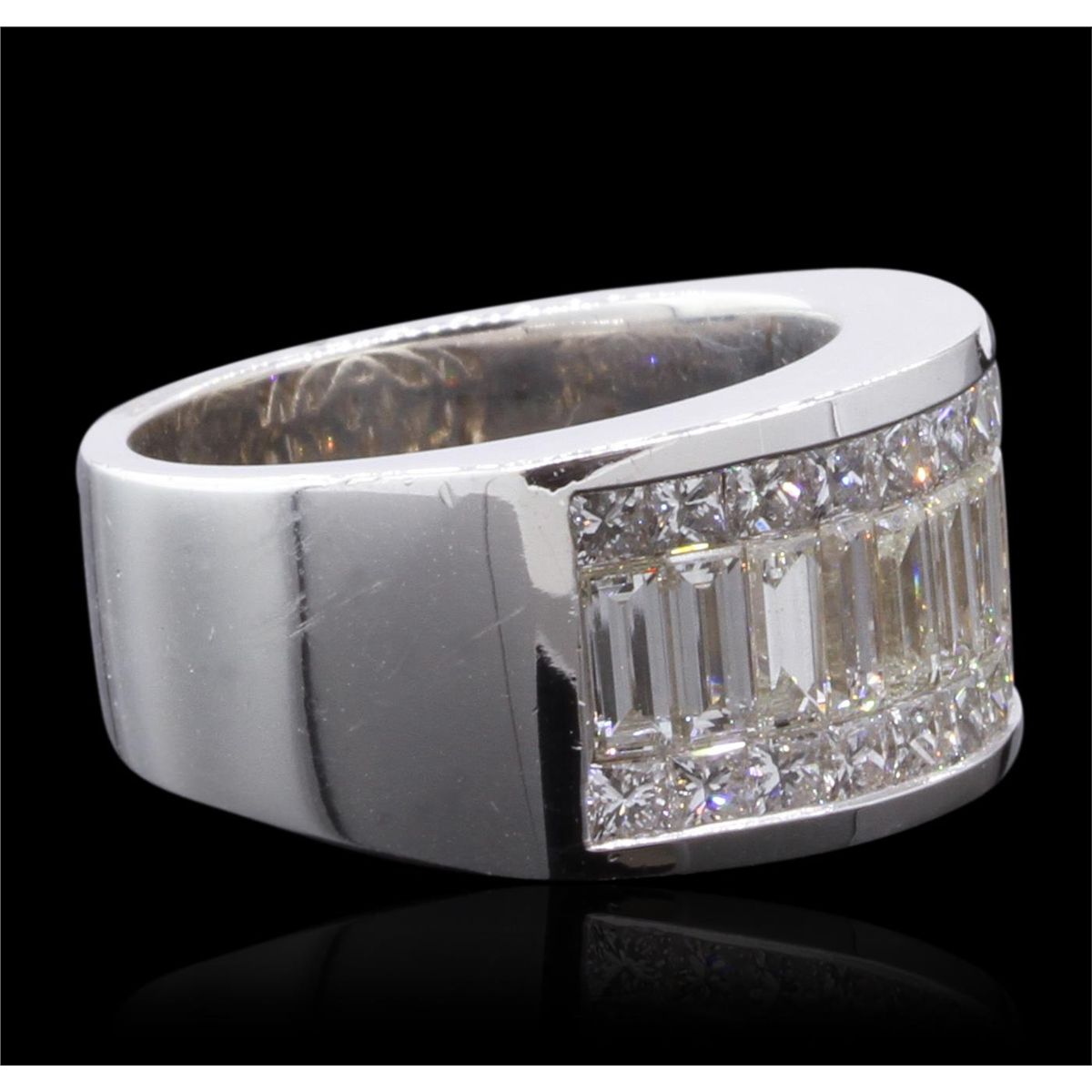 One electronically tested 18KT white gold Ladies cast fancy ring with a bright polish finish. Identified with markings of "18K". Condition is new. Containing: Eleven channel set baguette cut diamonds, measuring 4.50 x 1.70 x 1.45mm (depth est.) approximate total weight of 11 Stones = 1.48ct. Clarity of VVS-2 to VS-1, Color of I - J, Cut is Very Good. Twenty-Two channel set princess cut diamonds, measuring 1.90 x 1.90 x 1.43mm (depth est.) approximate total weight of 22 Stones = 1.02ct. Clarity of VS-1 to VS-2, Color of H - J, Cut is Very Good. Total Weight of Diamonds 2.50ct. Total Weight of Ring 14.80gm. GGL Appraised at $14,855.00.