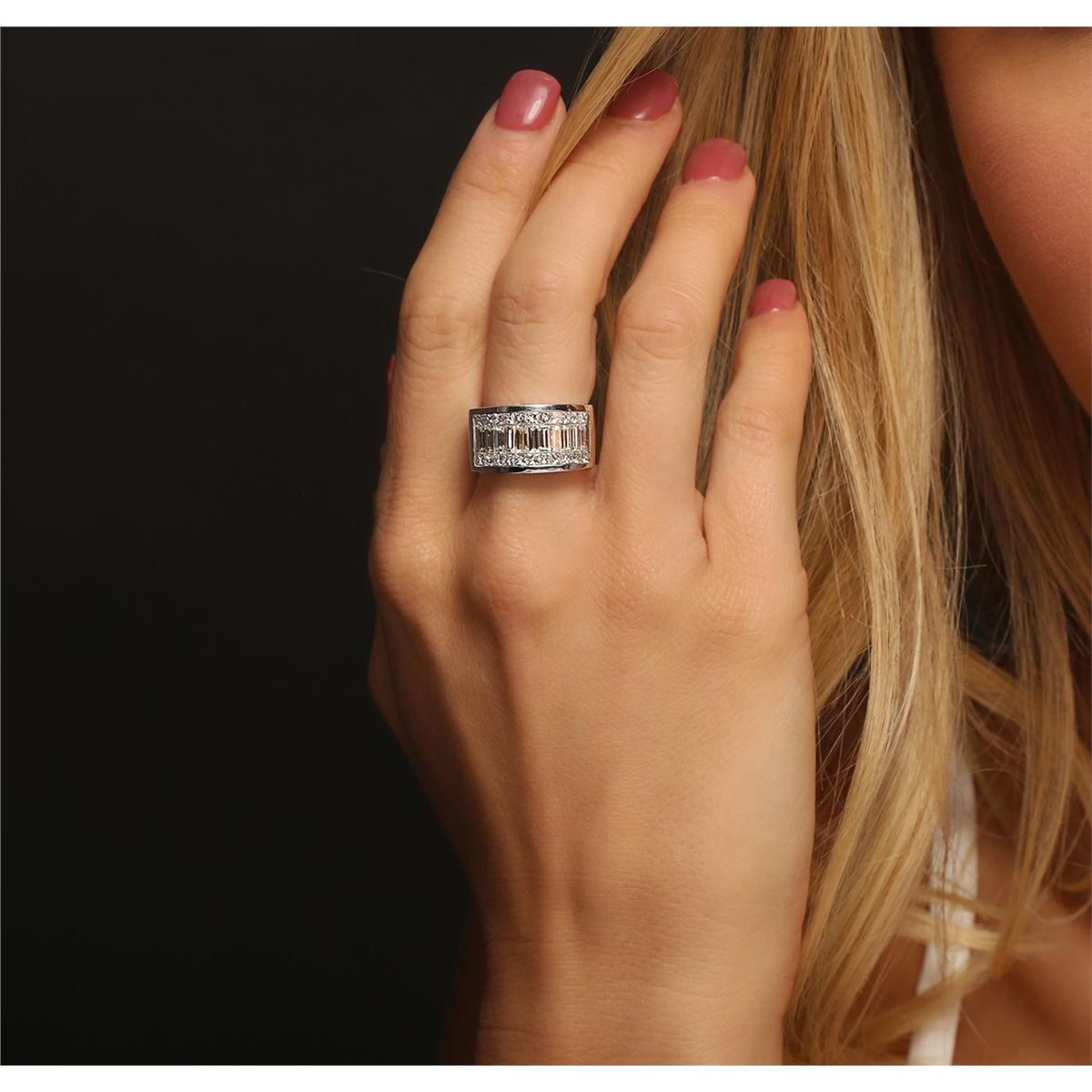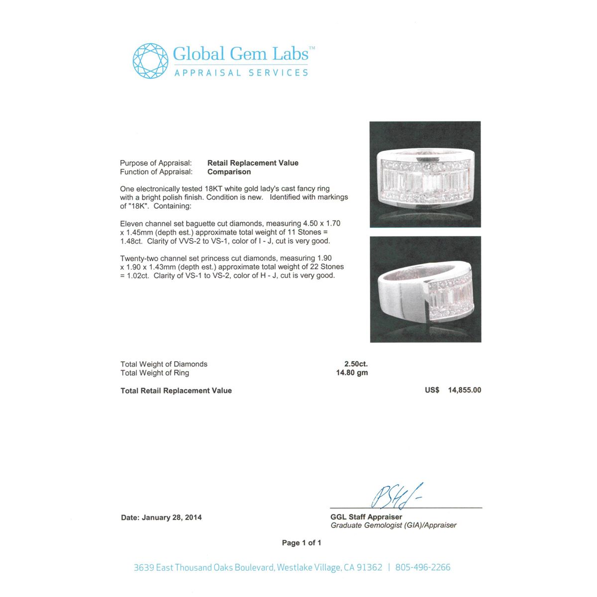 One electronically tested 18KT white gold Ladies cast fancy ring with a bright polish finish. Identified with markings of "18K". Condition is new. Containing: Eleven channel set baguette cut diamonds, measuring 4.50 x 1.70 x 1.45mm (depth est.) approximate total weight of 11 Stones = 1.48ct. Clarity of VVS-2 to VS-1, Color of I - J, Cut is Very Good. Twenty-Two channel set princess cut diamonds, measuring 1.90 x 1.90 x 1.43mm (depth est.) approximate total weight of 22 Stones = 1.02ct. Clarity of VS-1 to VS-2, Color of H - J, Cut is Very Good. Total Weight of Diamonds 2.50ct. Total Weight of Ring 14.80gm. GGL Appraised at $14,855.00.