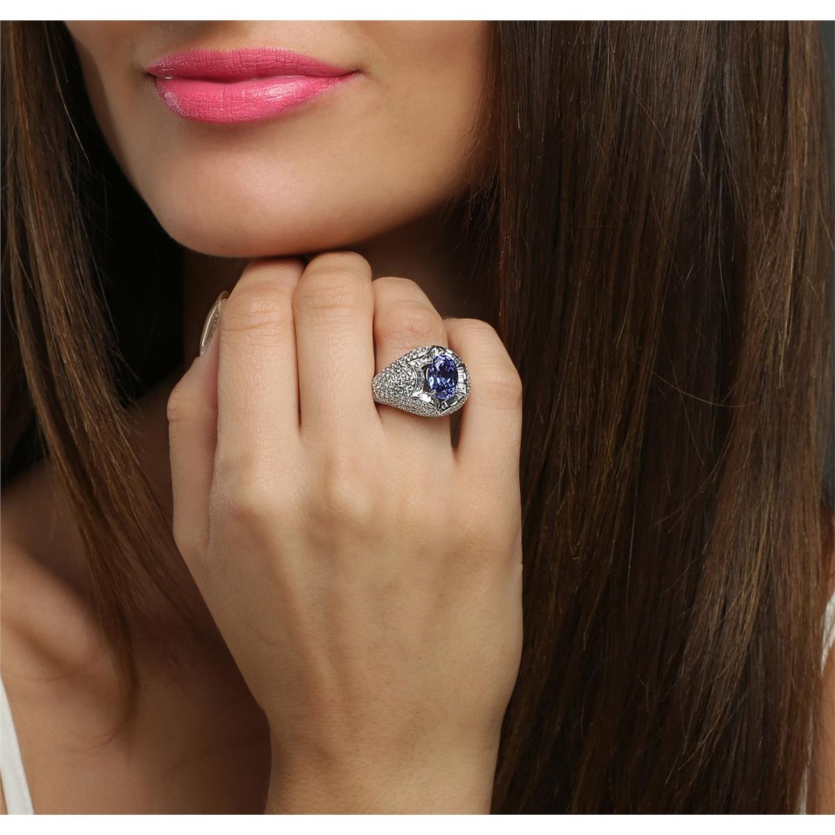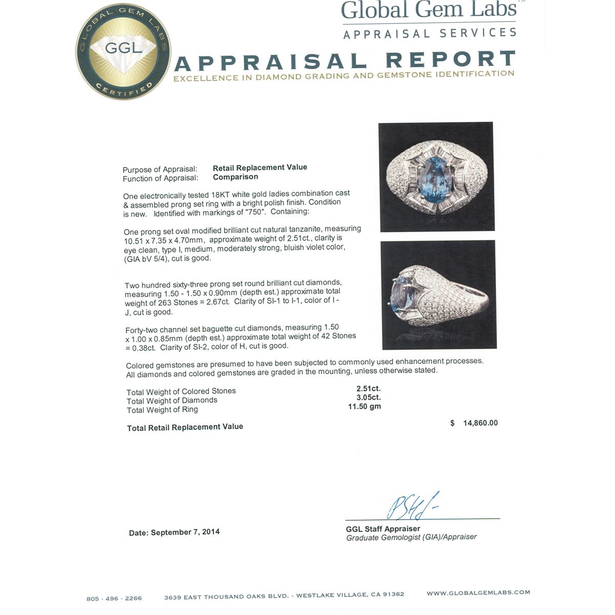 One electronically tested 18KT white gold ladies combination cast & assembled prong set ring with a bright polish finish. Identified with markings of "750". Condition is new. Containing: One prong set oval modified brilliant cut natural tanzanite, measuring 10.51 x 7.35 x 4.70mm, approximate weight of 2.51ct., clarity is eye clean, type I, medium, moderately strong, bluish violet color, (GIA bV 5/4), cut is good. Two Hundred Sixty-Three prong set round brilliant cut diamonds, measuring 1.50 - 1.50 x 0.90mm (depth est.) approximate total weight of 263 Stones = 2.67ct. Clarity: SI-1 to I-1. Color: I - J, Cut is Good. Forty-Two channel set baguette cut diamonds, measuring 1.50 x 1.00 x 0.85mm (depth est.) approximate total weight of 42 Stones = 0.38ct. Clarity: SI-2. Color: H, Cut is Good. Colored gemstones are presumed to have been subjected to commonly used enhancement processes. All diamonds and colored gemstones are graded in the mounting, unless otherwise stated. Total Weight of Colored Stones 2.51ct. Total Weight of Diamonds 3.05ct. Total Weight of Ring 11.50 grams. GGL Appraised at $14,860.00.