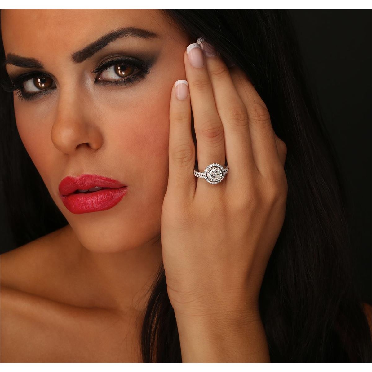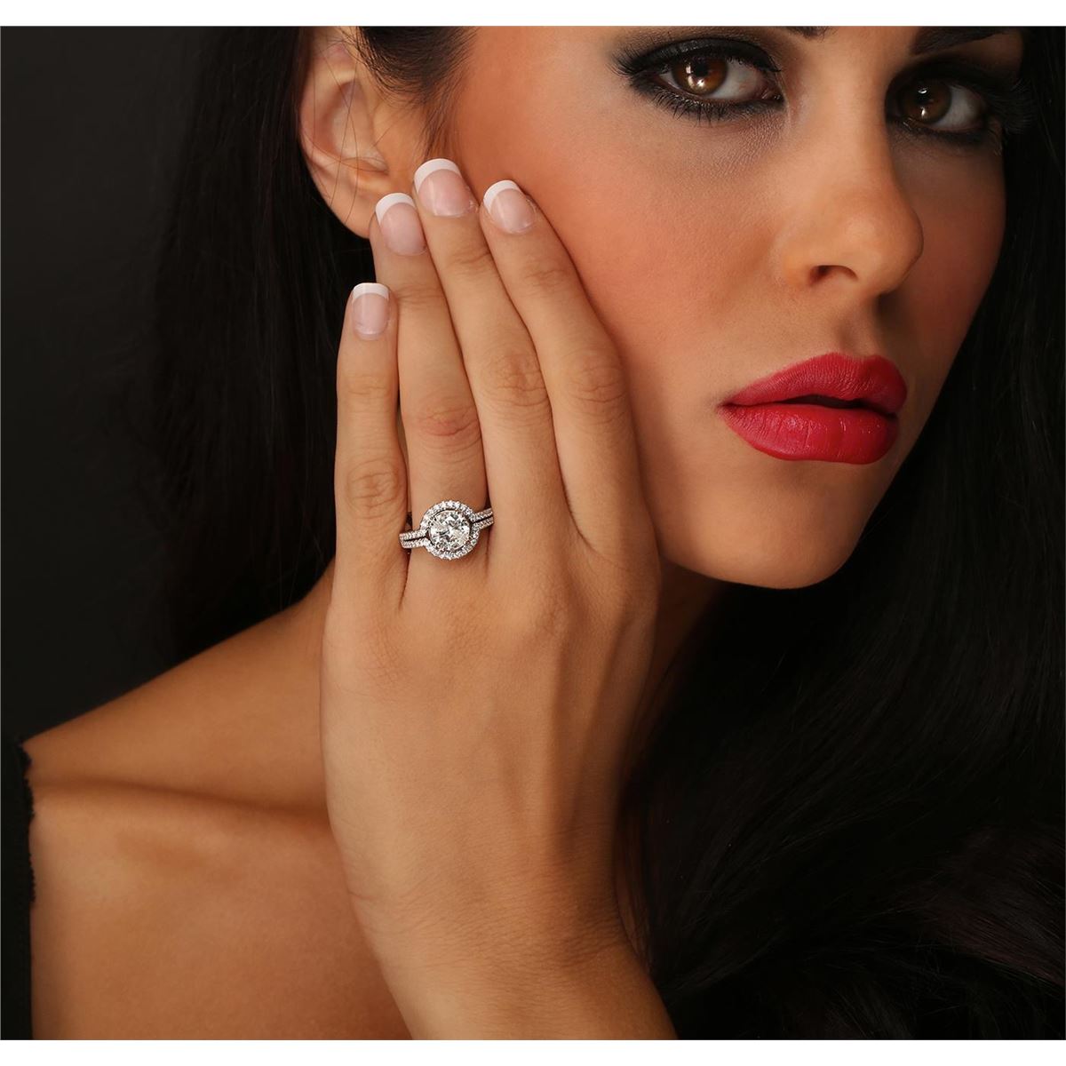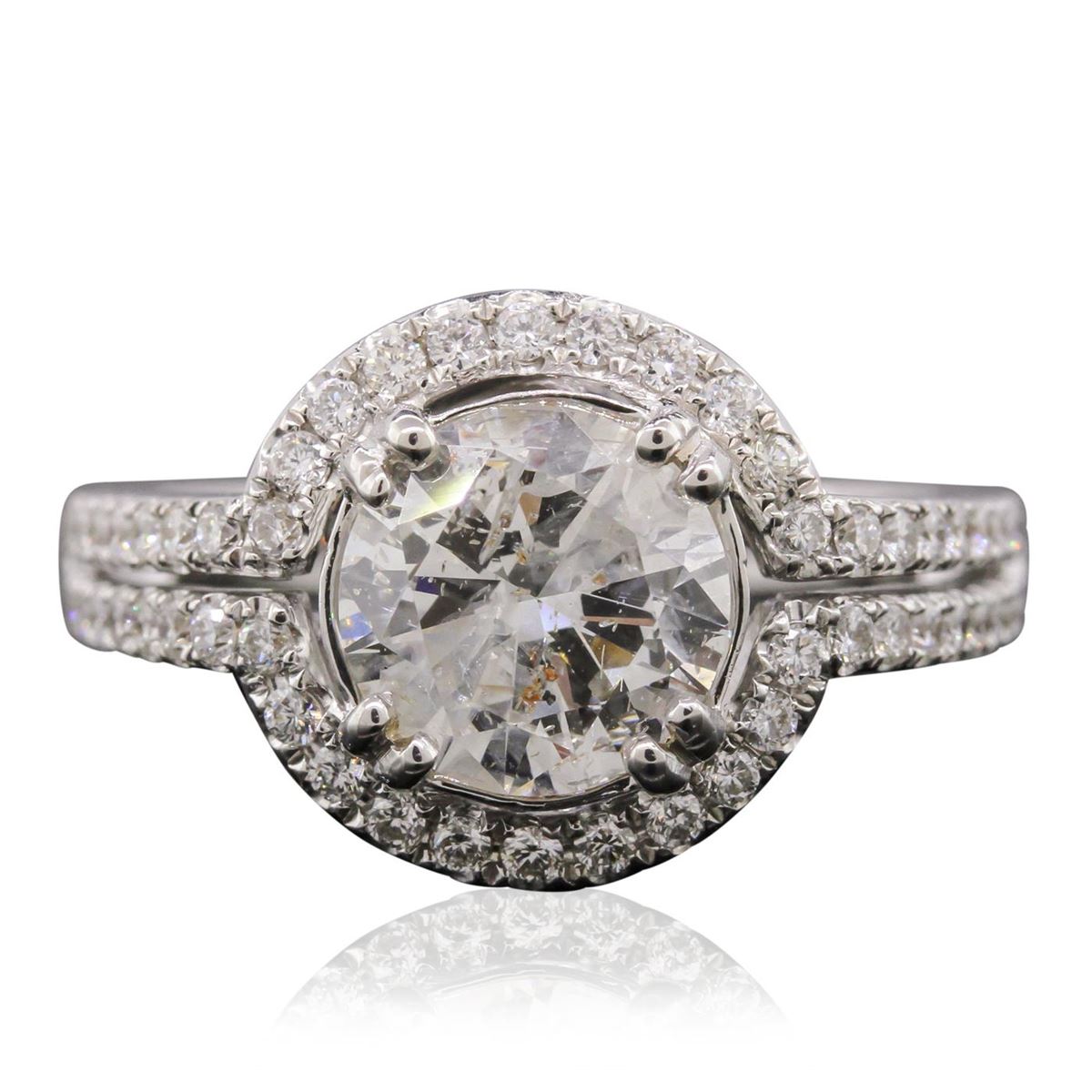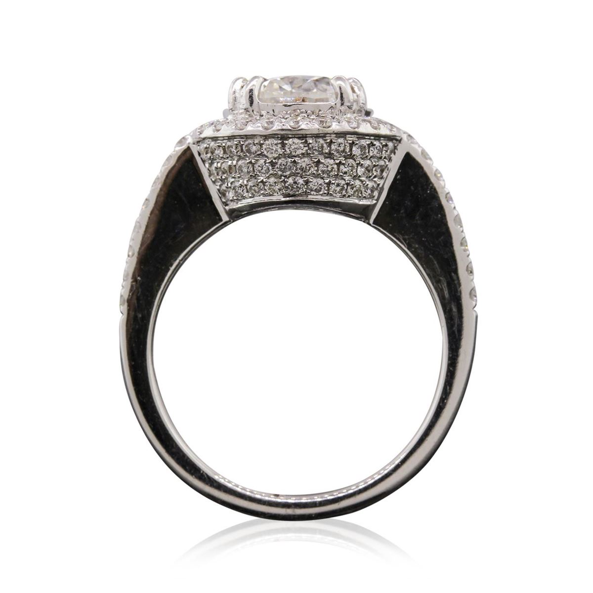 One electronically tested 18KT white gold Ladies combination cast & assembled engagement ring with a bright polish finish. Condition is new. Identified with markings of "18K". Containing: One prong set round brilliant cut diamond, measuring 8.50 - 8.20 x 4.80mm (depth est.) approximate weight of 2.04ct. Clarity: I-2. Color: I, Cut is Good. Sixty prong set round brilliant cut diamonds, measuring 1.30 - 1.30 x 0.78mm (depth est.) approximate. Total Weight of 60 Stones = 0.48ct. Clarity: I-1 to I-2. Color: I - J, Cut is Good. Total Weight of Diamonds 2.52ct. Total Weight of Engagement Ring 8.00 grams. GGL Appraised at $25,520.00.
