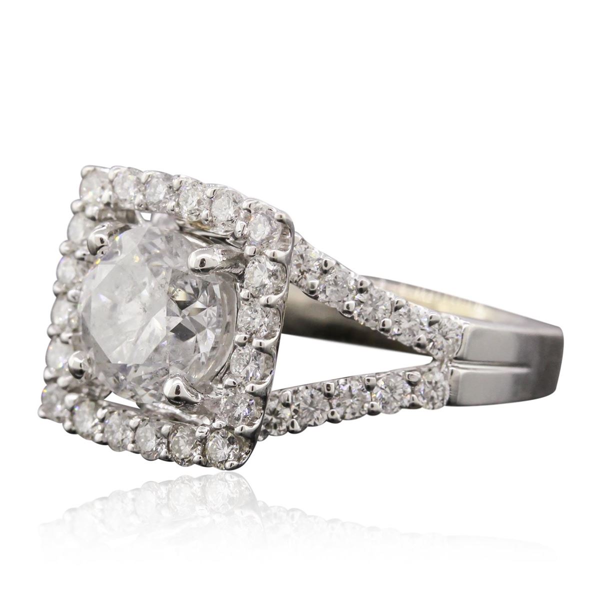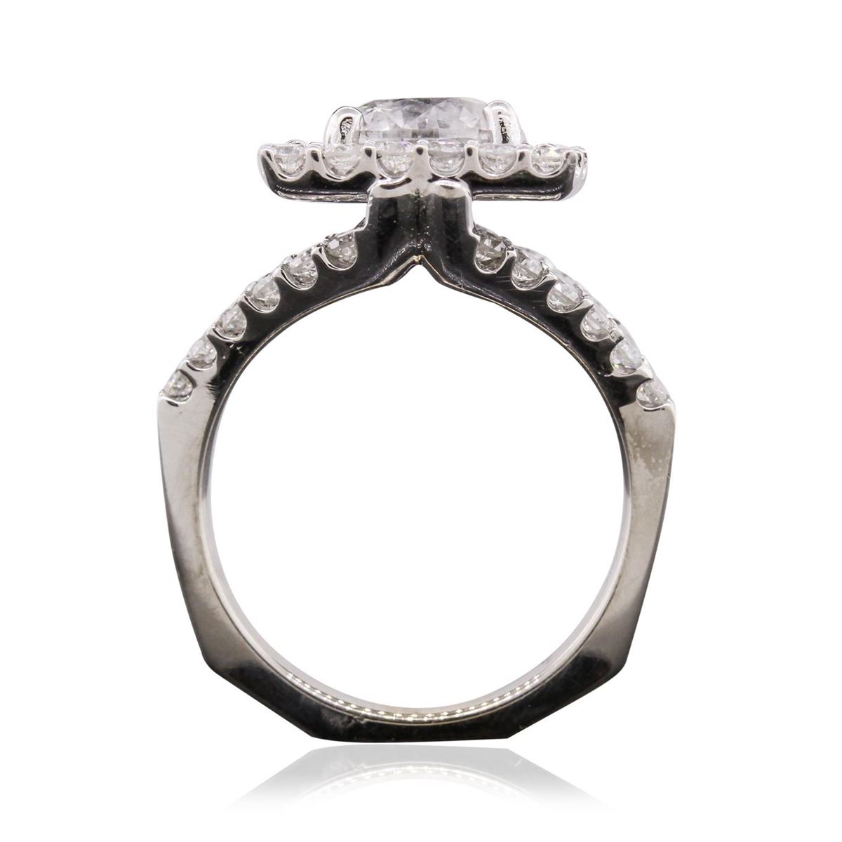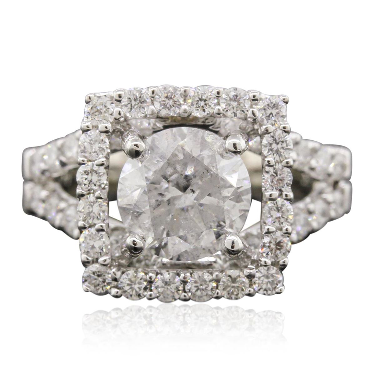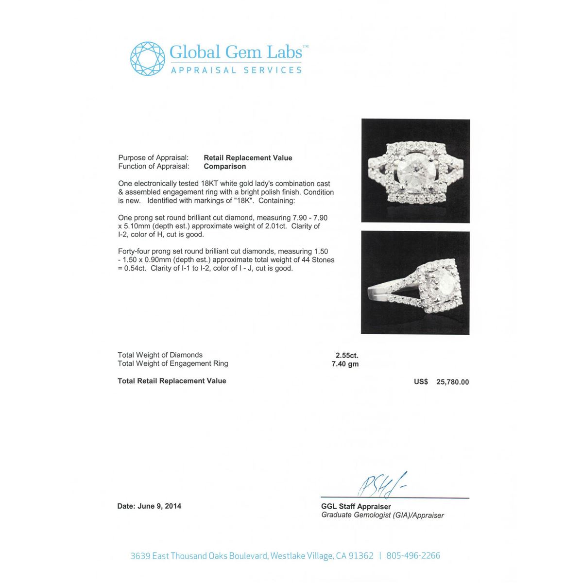 One electronically tested 18KT white gold Ladies combination cast & assembled engagement ring with a bright polish finish. Condition is new. Identified with markings of "18K". Containing: One prong set round brilliant cut diamond, measuring 7.90 - 7.90 x 5.10mm (depth est.) approximate weight of 2.01ct. Clarity: I-2. Color: H, Cut is Good. Forty-Four prong set round brilliant cut diamonds, measuring 1.50 - 1.50 x 0.90mm (depth est.) approximate. Total Weight of 44 Stones = 0.54ct. Clarity: I-1 to I-2. Color: I - J, Cut is Good. Total Weight of Diamonds 2.55ct. Total Weight of Engagement Ring 7.40 grams. GGL Appraised at $25,780.00.