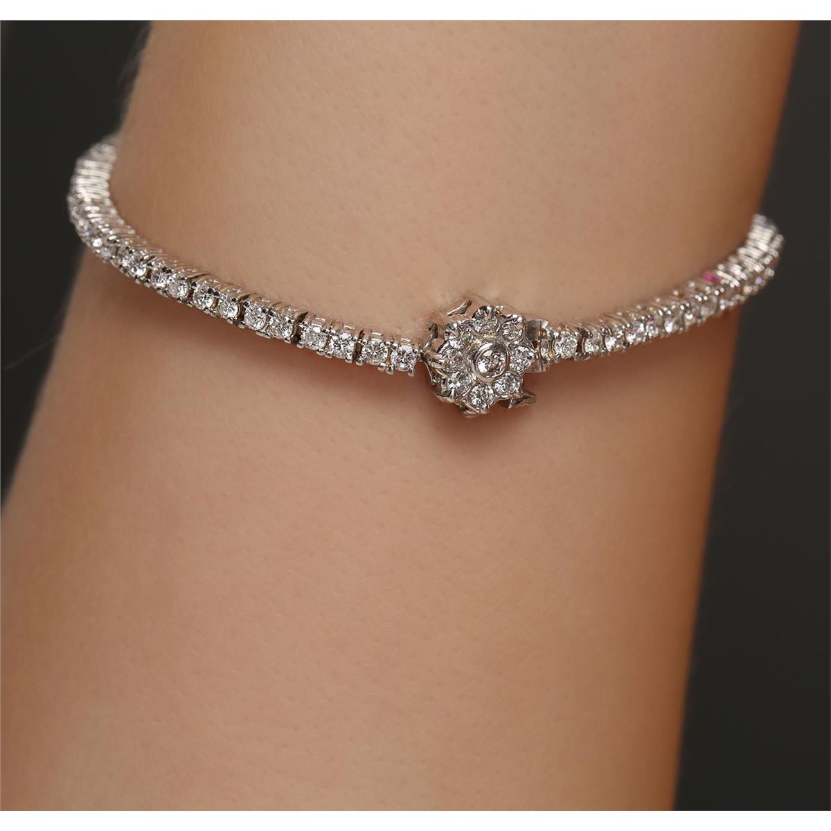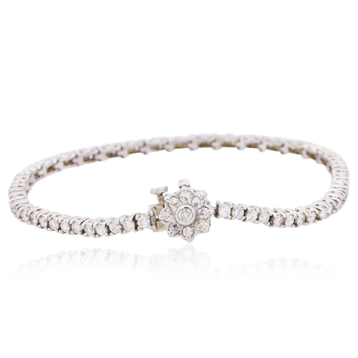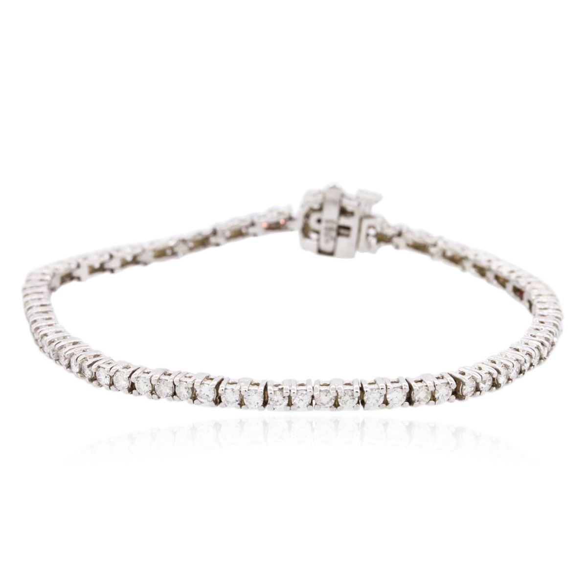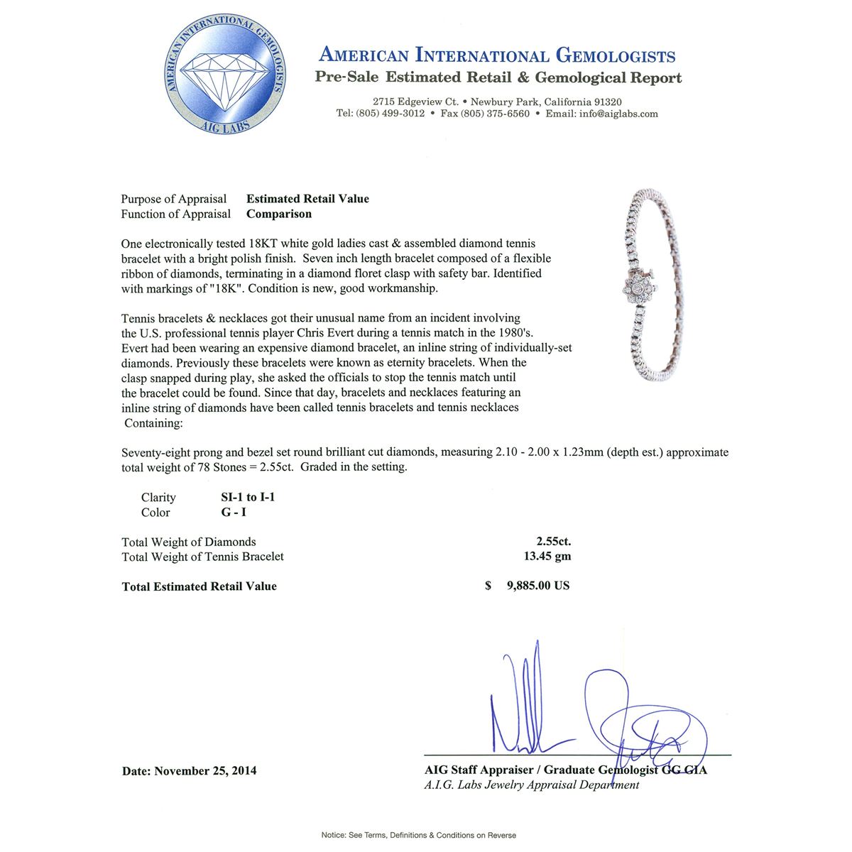 One electronically tested 18KT white gold ladies cast & assembled diamond tennis bracelet with a bright polish finish. Seven inch length bracelet composed of a flexible ribbon of diamonds, terminating in a diamond floret clasp with safety bar. Identified with markings of "18K". Condition is new, good workmanship. Tennis bracelets & necklaces got their unusual name from an incident involving the U.S. professional tennis player Chris Evert during a tennis match in the 1980's. Evert had been wearing an expensive diamond bracelet, an inline string of individually-set diamonds. Previously these bracelets were known as eternity bracelets. When the clasp snapped during play, she asked the officials to stop the tennis match until the bracelet could be found. Since that day, bracelets and necklaces featuring an inline string of diamonds have been called tennis bracelets and tennis necklaces. Containing: Seventy-Eight prong and bezel set round brilliant cut diamonds, measuring 2.10 - 2.00 x 1.23mm (depth est.) approximate total weight of 78 Stones = 2.55ct. Graded in the setting. Clarity: SI-1 to I-1. Color: G - I. Total Weight of Diamonds 2.55ct. Total Weight of Tennis Bracelet 13.45 grams. AIG Appraised at $9,885.00.