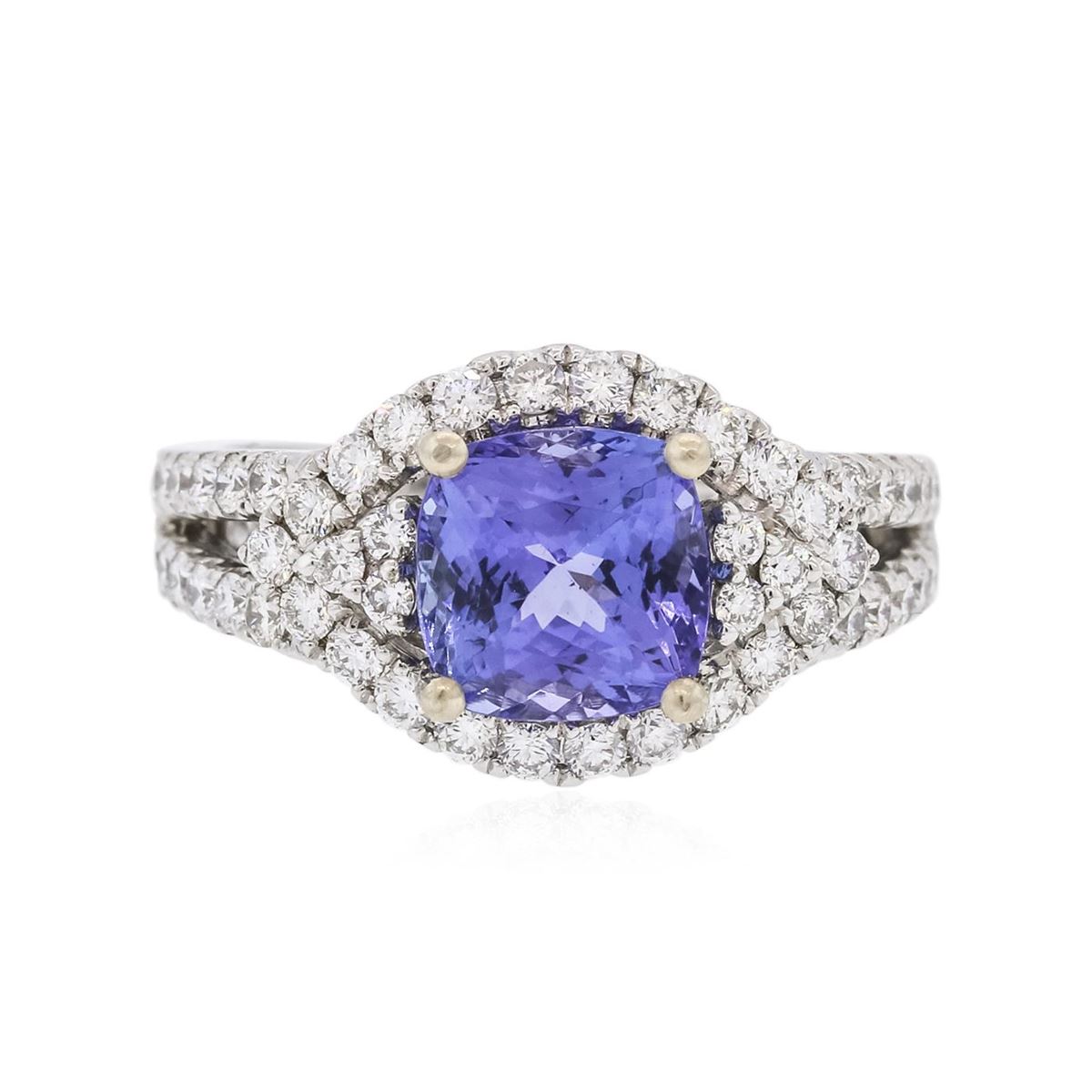 One electronically tested 18KT white gold ladies combination cast & assembled ring with a bright polish finish. Identified with markings of "750". Condition is new. Containing: One prong set square cushion modified brilliant cut natural tanzanite, measuring 7.95 x 7.91 x 5.15mm, approximate weight of 2.55ct., clarity is eye clean, type I, medium light, very slightly grayish, violet color, (GIA V 4/3), cut is good. Fifty-Two prong set round brilliant cut diamonds, measuring 1.70 - 1.50 x 0.96mm (depth est.) approximate total weight of 52 Stones = 1.01ct. Clarity: SI-1 to SI-2. Color: I - J, Cut is Good. Colored gemstones are presumed to have been subjected to commonly used enhancement processes. All diamonds and colored gemstones are graded in the mounting, unless otherwise stated. Total Weight of Colored Stones 2.55ct. Total Weight of Diamonds 1.01ct. Total Weight of Ring 6.70 grams. GGL Appraised at $9,935.00.
