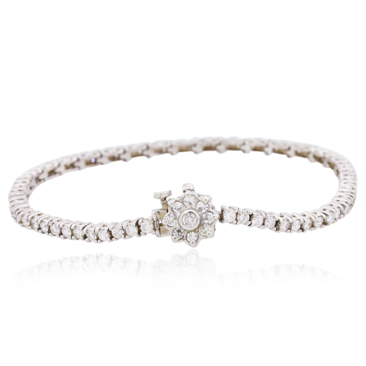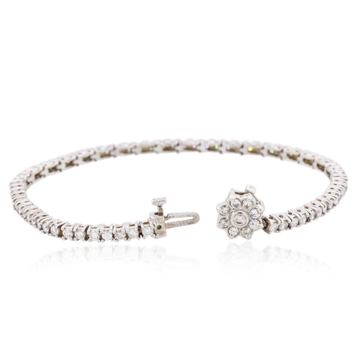 One electronically tested 18KT white gold ladies cast & assembled diamond tennis bracelet with a bright polish finish. Seven inch length bracelet composed of a flexible ribbon of diamonds, terminating in a diamond floret clasp with safety bar. Identified with markings of "18K". Condition is new, good workmanship. Tennis bracelets & necklaces got their unusual name from an incident involving the U.S. professional tennis player Chris Evert during a tennis match in the 1980's. Evert had been wearing an expensive diamond bracelet, an inline string of individually-set diamonds. Previously these bracelets were known as eternity bracelets. When the clasp snapped during play, she asked the officials to stop the tennis match until the bracelet could be found. Since that day, bracelets and necklaces featuring an inline string of diamonds have been called tennis bracelets and tennis necklaces. Containing: Seventy-Eight prong and bezel set round brilliant cut diamonds, measuring 2.10 - 2.00 x 1.23mm (depth est.) approximate total weight of 78 Stones = 2.55ct. Graded in the setting. Clarity: SI-1 to I-1. Color: G - I. Total Weight of Diamonds 2.55ct. Total Weight of Tennis Bracelet 13.45 grams. AIG Appraised at $9,885.00.