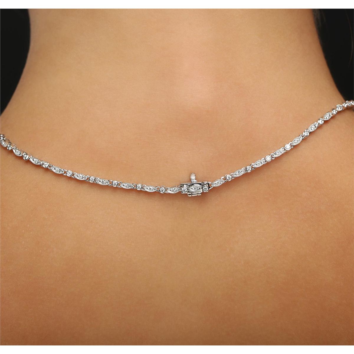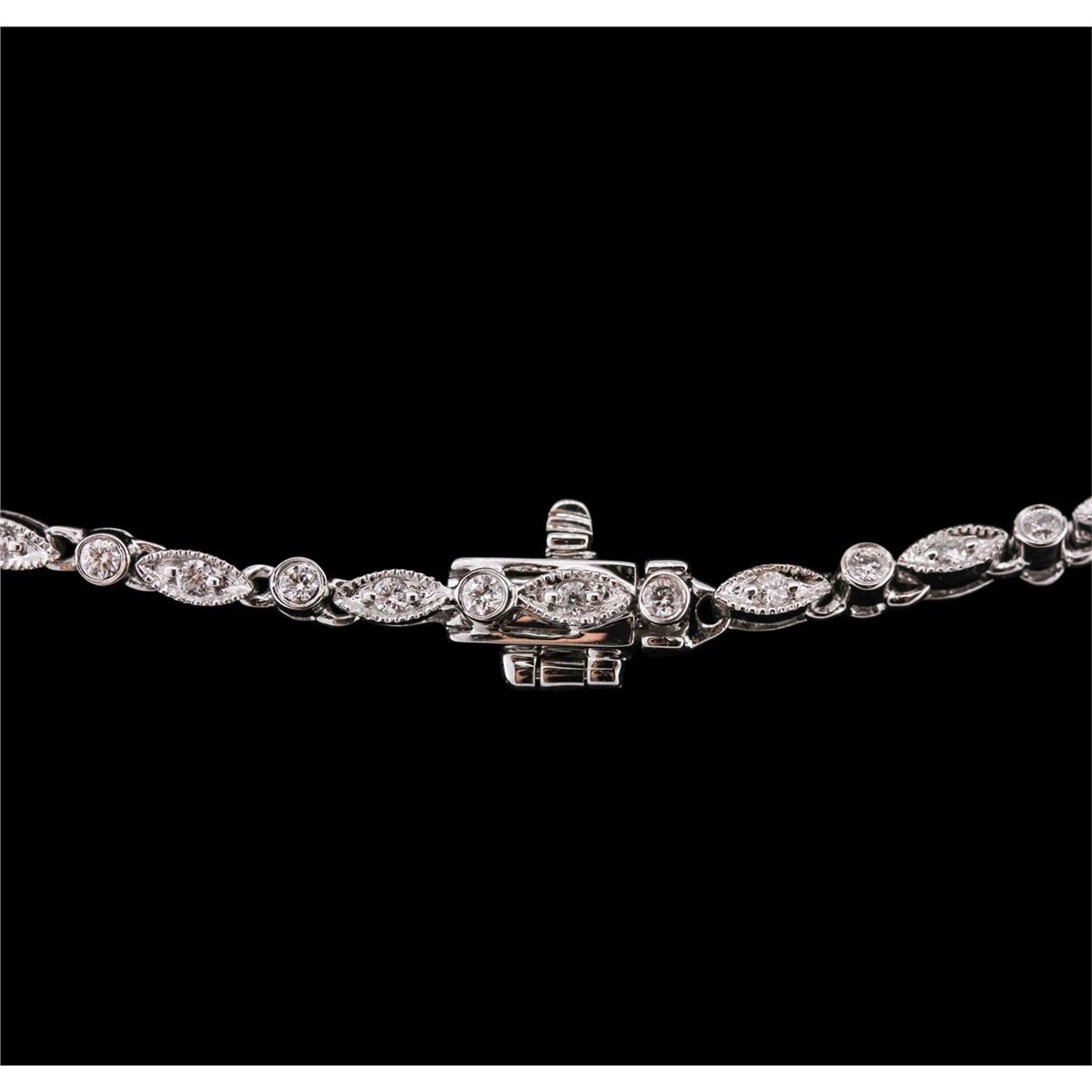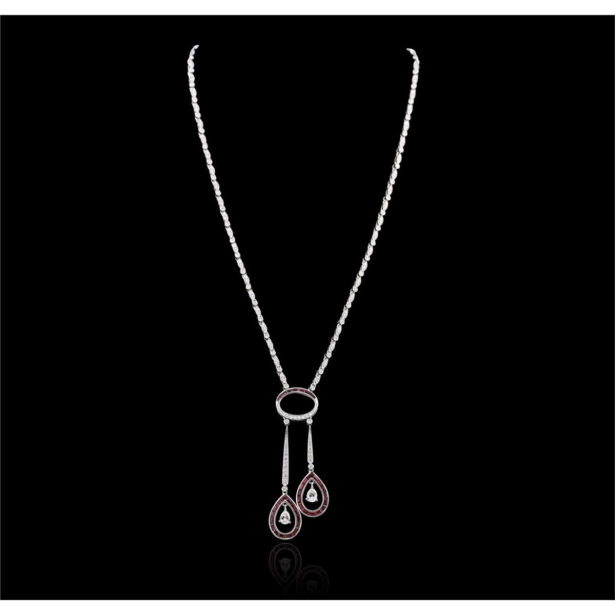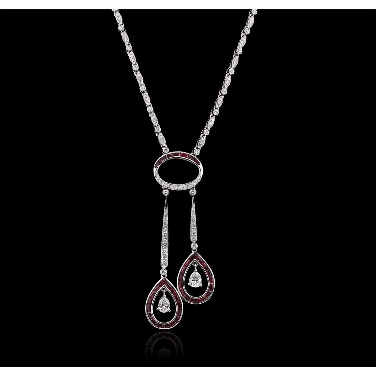 One electronically tested 18KT white gold ladies cast & assembled diamond and ruby necklace. Sixteen and one-half inch length necklace features two staggered diamond and ruby drops supported by a flexible diamond ribbon, terminating in a concealed clasp with safety bar. Bright polish finish with milgrain detailing throughout. Identified with markings of "18K".The necklace is reminiscent of the jewelry designs from the Art Deco Period. The Paris Exposition of Decorative Arts and Modern Manufacturers in 1925 gave the movement its name. The Art Deco Period is characterized with jewelry designs composed of bold geometric designs, & cubism. Condition is new, good workmanship. Containing: Two prong set pear shaped cut diamonds, measuring 5.00 x 3.80 x 2.39mm (depth est.) approximate total weight of 2 Stones = 0.61ct. Graded in the setting. Clarity: VS-2 to SI-1. Color: G - H One Hundred Forty-Six bead & bezel set round brilliant cut diamonds approximate total weight of 146 Stones = 1.58ct. Graded in the setting. Clarity: VS-1 to SI-1. Color: G - I Thirty-nine channel set baguette step cut natural rubies approximate total weight of 2.55ct., clarity is slightly included, type II, medium dark, very slightly brownish, red color, (GIA R 6/3), cut is good. Transmitting light with a minimum of distortion, transparent. Naturally occurring internal & external characteristics are present. Color grade is an average for the group. Graded in the setting. Total Weight of Colored Stones 2.55ct. Total Weight of Diamonds 2.19ct. Total Weight of Necklace 19.70 grams. AIG Appraised at $16,420.00.