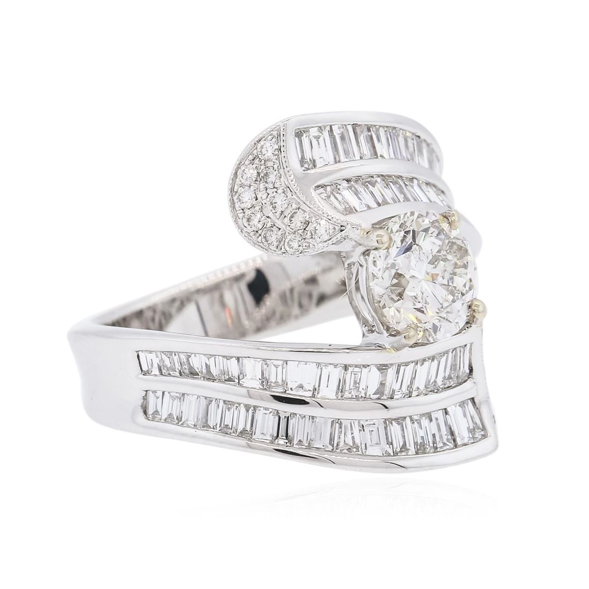 One electronically tested 18KT white gold ladies cast prong set diamond engagement ring with a custom shank with a bright polish finish. Identified with markings of "750 18K". Condition is new. Containing: One prong set round brilliant cut diamond, measuring 6.58 - 6.58 x 4.24mm approximate weight of 1.12ct. Clarity: I-1. Color: J, Cut is Good. Twenty prong set round brilliant cut diamonds, measuring 1.10 - 1.10 x 0.66mm (depth est.) approximate total weight of 20 Stones = 0.13ct. Clarity: I-1. Color: I - J, Cut is Good. Sixty-Four channel set baguette cut diamonds, measuring from 1.10 x 1.10 x 0.94mm (depth est.) to 1.80 x 1.30 x 1.11mm (depth est.) approximate total weight of 64 Stones = 1.31ct. Clarity: VS-2. Color: H - I, Cut is Good. All diamonds are graded in the mounting, unless otherwise stated. Total Weight of Diamonds 2.56ct. Total Weight of Engagement Ring 8.70 grams. GGL Appraised at $20,905.00.