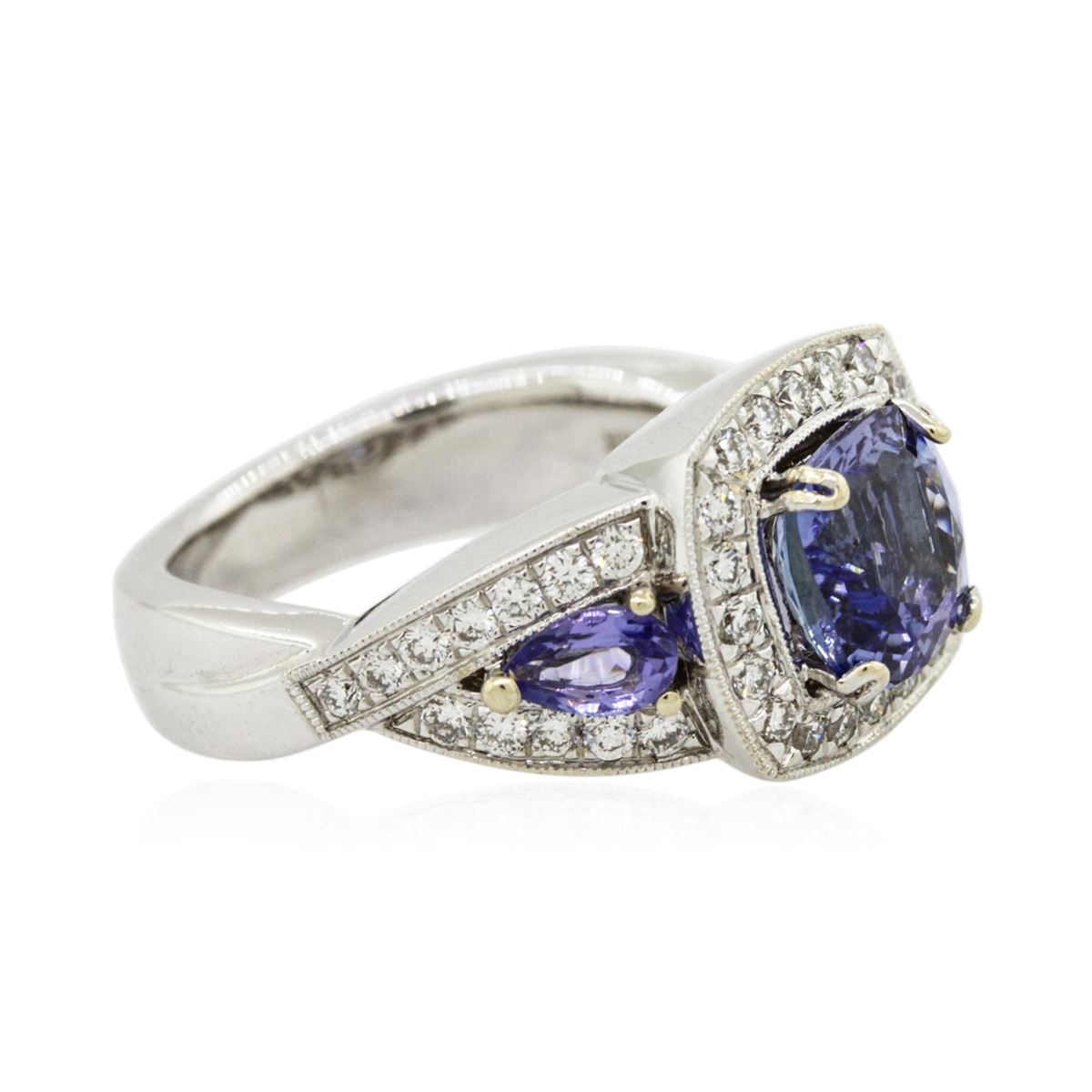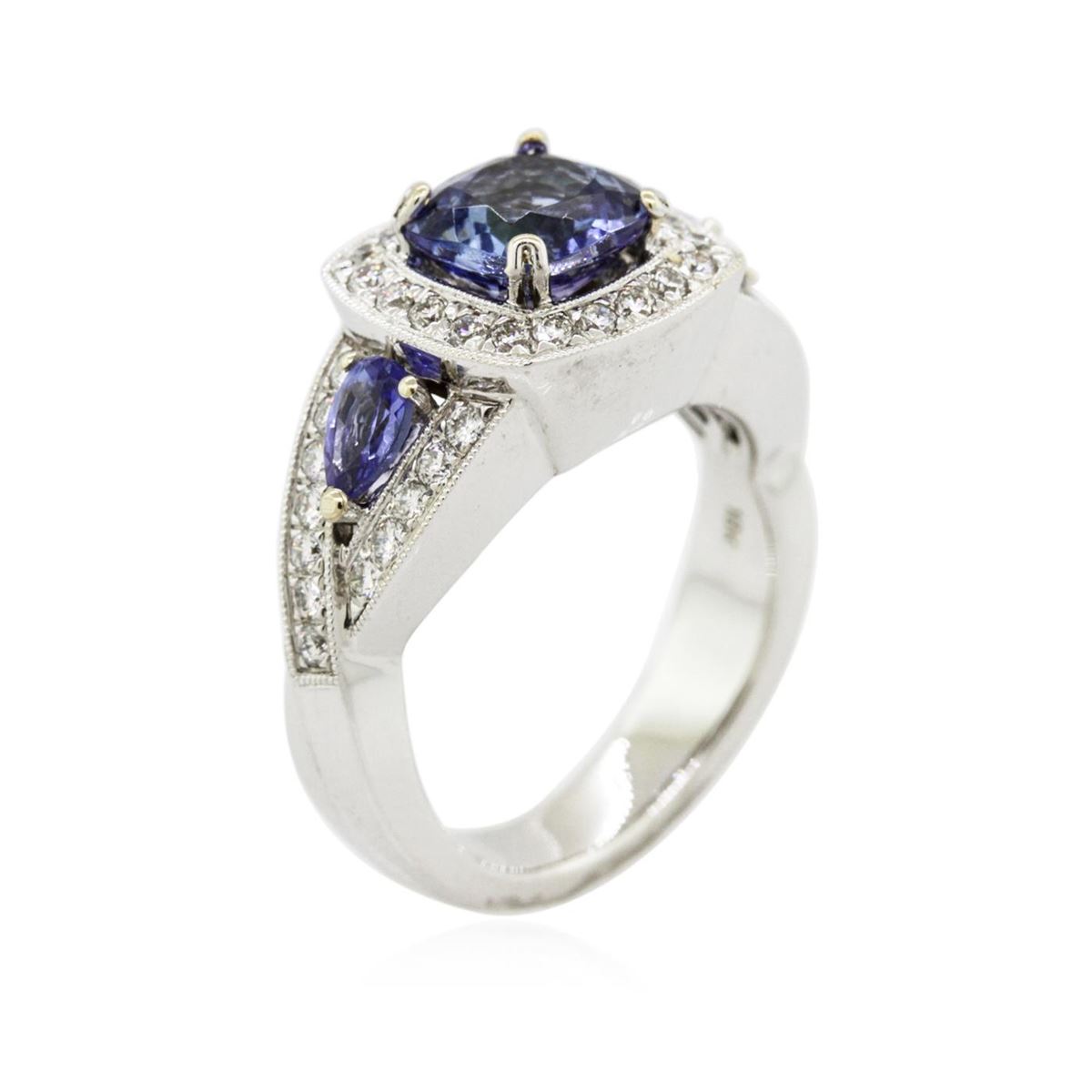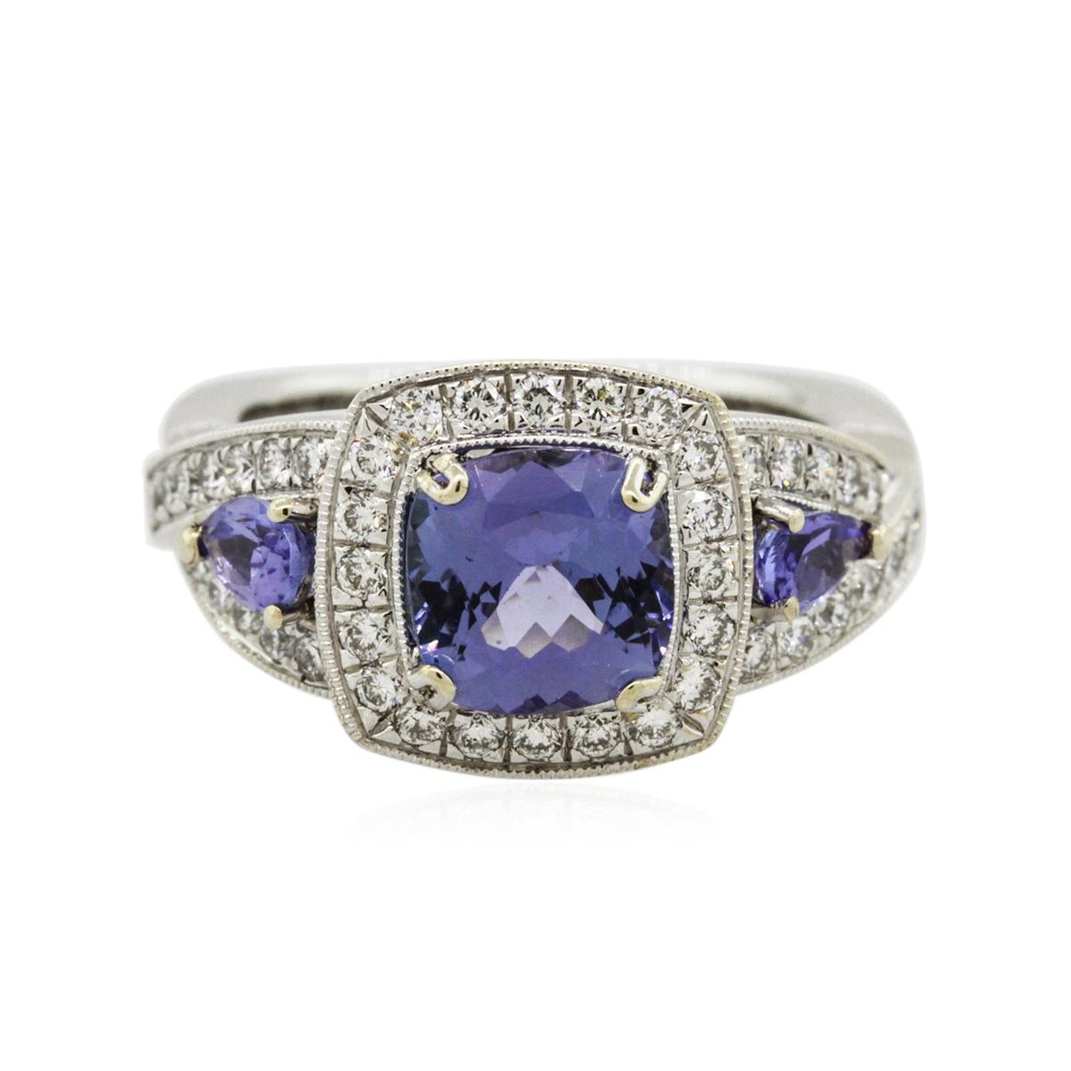 One electronically tested 18KT White Gold ladies cast tanzanite and diamond ring. The featured tanzanite is set within a diamond bezel supported by intertwining diamond set shoulders with tanzanite accents, completed by a three and one-half millimeter wide band. Bright polish finish with milgrain detailing throughout. Identified with markings of "18K 750". Condition is new, good workmanship. Containing: One prong set square cushion brilliant cut natural tanzanite, measuring 7.35 x 7.30 x 4.60mm, 8% bulge factor, approximate weight of 2.10ct., clarity is eye clean, type I, medium dark, slightly grayish, bluish violet color, (GIA bV 6/2), cut is good. Transmitting light with no distortion, transparent. Graded in the setting. Two prong set pear brilliant cut natural tanzanites, measuring 5.20 x 3.10 x 2.02mm, 6% bulge factor, approximate total weight of 0.46ct., clarity is eye clean, type I, medium dark, very slightly grayish, bluish violet color, (GIA bV 6/3), cut is good. Transmitting light with no distortion, transparent. Measurements & the color grade are an average for the pair. Graded in the setting. Tanzanite is a very rare gemstone that is only found in the country of Tanzania. Originally discovered in 1967. Tiffany & Company, named the stone Tanzanite. It is found in the Usumburu Mountains that border the Umba Valley of northern Tanzania. Tanzanite occurs in gray, brown, violet, blue, reddish-purple, & green. The gem is interesting because of its exceptional pleochroism. Rotated in different directions a tanzanite will exhibit multiple changes of color. Tanzanite has a low tolerance to ultrasonic cleaning, and should not be cleaned using this method. Forty-Four bead set round brilliant cut diamonds, measuring 1.60 - 1.50 x 0.93mm (depth est.) approximate total weight of 44 Stones = 0.70ct. Graded in the setting. Clarity: VS-1 to SI-1. Color: G - I. Total Weight of Colored Stones 2.56ct. Total Weight of Diamonds 0.70ct. Total Weight of Ring 11.83 grams. AIG Appraised at $9,725.00.