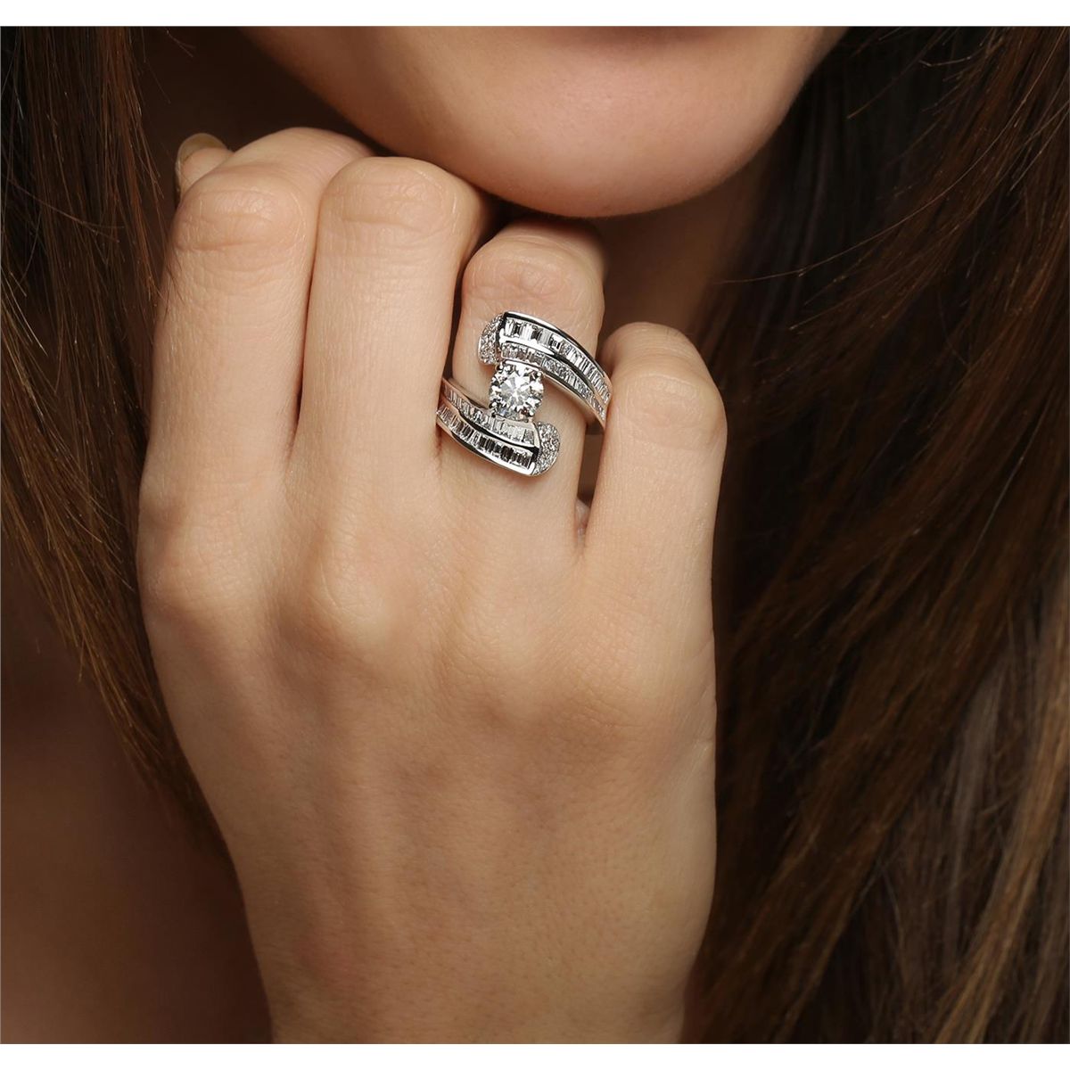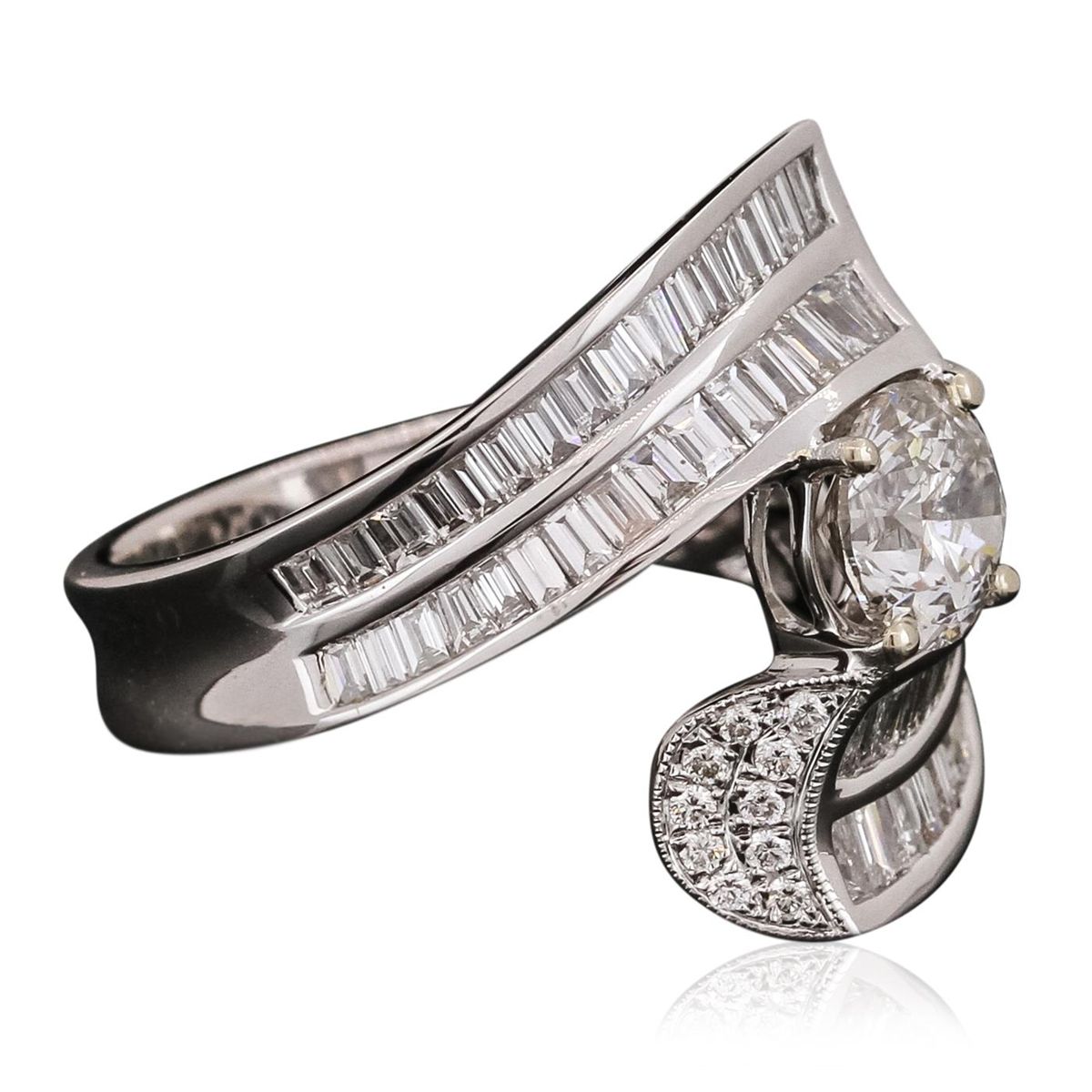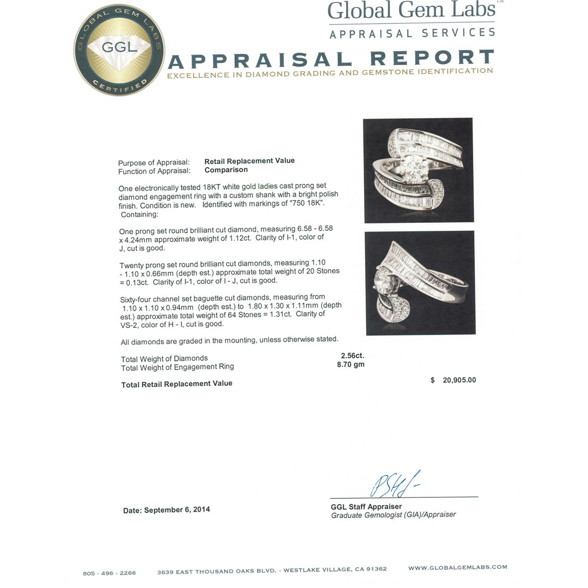 One electronically tested 18KT white gold ladies cast prong set diamond engagement ring with a custom shank with a bright polish finish. Identified with markings of "750 18K". Condition is new. Containing: One prong set round brilliant cut diamond, measuring 6.58 - 6.58 x 4.24mm approximate weight of 1.12ct. Clarity: I-1. Color: J, Cut is Good. Twenty prong set round brilliant cut diamonds, measuring 1.10 - 1.10 x 0.66mm (depth est.) approximate total weight of 20 Stones = 0.13ct. Clarity: I-1. Color: I - J, Cut is Good. Sixty-Four channel set baguette cut diamonds, measuring from 1.10 x 1.10 x 0.94mm (depth est.) to 1.80 x 1.30 x 1.11mm (depth est.) approximate total weight of 64 Stones = 1.31ct. Clarity: VS-2. Color: H - I, Cut is Good. All diamonds are graded in the mounting, unless otherwise stated. Total Weight of Diamonds 2.56ct. Total Weight of Engagement Ring 8.70 grams. GGL Appraised at $20,905.00.