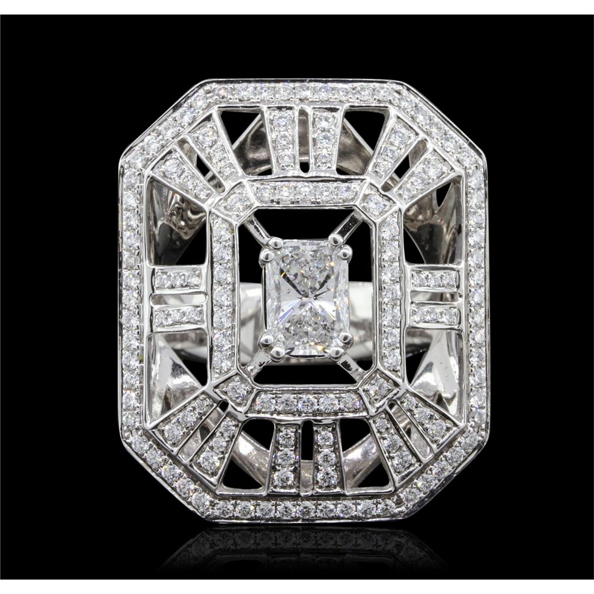 One electronically tested 18KT white gold Ladies combination cast & assembled fancy ring with a bright polish finish. Identified with markings of "18K". Condition is new. Containing: One prong set radiant shaped cut diamond, measuring 6.80 x 4.85 x 3.64mm (depth est.) approximate weight of 1.02ct. Clarity of I-1, Color of I, Cut is Good. One Hundred Forty bead set round brilliant cut diamonds, measuring 1.50 - 1.40 x 0.87mm (depth est.) approximate total weight of 140 Stones = 1.55ct. Clarity of SI-1 to SI-2, Color of H - I, Cut is Good. Total Weight of Diamonds 2.57ct. Total Weight of Ring 17.70gm. GGL Appraised at $24,415.00.
