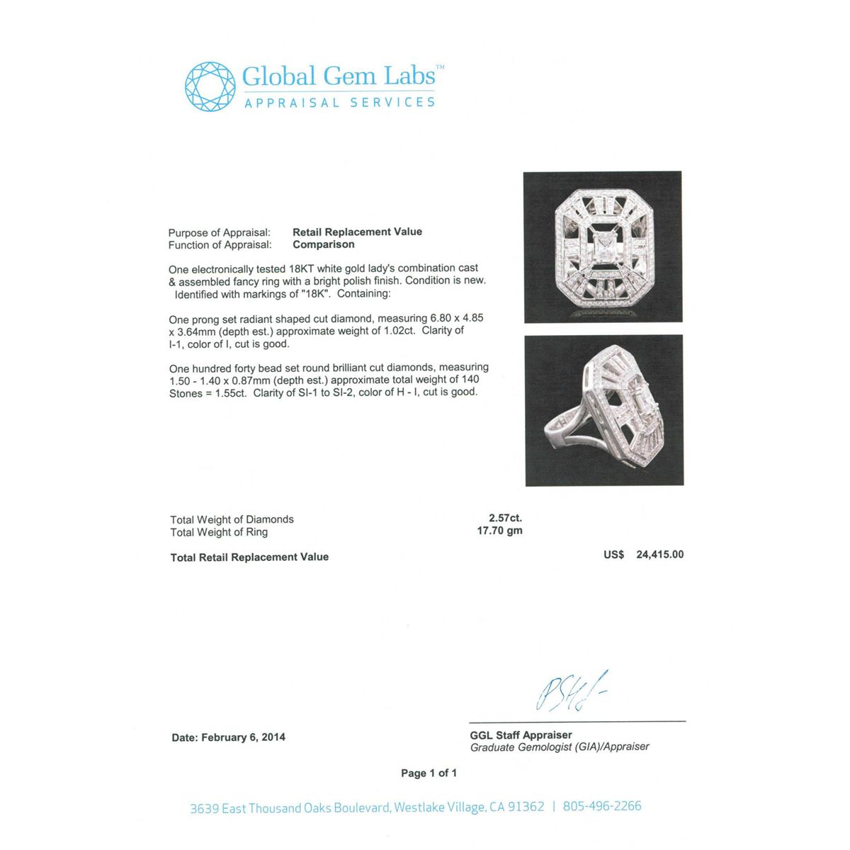 One electronically tested 18KT white gold Ladies combination cast & assembled fancy ring with a bright polish finish. Identified with markings of "18K". Condition is new. Containing: One prong set radiant shaped cut diamond, measuring 6.80 x 4.85 x 3.64mm (depth est.) approximate weight of 1.02ct. Clarity of I-1, Color of I, Cut is Good. One Hundred Forty bead set round brilliant cut diamonds, measuring 1.50 - 1.40 x 0.87mm (depth est.) approximate total weight of 140 Stones = 1.55ct. Clarity of SI-1 to SI-2, Color of H - I, Cut is Good. Total Weight of Diamonds 2.57ct. Total Weight of Ring 17.70gm. GGL Appraised at $24,415.00.
