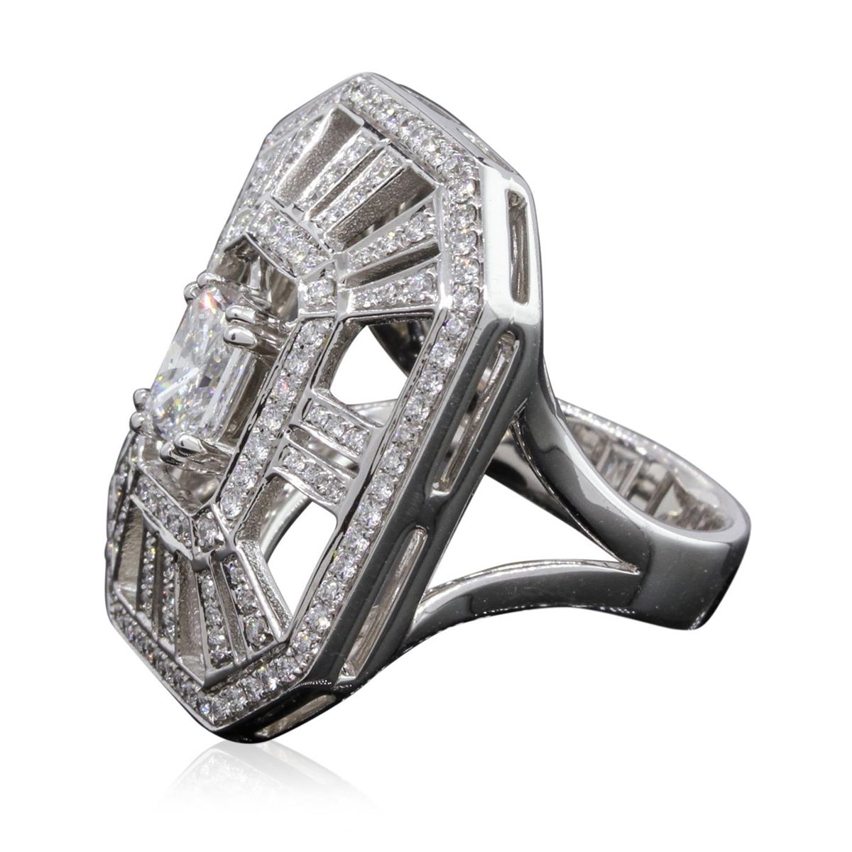One electronically tested 18KT white gold Ladies combination cast & assembled fancy ring with a bright polish finish. Identified with markings of "18K". Condition is new. Containing: One prong set radiant shaped cut diamond, measuring 6.80 x 4.85 x 3.64mm (depth est.) approximate weight of 1.02ct. Clarity of I-1, Color of I, Cut is Good. One Hundred Forty bead set round brilliant cut diamonds, measuring 1.50 - 1.40 x 0.87mm (depth est.) approximate total weight of 140 Stones = 1.55ct. Clarity of SI-1 to SI-2, Color of H - I, Cut is Good. Total Weight of Diamonds 2.57ct. Total Weight of Ring 17.70gm. GGL Appraised at $24,415.00.