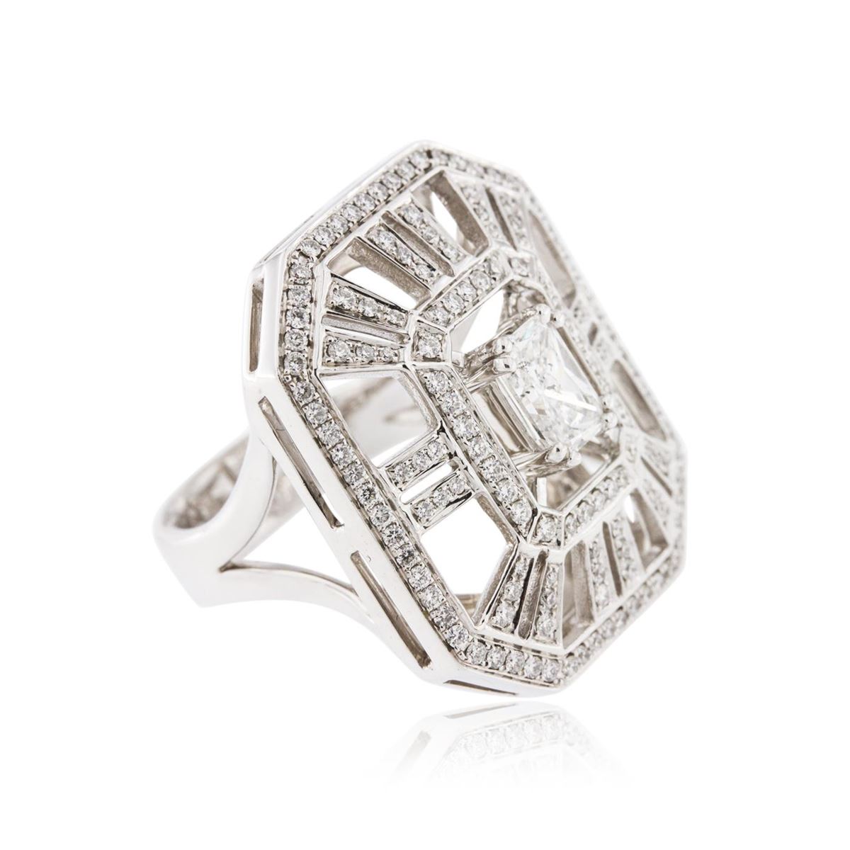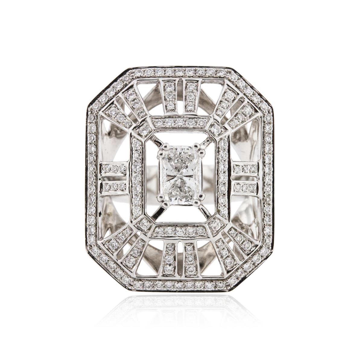 One electronically tested 18KT white gold Ladies combination cast & assembled fancy ring with a bright polish finish. Identified with markings of "18K". Condition is new. Containing: One prong set radiant shaped cut diamond, measuring 6.80 x 4.85 x 3.64mm (depth est.) approximate weight of 1.02ct. Clarity of I-1, Color of I, Cut is Good. One Hundred Forty bead set round brilliant cut diamonds, measuring 1.50 - 1.40 x 0.87mm (depth est.) approximate total weight of 140 Stones = 1.55ct. Clarity of SI-1 to SI-2, Color of H - I, Cut is Good. Total Weight of Diamonds 2.57ct. Total Weight of Ring 17.70gm. GGL Appraised at $24,415.00.