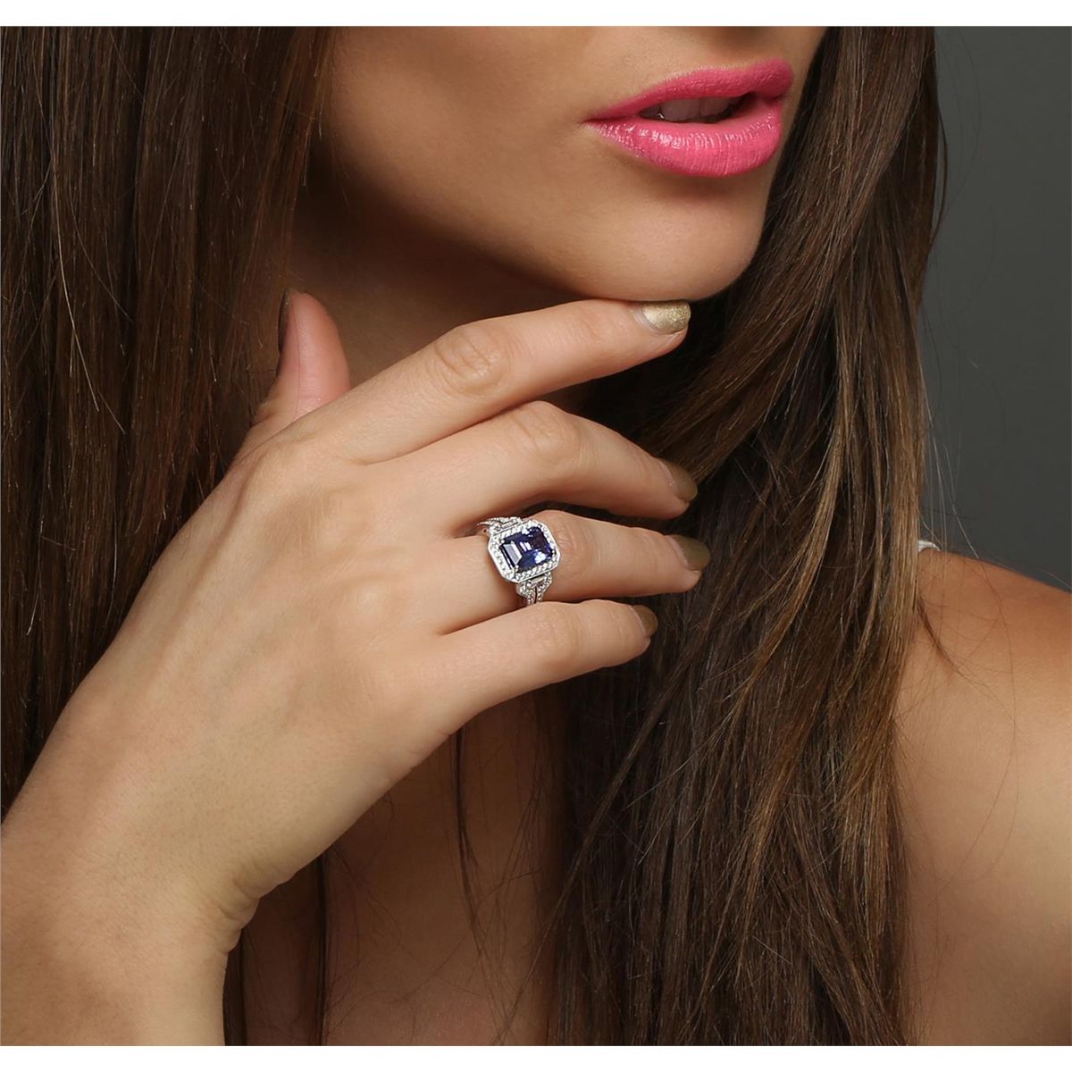 One electronically tested 18KT white gold ladies combination cast & assembled prong set ring with a split shoulder shank with a bright polish finish. Identified with markings of "750". Condition is new. Containing: One prong set emerald modified brilliant cut natural tanzanite, measuring 9.72 x 7.05 x 4.18mm, approximate weight of 2.59ct., clarity is eye clean, type I, medium light, very slightly grayish, violet color, (GIA V 4/3), cut is good. Two prong set baguette cut (tapered) diamonds, measuring 2.50 x 1.50 x 1.28mm (depth est.) approximate total weight of 2 Stones = 0.18ct. Clarity: SI-1. Color: I, Cut is Good. Eighty prong set round brilliant cut diamonds, measuring 1.00 - 1.20 x 0.66mm (depth est.) approximate total weight of 80 Stones = 0.46ct. Clarity: SI-2. Color: H - I, Cut is Good. All diamonds are graded in the mounting, unless otherwise stated, Colored gemstones are presumed to have been subjected to commonly used enhancement processes. Total Weight of Colored Stones 2.59ct. Total Weight of Diamonds 0.64ct. Total Weight of Ring 6.30 grams. GGL Appraised at $8,510.00.