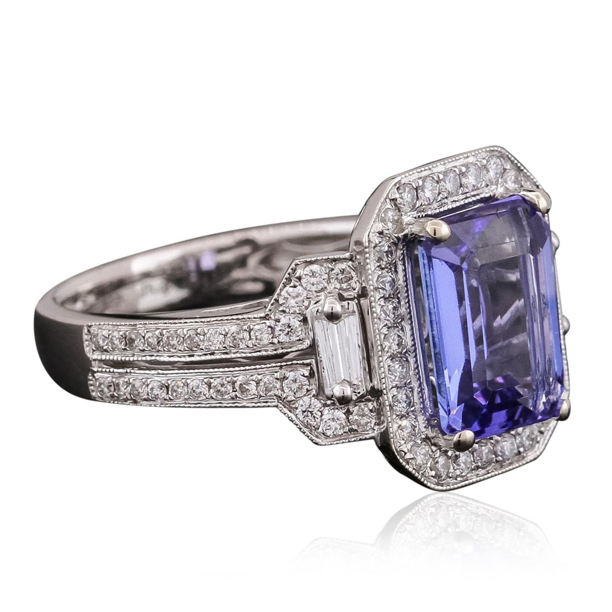 One electronically tested 18KT white gold ladies combination cast & assembled prong set ring with a split shoulder shank with a bright polish finish. Identified with markings of "750". Condition is new. Containing: One prong set emerald modified brilliant cut natural tanzanite, measuring 9.72 x 7.05 x 4.18mm, approximate weight of 2.59ct., clarity is eye clean, type I, medium light, very slightly grayish, violet color, (GIA V 4/3), cut is good. Two prong set baguette cut (tapered) diamonds, measuring 2.50 x 1.50 x 1.28mm (depth est.) approximate total weight of 2 Stones = 0.18ct. Clarity: SI-1. Color: I, Cut is Good. Eighty prong set round brilliant cut diamonds, measuring 1.00 - 1.20 x 0.66mm (depth est.) approximate total weight of 80 Stones = 0.46ct. Clarity: SI-2. Color: H - I, Cut is Good. All diamonds are graded in the mounting, unless otherwise stated, Colored gemstones are presumed to have been subjected to commonly used enhancement processes. Total Weight of Colored Stones 2.59ct. Total Weight of Diamonds 0.64ct. Total Weight of Ring 6.30 grams. GGL Appraised at $8,510.00.