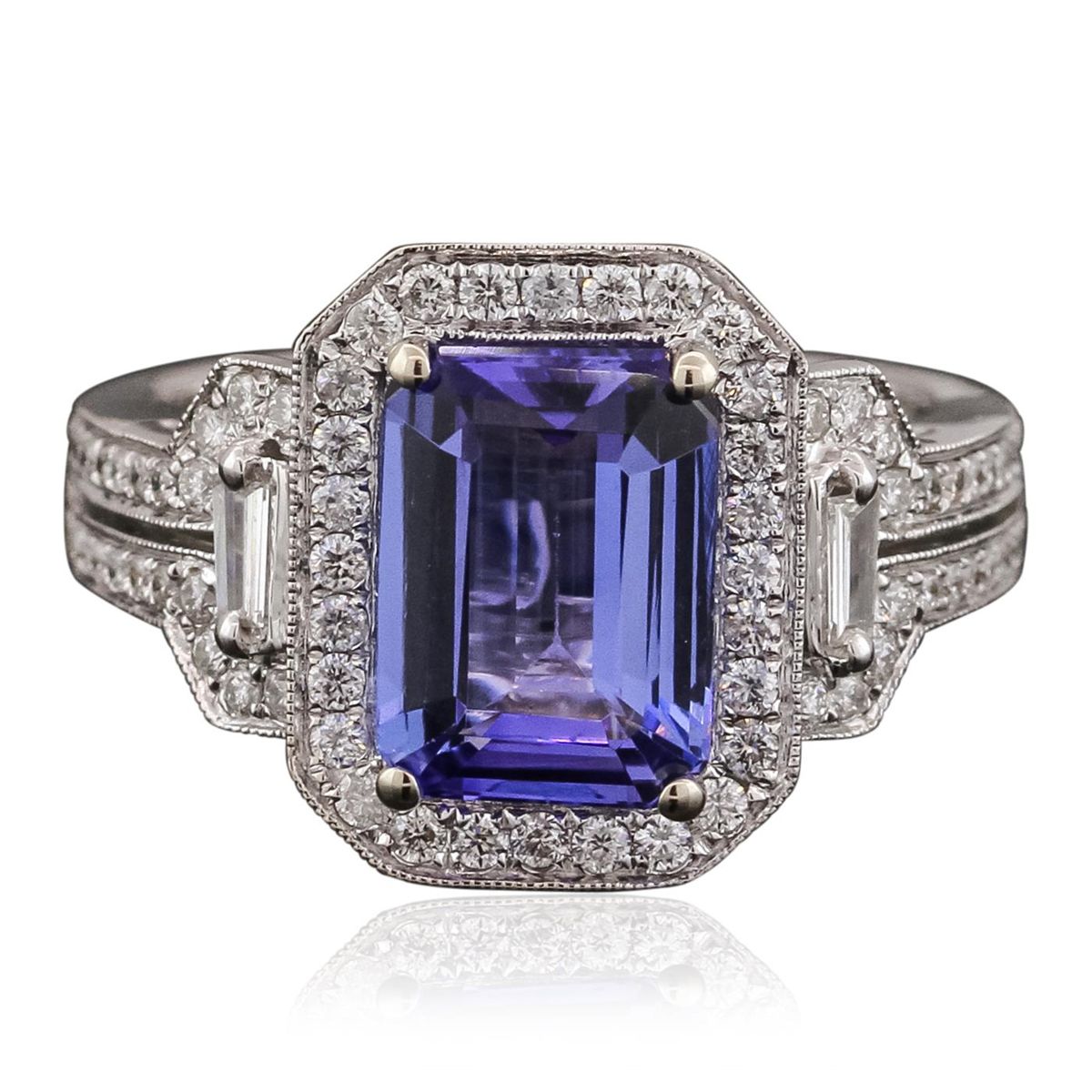 One electronically tested 18KT white gold ladies combination cast & assembled prong set ring with a split shoulder shank with a bright polish finish. Identified with markings of "750". Condition is new. Containing: One prong set emerald modified brilliant cut natural tanzanite, measuring 9.72 x 7.05 x 4.18mm, approximate weight of 2.59ct., clarity is eye clean, type I, medium light, very slightly grayish, violet color, (GIA V 4/3), cut is good. Two prong set baguette cut (tapered) diamonds, measuring 2.50 x 1.50 x 1.28mm (depth est.) approximate total weight of 2 Stones = 0.18ct. Clarity: SI-1. Color: I, Cut is Good. Eighty prong set round brilliant cut diamonds, measuring 1.00 - 1.20 x 0.66mm (depth est.) approximate total weight of 80 Stones = 0.46ct. Clarity: SI-2. Color: H - I, Cut is Good. All diamonds are graded in the mounting, unless otherwise stated, Colored gemstones are presumed to have been subjected to commonly used enhancement processes. Total Weight of Colored Stones 2.59ct. Total Weight of Diamonds 0.64ct. Total Weight of Ring 6.30 grams. GGL Appraised at $8,510.00.