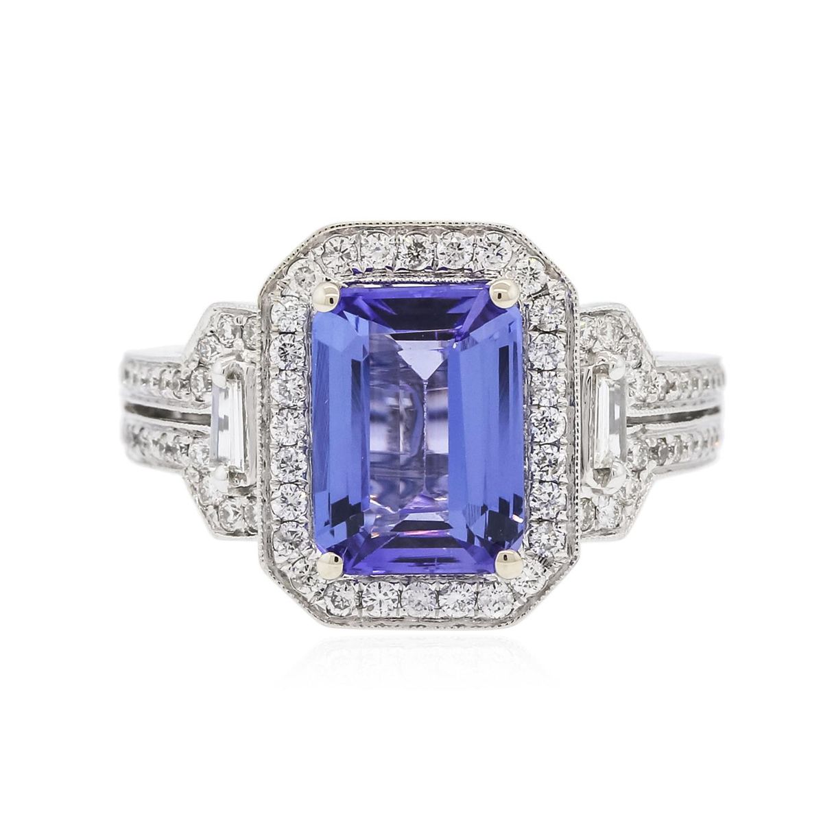 One electronically tested 18KT white gold ladies combination cast & assembled prong set ring with a split shoulder shank with a bright polish finish. Identified with markings of "750". Condition is new. Containing: One prong set emerald modified brilliant cut natural tanzanite, measuring 9.72 x 7.05 x 4.18mm, approximate weight of 2.59ct., clarity is eye clean, type I, medium light, very slightly grayish, violet color, (GIA V 4/3), cut is good. Two prong set baguette cut (tapered) diamonds, measuring 2.50 x 1.50 x 1.28mm (depth est.) approximate total weight of 2 Stones = 0.18ct. Clarity: SI-1. Color: I, Cut is Good. Eighty prong set round brilliant cut diamonds, measuring 1.00 - 1.20 x 0.66mm (depth est.) approximate total weight of 80 Stones = 0.46ct. Clarity: SI-2. Color: H - I, Cut is Good. All diamonds are graded in the mounting, unless otherwise stated, Colored gemstones are presumed to have been subjected to commonly used enhancement processes. Total Weight of Colored Stones 2.59ct. Total Weight of Diamonds 0.64ct. Total Weight of Ring 6.30 grams. GGL Appraised at $8,510.00.