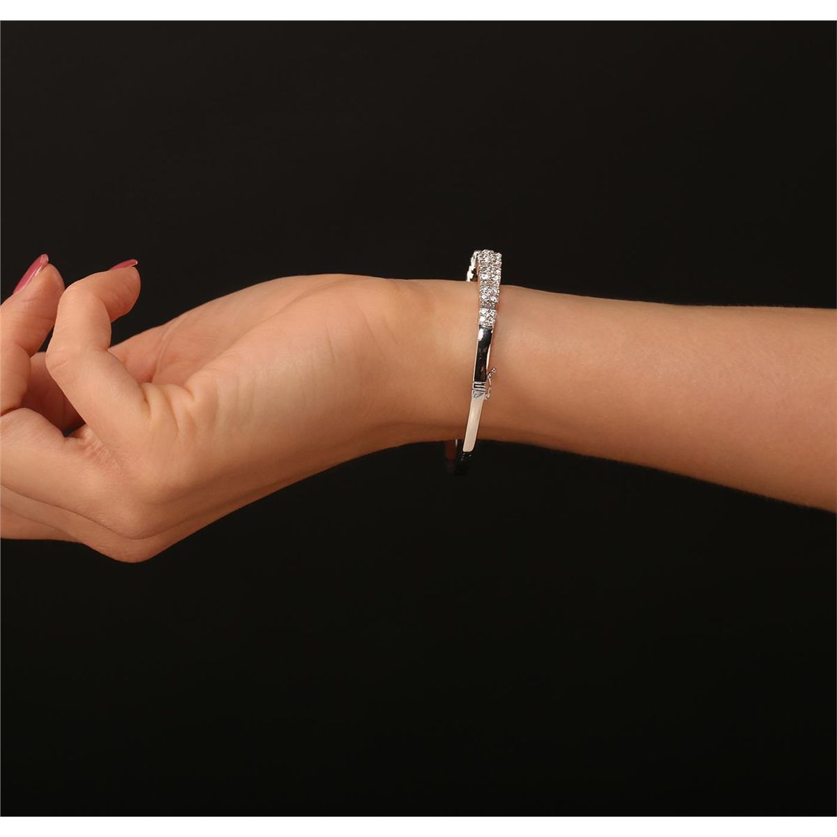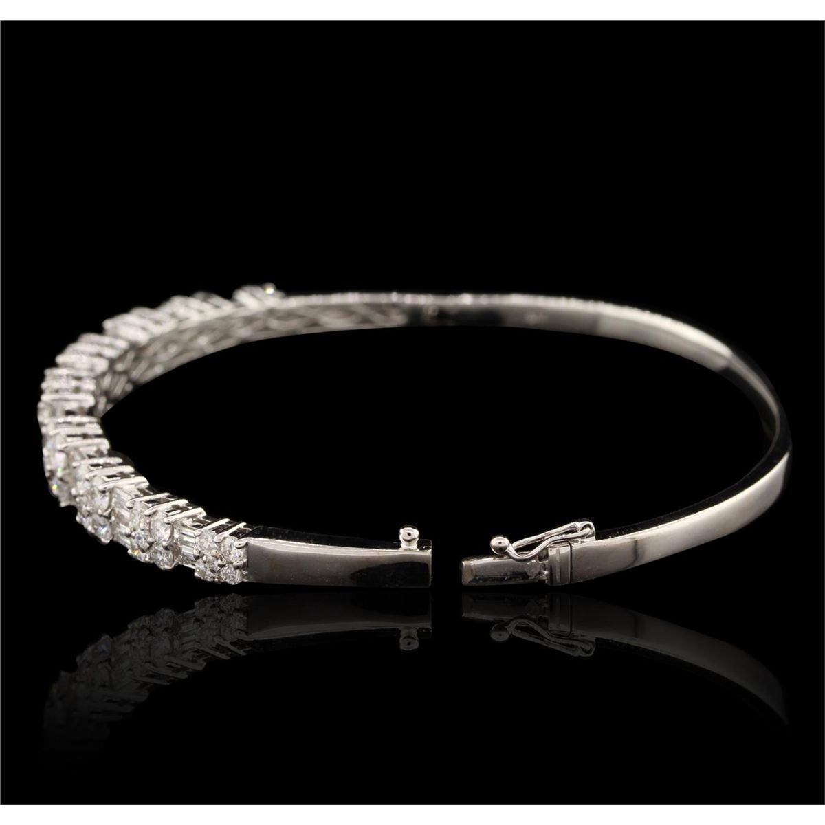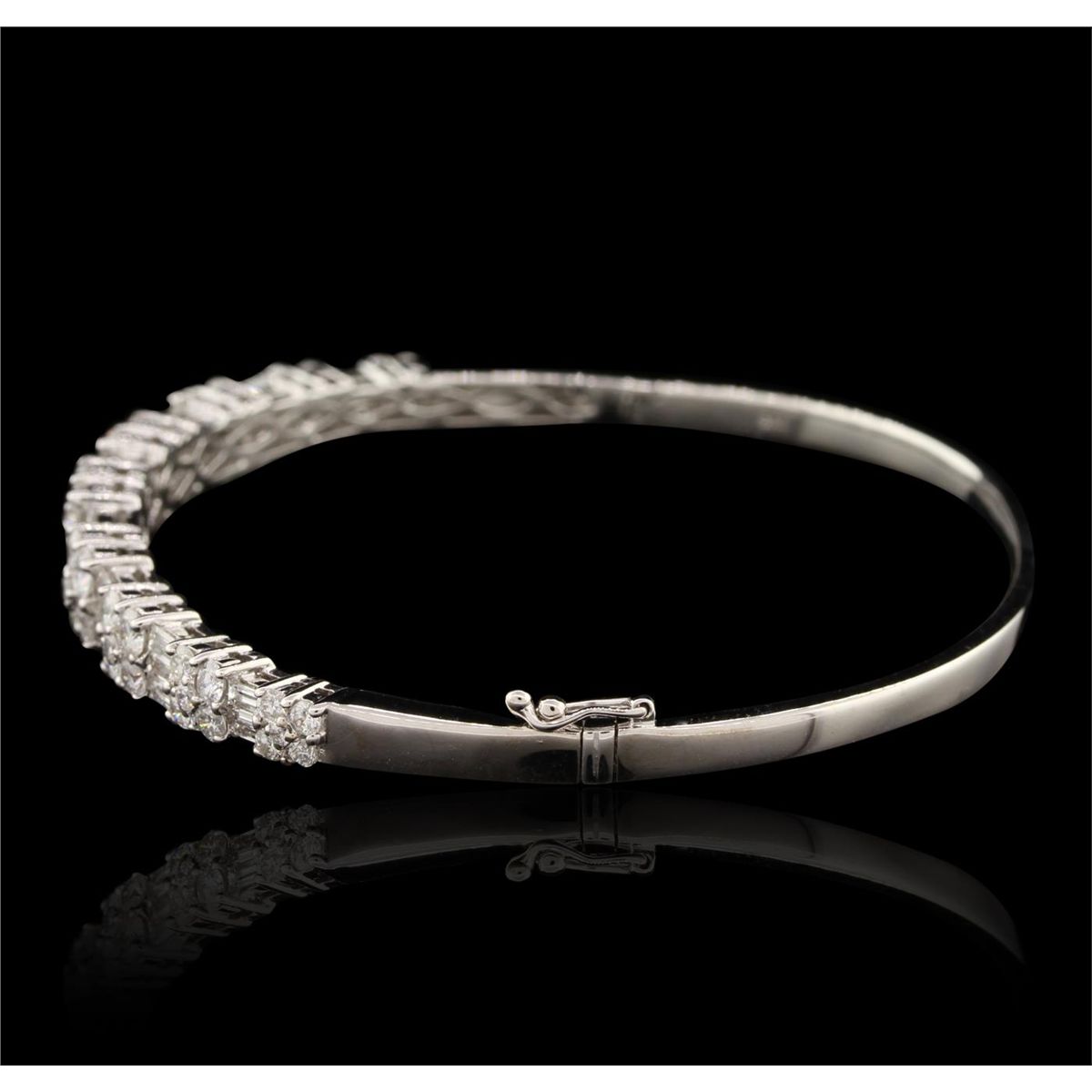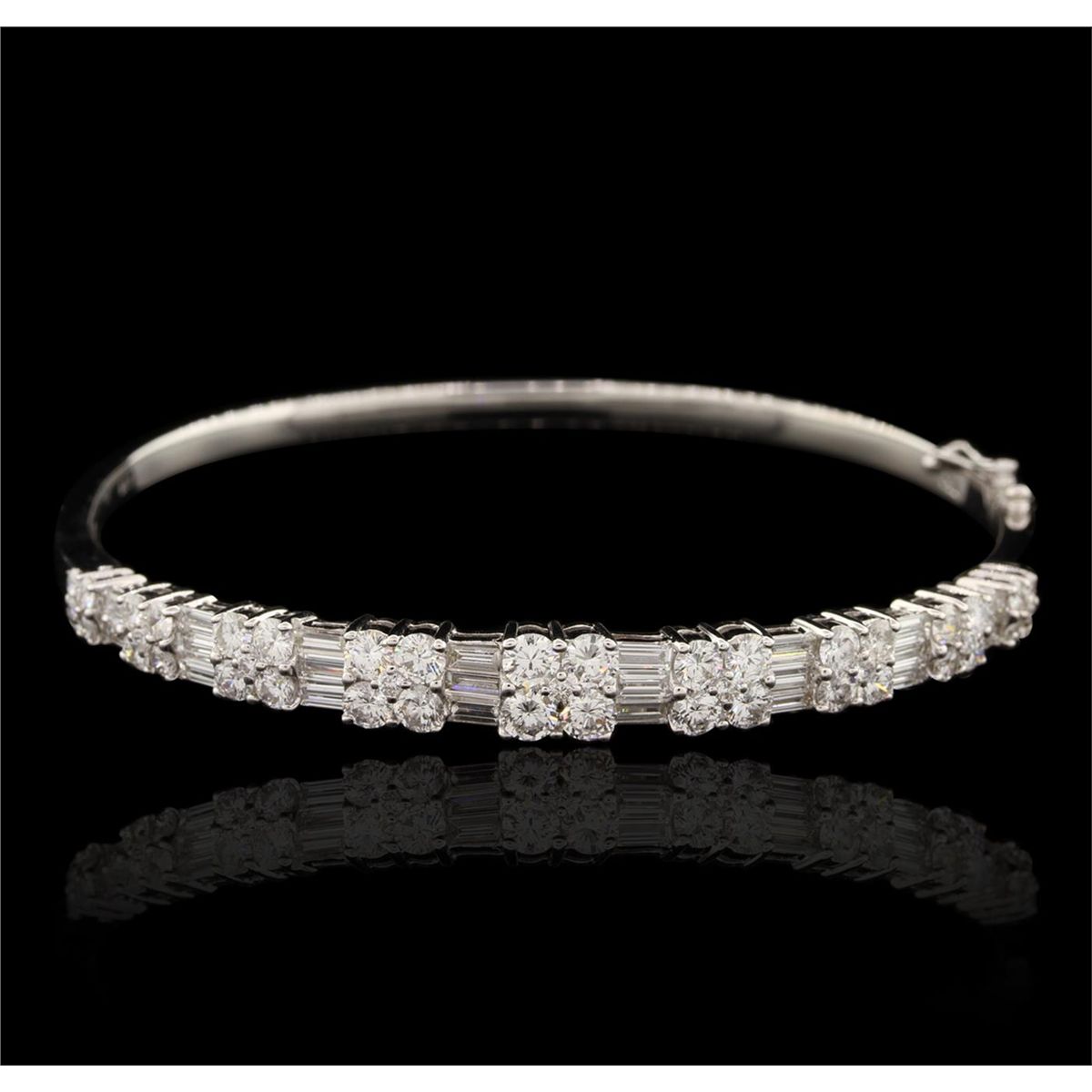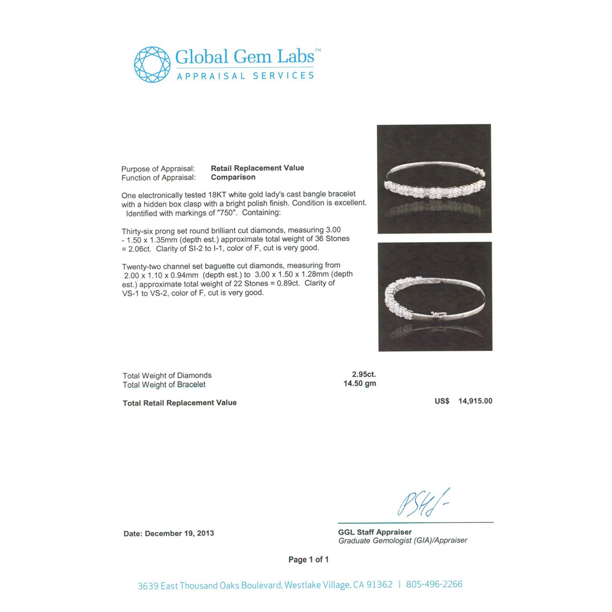 One electronically tested 18KT white gold Ladies cast bangle bracelet with a hidden box clasp with a bright polish finish. Identified with markings of "750". Condition is excellent. Containing: Thirty-Six prong set round brilliant cut diamonds, measuring 3.00 - 1.50 x 1.35mm (depth est.) approximate total weight of 36 Stones = 2.06ct. Clarity of SI-2 to I-1, Color of F, Cut is Very Good. Twenty-Two channel set baguette cut diamonds, measuring from 2.00 x 1.10 x 0.94mm (depth est.) to 3.00 x 1.50 x 1.28mm (depth est.) approximate total weight of 22 Stones = 0.89ct. Clarity of VS-1 to VS-2, Color of F, Cut is Very Good. Total Weight of Diamonds 2.95ct. Total Weight of Bracelet 14.50gm. GGL Appraised at $14,915.00.