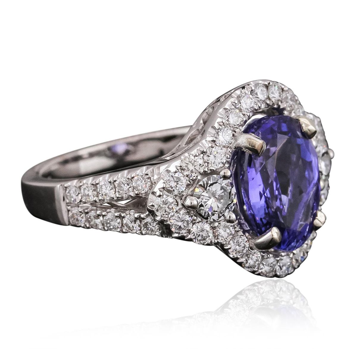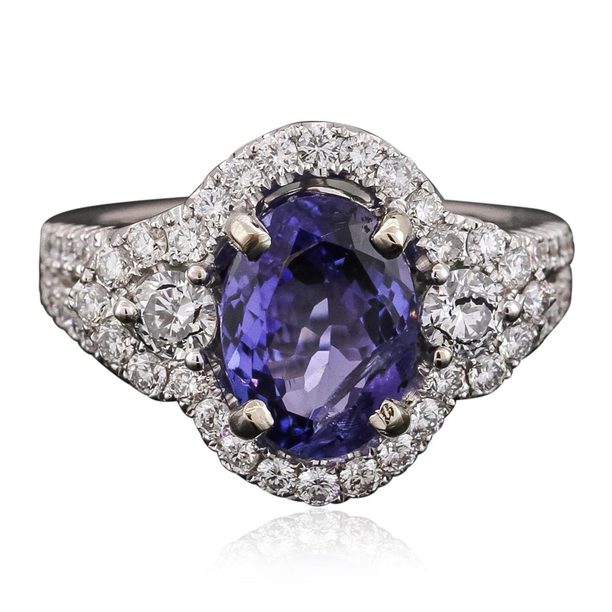 One electronically tested 18KT white gold ladies combination cast & assembled prong set ring with a split shoulder shank with a bright polish finish. Identified with markings of "750 18K". Condition is new. Containing: One prong set oval modified brilliant cut natural tanzanite, measuring 10.40 x 7.70 x 4.73mm, approximate weight of 2.60ct., clarity is eye clean, type I, medium light, very slightly grayish, violet color, (GIA V 4/3), cut is good. Two prong set round brilliant cut diamonds, measuring 3.50 - 3.50 x 2.10mm (depth est.) approximate total weight of 2 Stones = 0.31ct. Clarity: SI-1. Color: I, Cut is Very Good. Forty-Eight prong set round brilliant cut diamonds, measuring 1.50 - 1.50 x 0.90mm (depth est.) approximate total weight of 48 Stones = 0.86ct. Clarity: SI-2. Color: I, Cut is Good. All diamonds are graded in the mounting, unless otherwise stated, Colored gemstones are presumed to have been subjected to commonly used enhancement processes. Total Weight of Colored Stones 2.60ct. Total Weight of Diamonds 1.17ct. Total Weight of Ring 7.20 grams. GGL Appraised at $9,915.00.