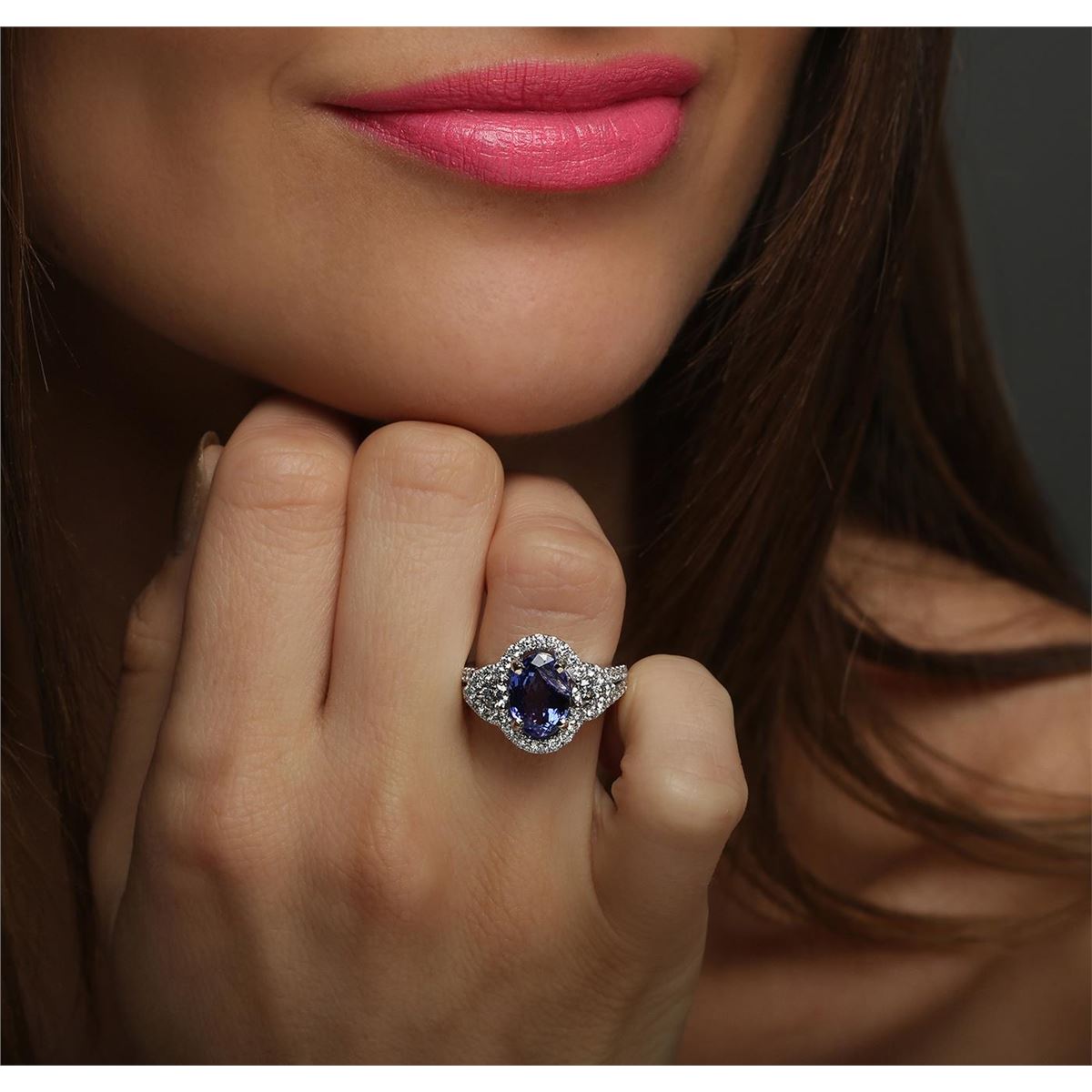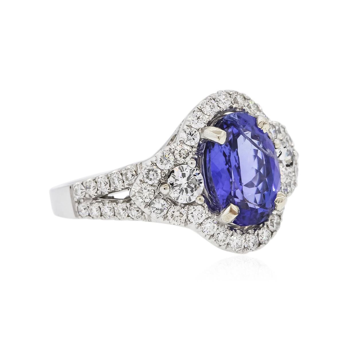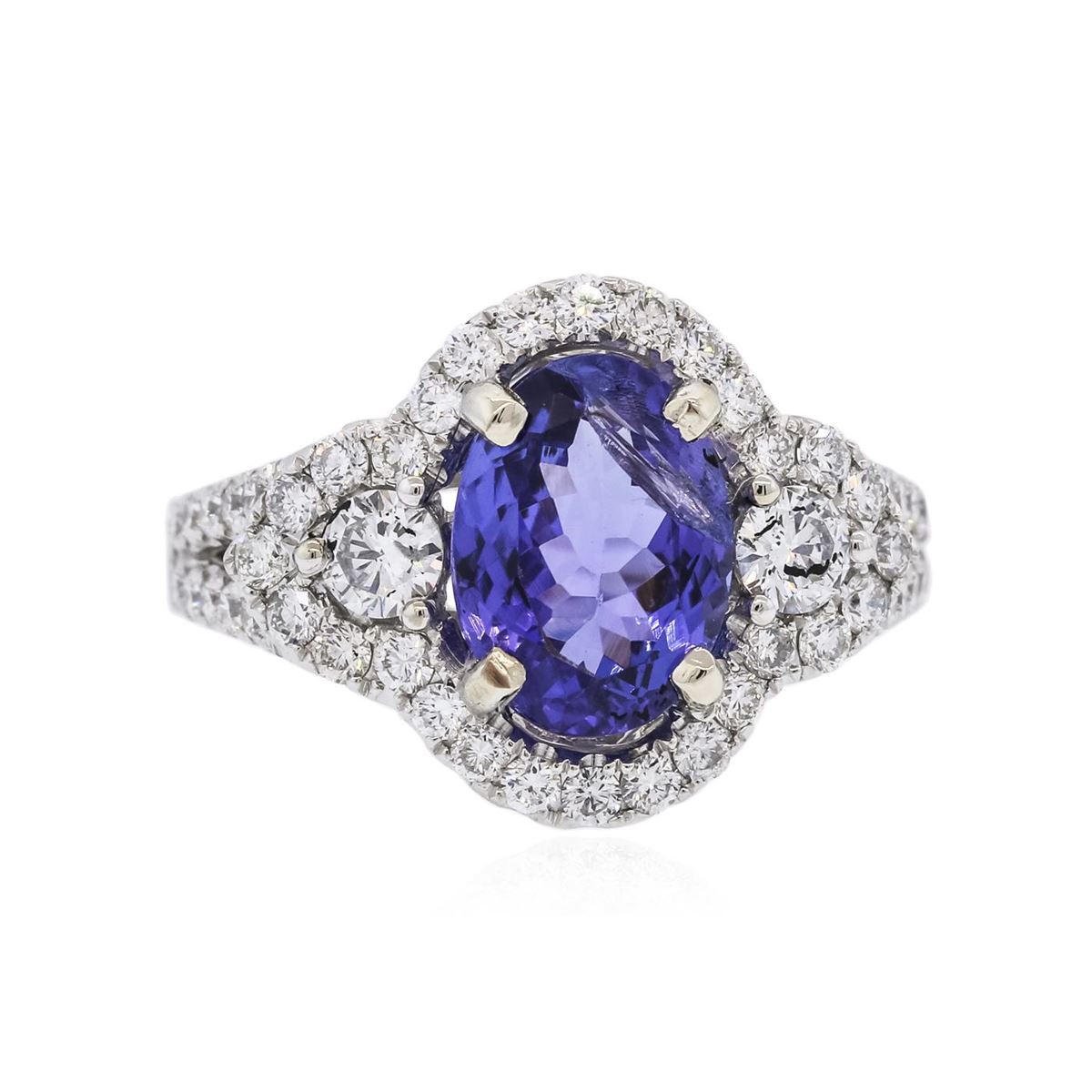 One electronically tested 18KT white gold ladies combination cast & assembled prong set ring with a split shoulder shank with a bright polish finish. Identified with markings of "750 18K". Condition is new. Containing: One prong set oval modified brilliant cut natural tanzanite, measuring 10.40 x 7.70 x 4.73mm, approximate weight of 2.60ct., clarity is eye clean, type I, medium light, very slightly grayish, violet color, (GIA V 4/3), cut is good. Two prong set round brilliant cut diamonds, measuring 3.50 - 3.50 x 2.10mm (depth est.) approximate total weight of 2 Stones = 0.31ct. Clarity: SI-1. Color: I, Cut is Very Good. Forty-Eight prong set round brilliant cut diamonds, measuring 1.50 - 1.50 x 0.90mm (depth est.) approximate total weight of 48 Stones = 0.86ct. Clarity: SI-2. Color: I, Cut is Good. All diamonds are graded in the mounting, unless otherwise stated, Colored gemstones are presumed to have been subjected to commonly used enhancement processes. Total Weight of Colored Stones 2.60ct. Total Weight of Diamonds 1.17ct. Total Weight of Ring 7.20 grams. GGL Appraised at $9,915.00.