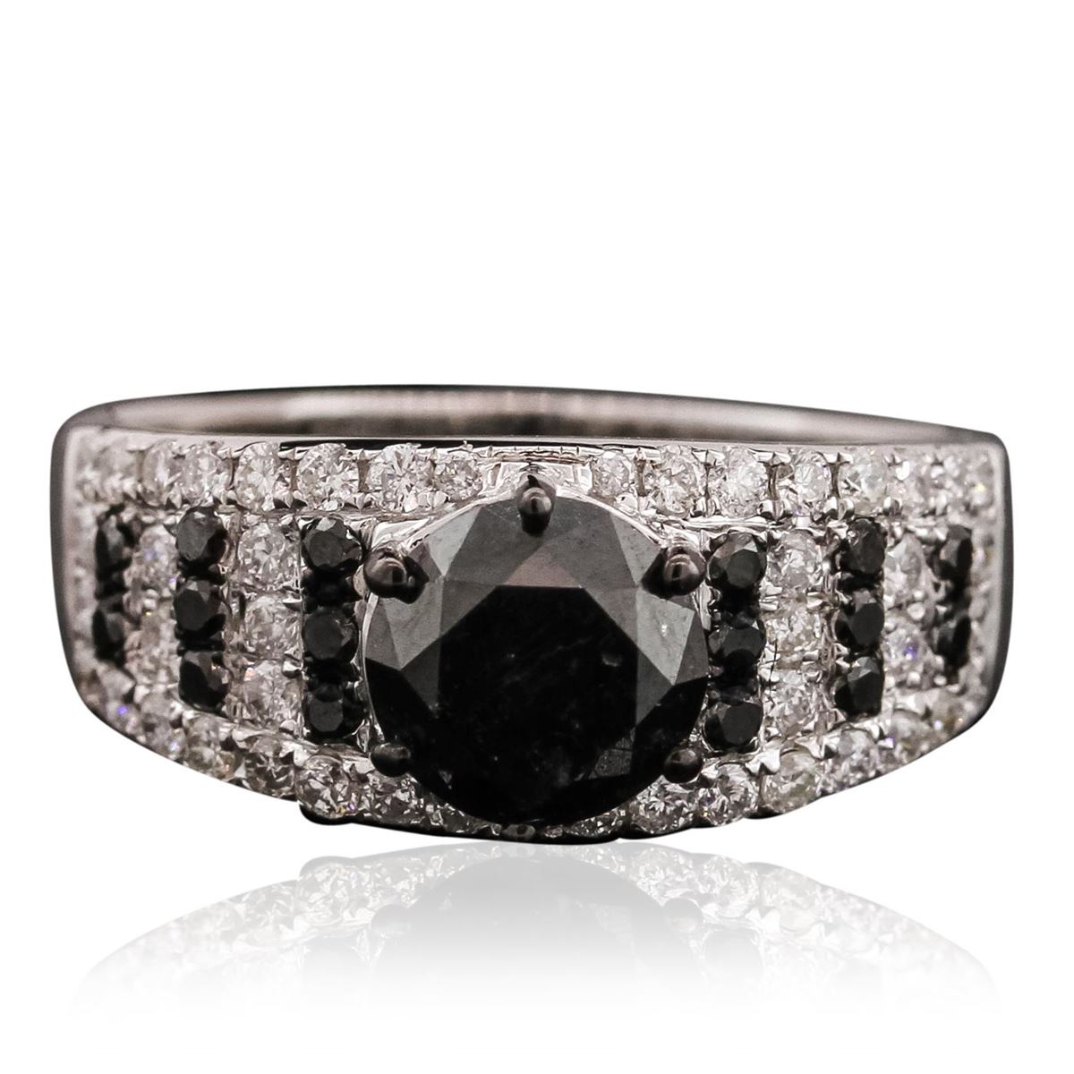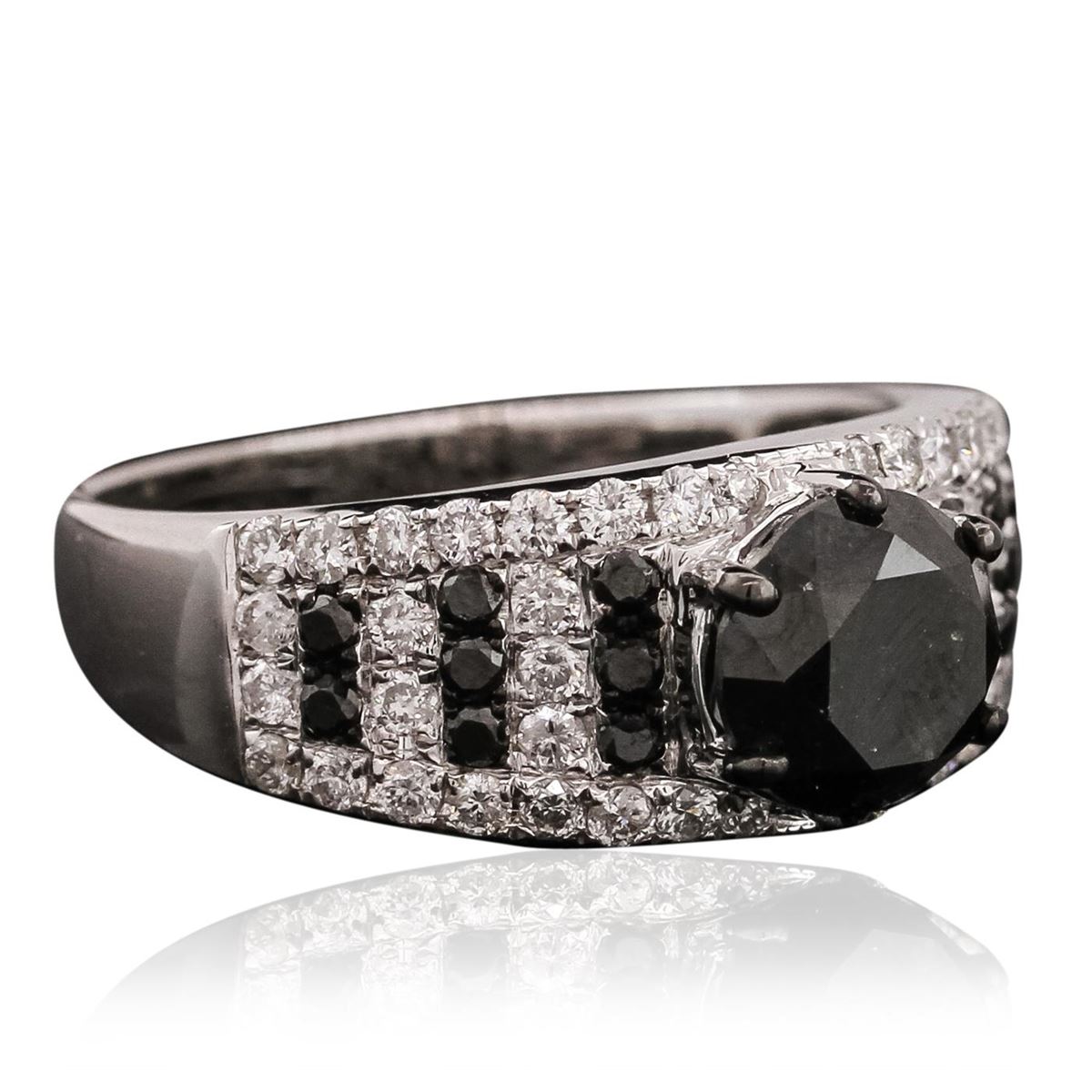 One ring featuring: 18KT white gold weighing 5.23 grams containing one black diamond with a total weight of 1.80ct, 16 black diamonds with a total weight of 0.25cts, and 46 round cut diamonds with a total weight of 0.56cts.