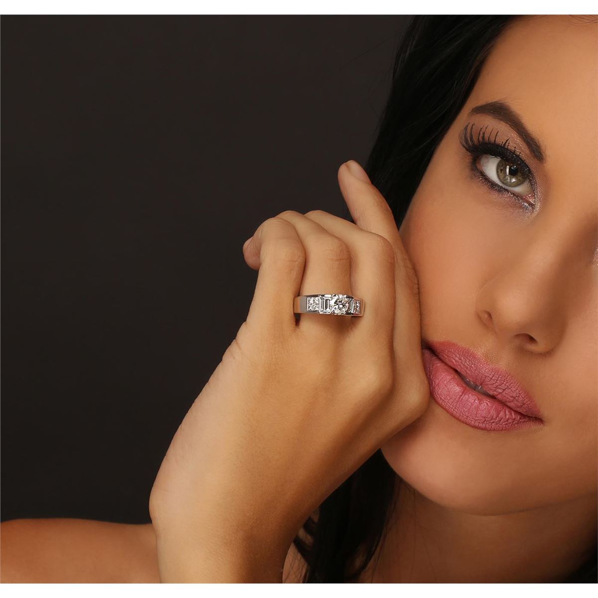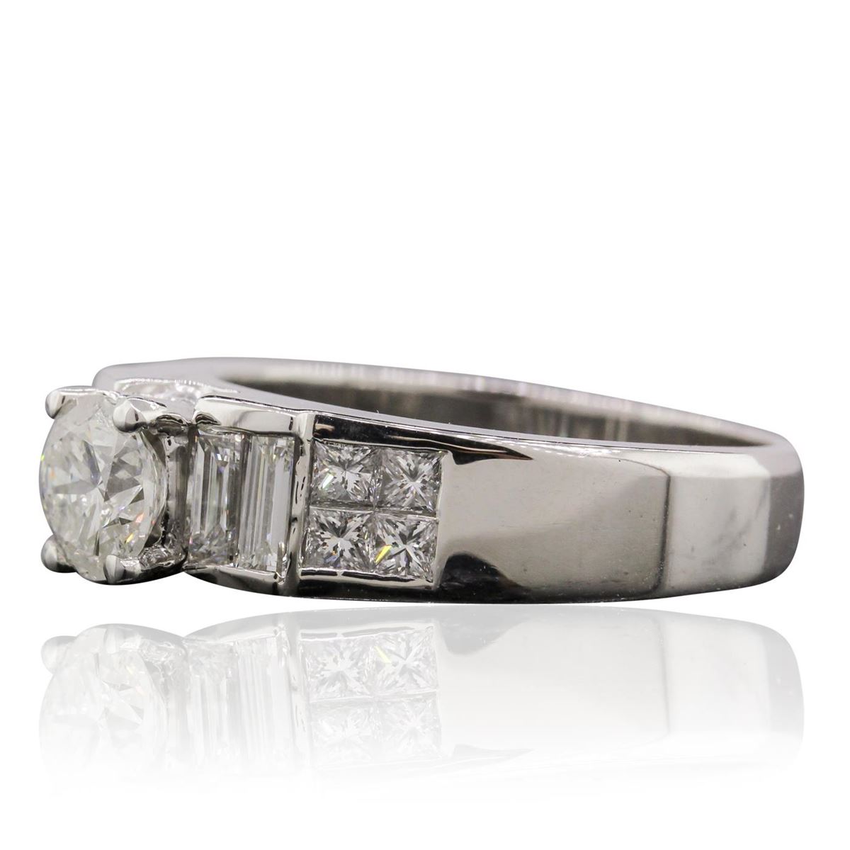 One electronically tested 18KT white gold ladies cast & assembled diamond unity ring with a bright polish finish. The featured diamond is supported by diamond set shoulders and completed by a four millimeter wide band. Identified with markings of "18K". Condition is good. Containing: One prong set round brilliant cut diamond, measuring 6.40 - 6.30 x 3.81mm (depth est.) approximate weight of 1.03ct with a faint blue fluorescence. Graded in the setting. Clarity: I-1. Color: J Depth 60.0%. Table 66.1%. Four channel set baguette cut diamonds, measuring from 4.90 x 2.80 x 1.96mm (depth est.) to 5.00 x 2.80 x 1.96mm (depth est.) approximate. Total Weight of 4 Stones = 1.00ct. Graded in the setting. Clarity: VVS-2 to VS-2. Color: H - J Eight invisible set princess cut diamonds, measuring 2.30 x 2.20 x 1.65mm (depth est.) approximate. Total Weight of 8 Stones = 0.58ct. Measurements are an average for the group. Graded in the setting. Clarity: VVS-2 to VS-2. Color: F - H. Total Weight of Diamonds 2.61ct. Total Weight of Ring 10.20 grams. AIG Appraised at $21,800.00.