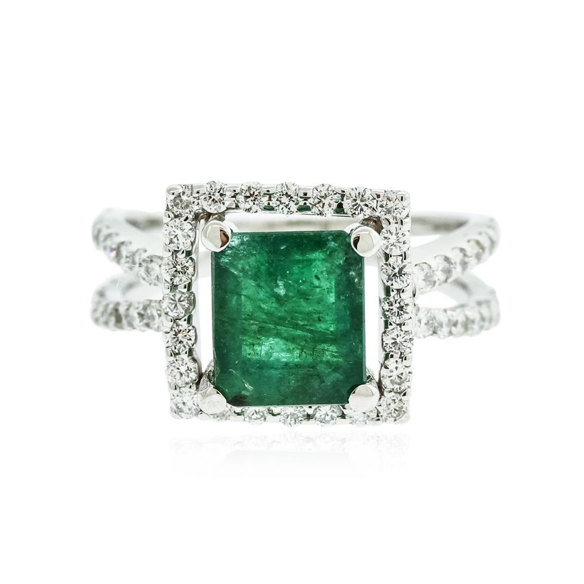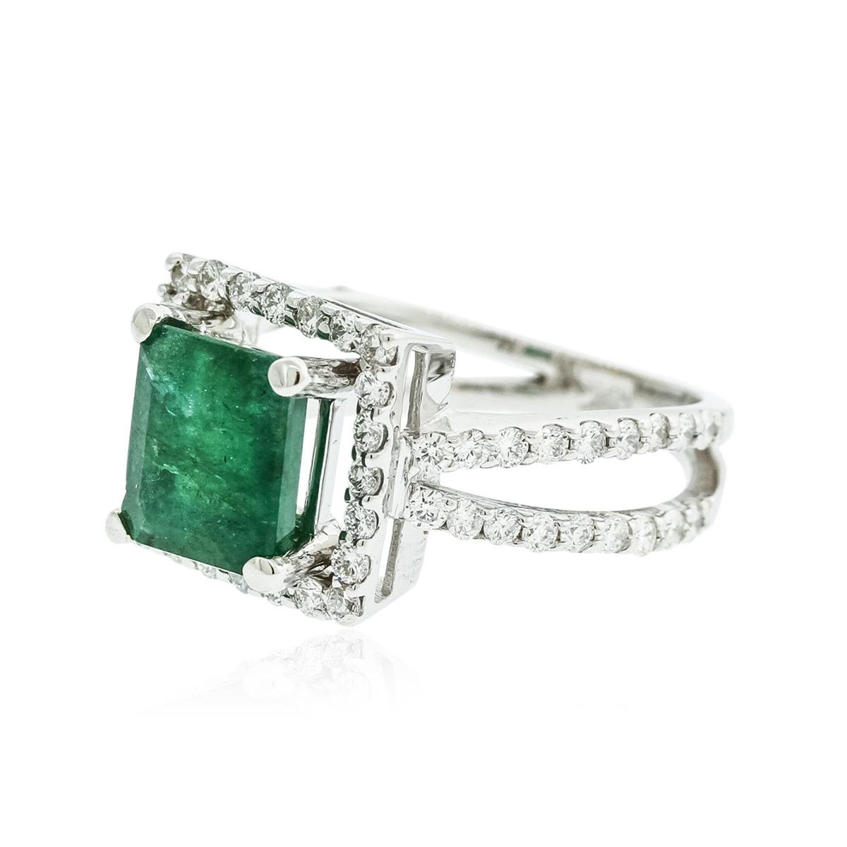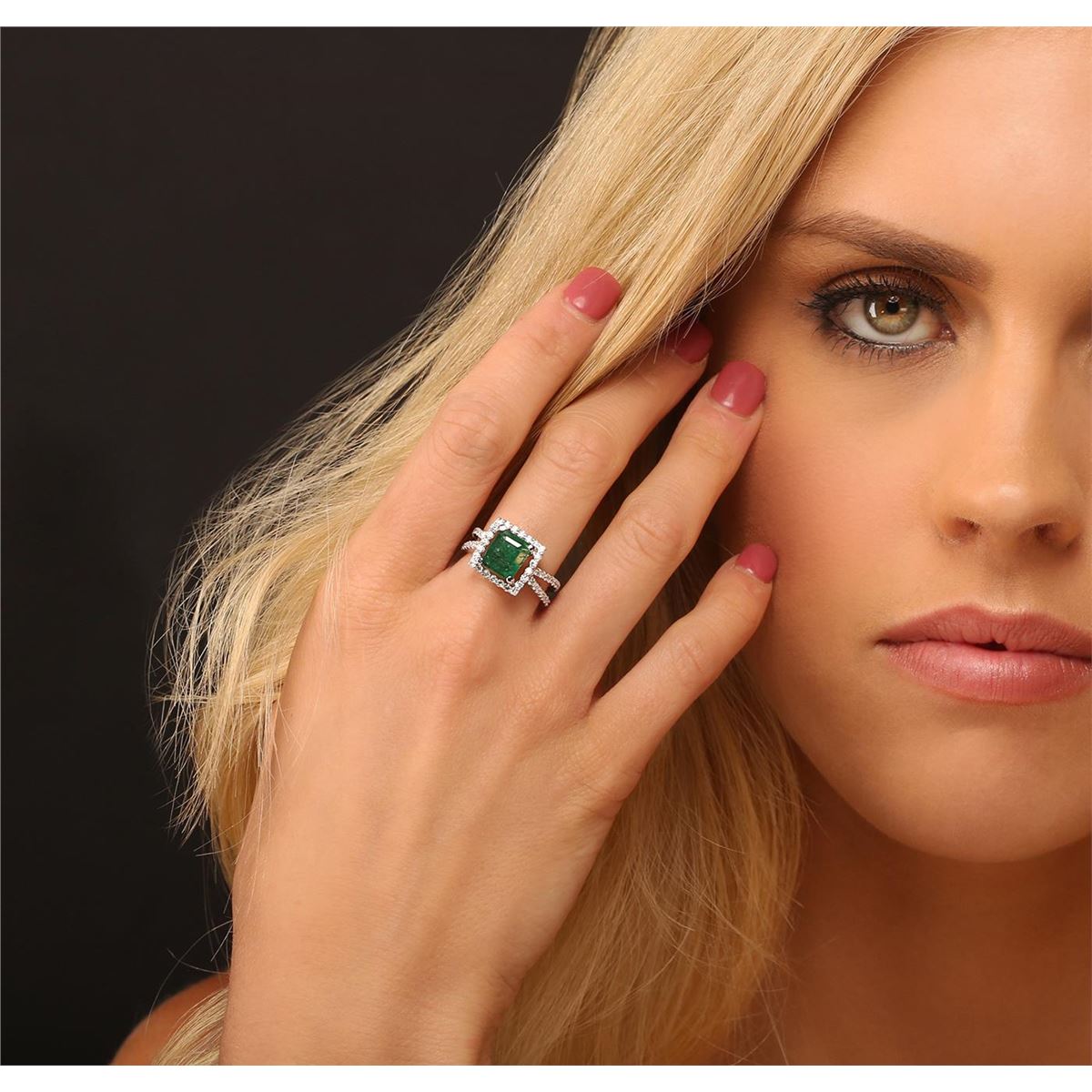 One electronically tested 18KT white gold ladies cast emerald and diamond ring with a bright polish finish. Condition is new, good workmanship. The featured emerald is set within a diamond bezel, supported by diamond set split shoulders and completed by a two and one-half millimeter wide band. Identified with markings of "18K". Containing: One prong set rectangular step cut natural emerald, measuring 8.50 x 7.35 x 4.70mm, 9%. bulge factor, approximate weight of 2.61ct., clarity is heavily included, type III, medium dark, very slightly grayish, very slightly bluish green color, (GIA vslbG 6/3), cut is very good. Transmitting light with a minimum of distortion, transparent to translucent. Naturally occurring internal & external characteristics are present. Indications of oil residue. Graded in the setting. Sixty prong set round brilliant cut diamonds, measuring 1.70 - 1.50 x 0.96mm (depth est.) approximate. Total Weight of 60 Stones = 1.00ct. Graded in the setting. Clarity: SI-1 to SI-2. Color: F - H. Total Weight of Colored Stones 2.61ct. Total Weight of Diamonds 1.00ct. Total Weight of Ring 5.60 grams. AIG Appraised at $8,200.00.
