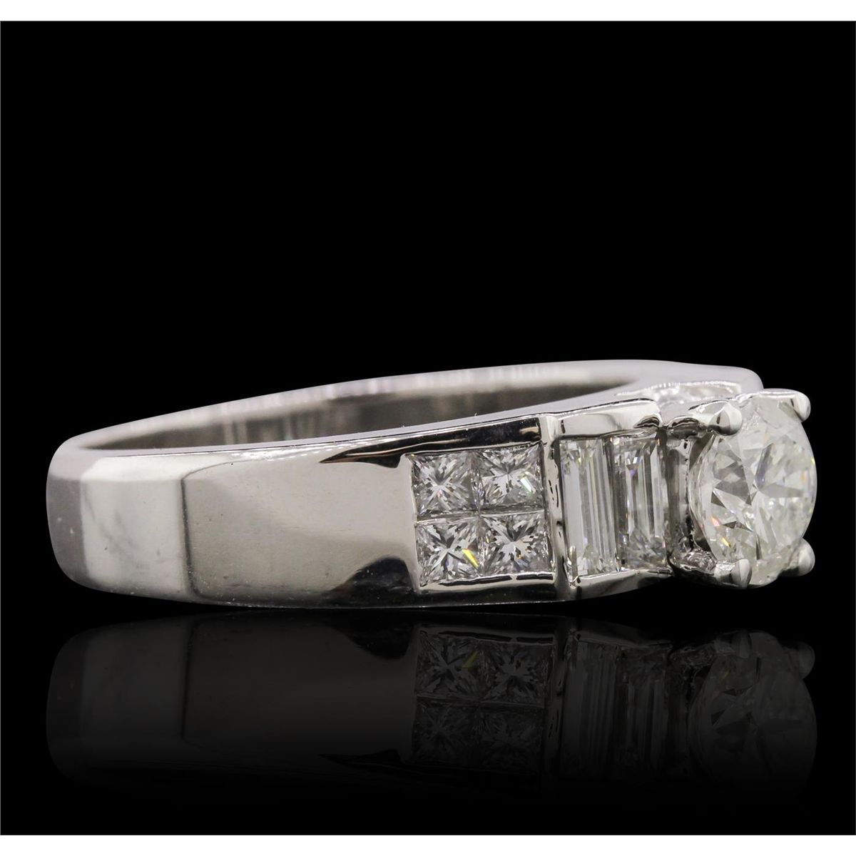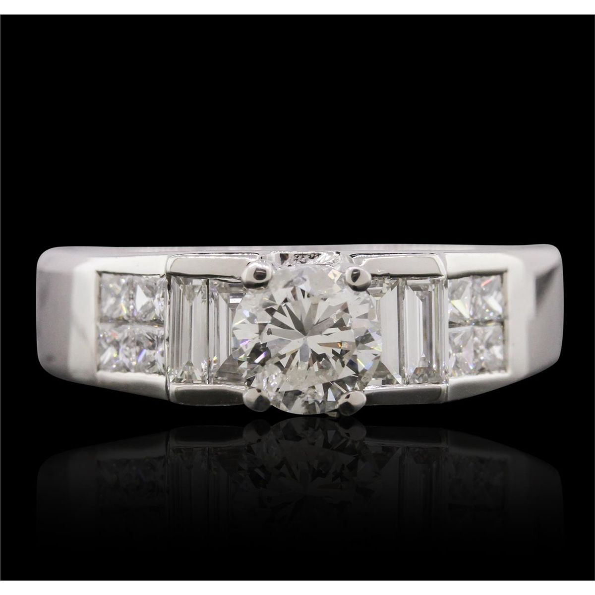 One electronically tested 18KT white gold ladies cast & assembled diamond unity ring with a bright polish finish. The featured diamond is supported by diamond set shoulders and completed by a four millimeter wide band. Identified with markings of "18K". Condition is good. Containing: One prong set round brilliant cut diamond, measuring 6.40 - 6.30 x 3.81mm (depth est.) approximate weight of 1.03ct with a faint blue fluorescence. Graded in the setting. Clarity: I-1. Color: J Depth 60.0%. Table 66.1%. Four channel set baguette cut diamonds, measuring from 4.90 x 2.80 x 1.96mm (depth est.) to 5.00 x 2.80 x 1.96mm (depth est.) approximate. Total Weight of 4 Stones = 1.00ct. Graded in the setting. Clarity: VVS-2 to VS-2. Color: H - J Eight invisible set princess cut diamonds, measuring 2.30 x 2.20 x 1.65mm (depth est.) approximate. Total Weight of 8 Stones = 0.58ct. Measurements are an average for the group. Graded in the setting. Clarity: VVS-2 to VS-2. Color: F - H. Total Weight of Diamonds 2.61ct. Total Weight of Ring 10.20 grams. AIG Appraised at $21,800.00.