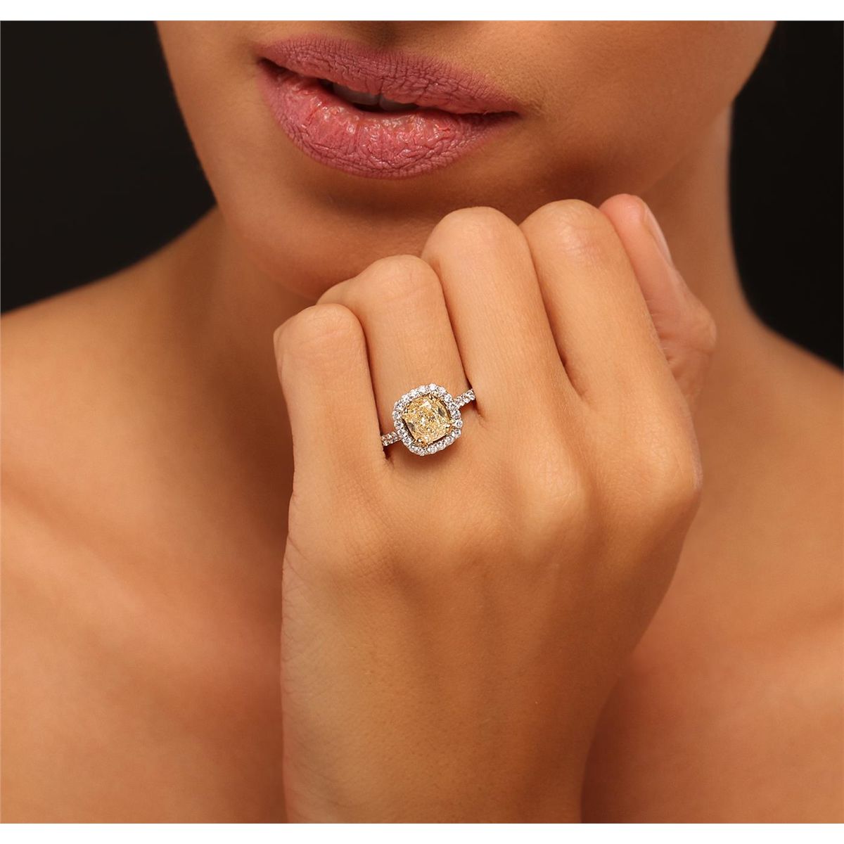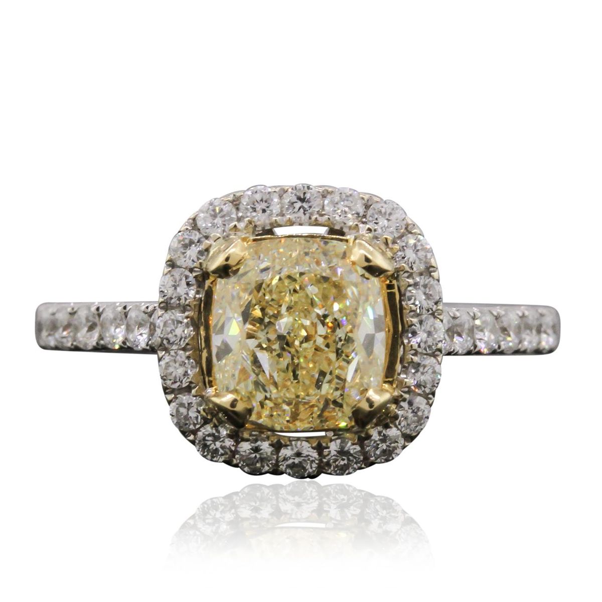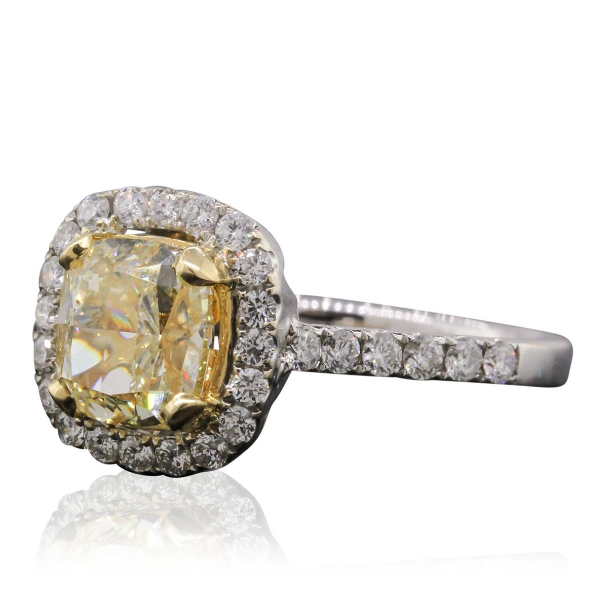 One electronically tested 18KT white gold ladies cast diamond ring with a bright polish finish. Condition is new, good workmanship. The featured diamond is set within a yellow gold basket and placed within a diamond bezel. The ring is supported by diamond set shoulders, completed by a two millimeter wide band. Trademark is DAYANII. Identified with markings of "18K 750". Containing: One prong set cushion cut diamond, measuring 7.23 x 6.49 x 4.30mm (depth est.) approximate weight of 2.04ct with a faint blue fluorescence. EGL Grading Report attached. Graded in the EGL Laboratory, Report #US 910693401D. Clarity: VS-1. Depth: 66.3%. Table 62.0%. Thirty-Two prong set round brilliant cut diamonds (depth est.) approximate. Total Weight of 32 Stones = 0.57ct. Graded in the EGL Laboratory, Report #US 910693401D. Clarity: SI-1 to SI-3. Color: E - F. Total Weight of Diamonds 2.61ct. Total Weight of Ring 4.56 grams. AIG Appraised at $44,210.00.