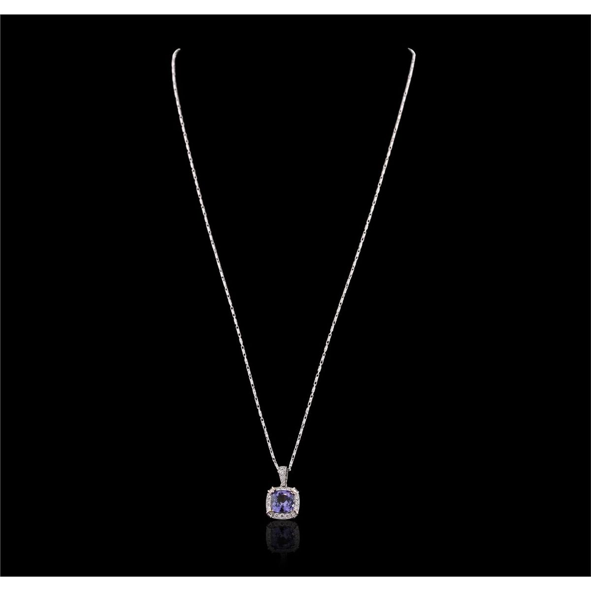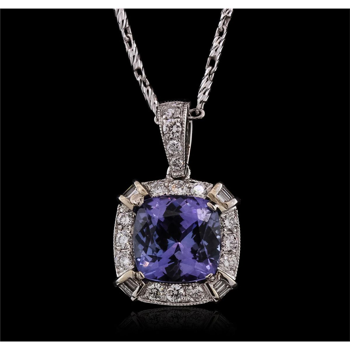 One electronically tested 18KT White Gold ladies cast & assembled tanzanite and diamond pendant with chain. The pendant features a tanzanite set within a diamond bezel, completed by a diamond set bail. The pendant is supported by an eighteen inch length 14KT White Gold designer style chain, terminating in a lobster claw clasp. Bright polish finish with milgrain detailing. Identified with markings of "18K 750". Condition is new, good workmanship. Containing: One prong set square cushion brilliant cut natural tanzanite, measuring 7.90 x 7.80 x 5.00mm, 8% bulge factor, approximate weight of 2.62ct., clarity is eye clean, type I, medium dark, very slightly grayish, bluish violet color, (GIA bV 6/3), cut is good. Transmitting light with no distortion, transparent. Graded in the setting. Tanzanite is a very rare gemstone that is only found in the country of Tanzania. Originally discovered in 1967. Tiffany & Company, named the stone Tanzanite. It is found in the Usumburu Mountains that border the Umba Valley of northern Tanzania. Tanzanite occurs in gray, brown, violet, blue, reddish-purple, & green. The gem is interesting because of its exceptional pleochroism. Rotated in different directions a tanzanite will exhibit multiple changes of color. Tanzanite has a low tolerance to ultrasonic cleaning, and should not be cleaned using this method. Twenty-Eight prong and channel set round brilliant & baguette cut diamonds approximate total weight of 28 Stones = 0.42ct. Graded in the setting. Clarity: VS-1 to VS-2. Color: G - I. Total Weight of Colored Stones 2.62ct. Total Weight of Diamonds 0.42ct. Total Weight of Pendant With Chain 6.27 grams. AIG Appraised at $8,365.00.