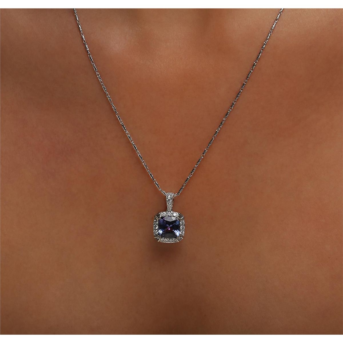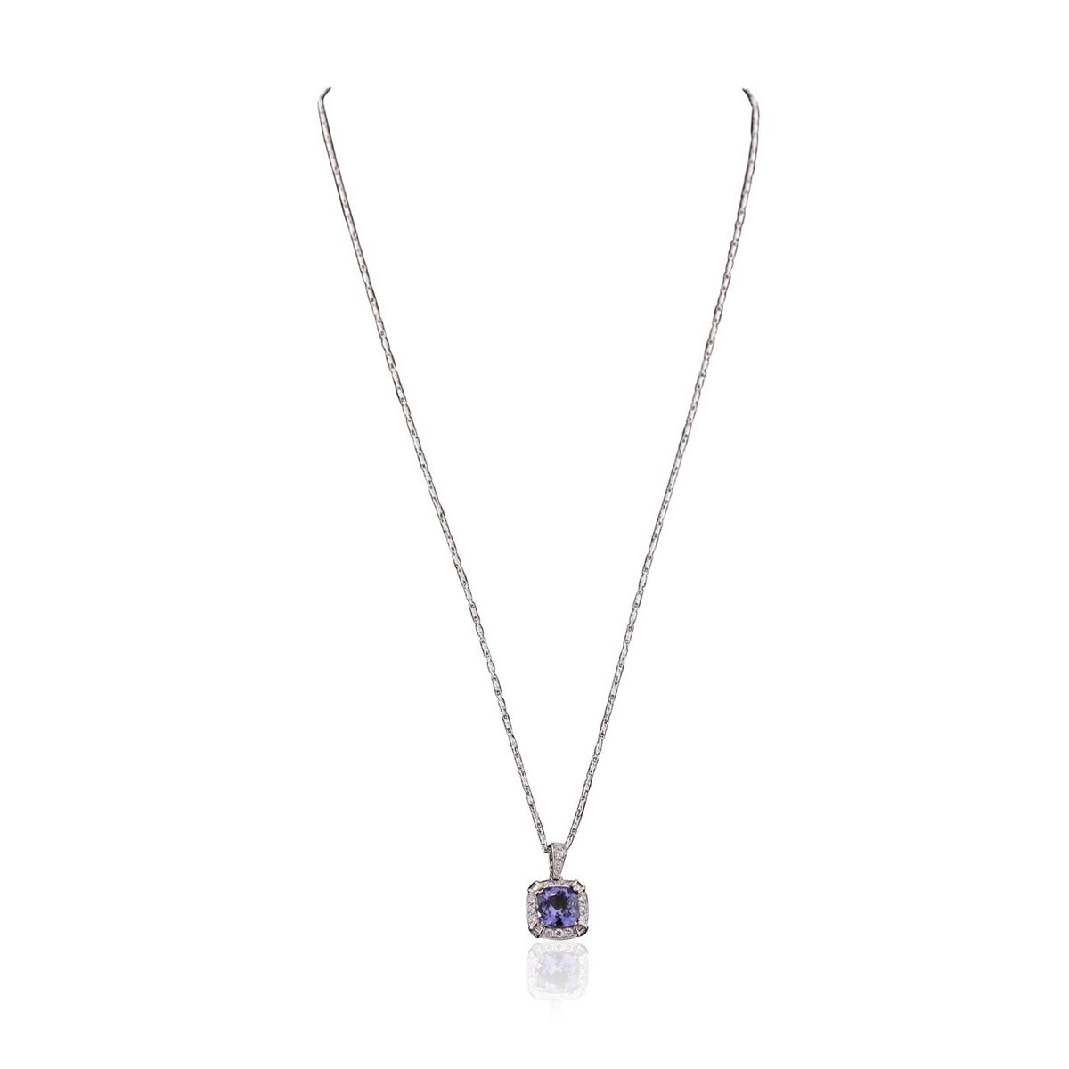 One electronically tested 18KT White Gold ladies cast & assembled tanzanite and diamond pendant with chain. The pendant features a tanzanite set within a diamond bezel, completed by a diamond set bail. The pendant is supported by an eighteen inch length 14KT White Gold designer style chain, terminating in a lobster claw clasp. Bright polish finish with milgrain detailing. Identified with markings of "18K 750". Condition is new, good workmanship. Containing: One prong set square cushion brilliant cut natural tanzanite, measuring 7.90 x 7.80 x 5.00mm, 8% bulge factor, approximate weight of 2.62ct., clarity is eye clean, type I, medium dark, very slightly grayish, bluish violet color, (GIA bV 6/3), cut is good. Transmitting light with no distortion, transparent. Graded in the setting. Tanzanite is a very rare gemstone that is only found in the country of Tanzania. Originally discovered in 1967. Tiffany & Company, named the stone Tanzanite. It is found in the Usumburu Mountains that border the Umba Valley of northern Tanzania. Tanzanite occurs in gray, brown, violet, blue, reddish-purple, & green. The gem is interesting because of its exceptional pleochroism. Rotated in different directions a tanzanite will exhibit multiple changes of color. Tanzanite has a low tolerance to ultrasonic cleaning, and should not be cleaned using this method. Twenty-Eight prong and channel set round brilliant & baguette cut diamonds approximate total weight of 28 Stones = 0.42ct. Graded in the setting. Clarity: VS-1 to VS-2. Color: G - I. Total Weight of Colored Stones 2.62ct. Total Weight of Diamonds 0.42ct. Total Weight of Pendant With Chain 6.27 grams. AIG Appraised at $8,365.00.