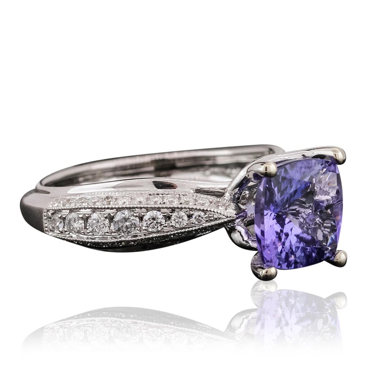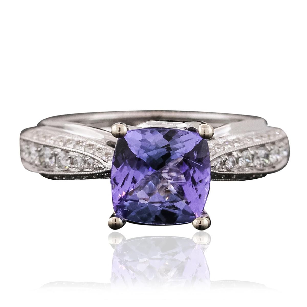 One electronically tested 18KT white gold ladies combination cast & assembled engagement ring with a bright polish finish. Identified with markings of "18K". Condition is new. Containing: One prong set square cushion modified brilliant cut natural tanzanite, measuring 8.00 x 8.00 x 5.20mm, approximate weight of 2.62ct., clarity is eye clean, type I, medium light, very slightly grayish, violet color, (GIA V 4/3), cut is good. Sixty-Two prong set round brilliant cut diamonds, measuring 1.80 - 1.10 x 0.87mm (depth est.) approximate total weight of 62 Stones = 0.69ct. Clarity: SI-1 to SI-2. Color: H - I, Cut is Good. Colored gemstones are presumed to have been subjected to commonly used enhancement processes. All diamonds and colored gemstones are graded in the mounting, unless otherwise stated. Total Weight of Colored Stones 2.62ct. Total Weight of Diamonds 0.69ct. Total Weight of Ring 4.70 grams. GGL Appraised at $7,640.00.