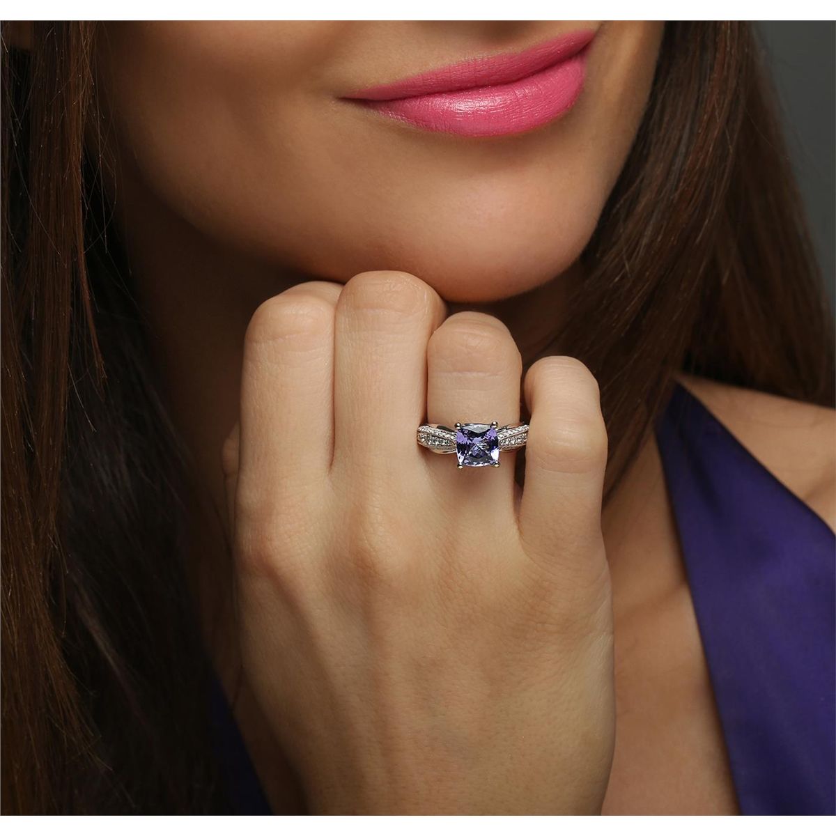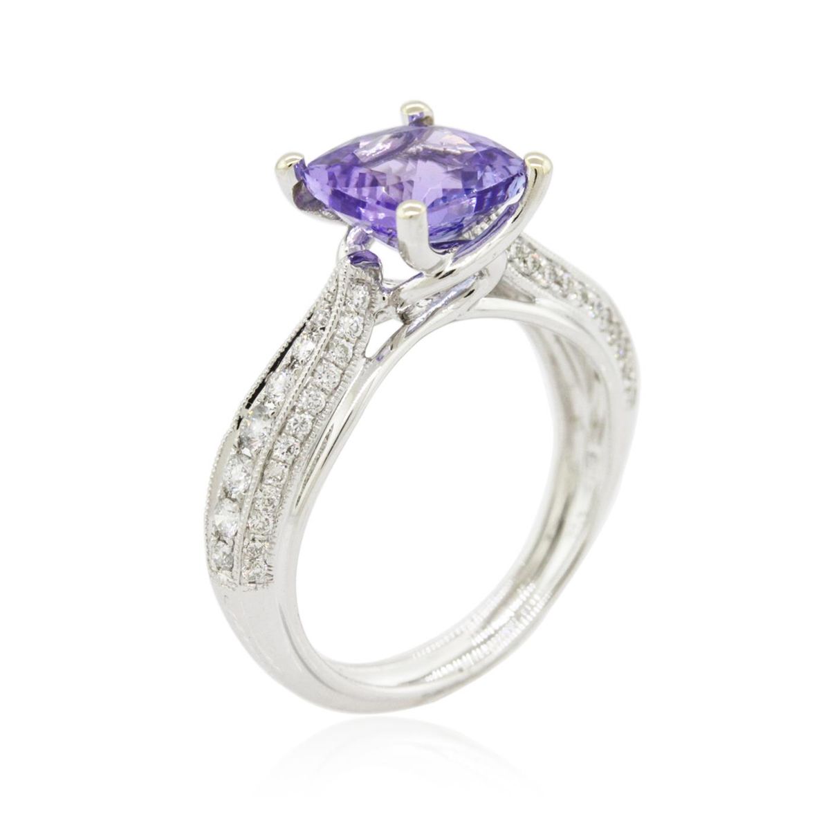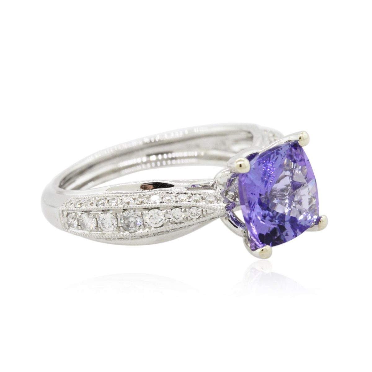 One electronically tested 18KT white gold ladies combination cast & assembled engagement ring with a bright polish finish. Identified with markings of "18K". Condition is new. Containing: One prong set square cushion modified brilliant cut natural tanzanite, measuring 8.00 x 8.00 x 5.20mm, approximate weight of 2.62ct., clarity is eye clean, type I, medium light, very slightly grayish, violet color, (GIA V 4/3), cut is good. Sixty-Two prong set round brilliant cut diamonds, measuring 1.80 - 1.10 x 0.87mm (depth est.) approximate total weight of 62 Stones = 0.69ct. Clarity: SI-1 to SI-2. Color: H - I, Cut is Good. Colored gemstones are presumed to have been subjected to commonly used enhancement processes. All diamonds and colored gemstones are graded in the mounting, unless otherwise stated. Total Weight of Colored Stones 2.62ct. Total Weight of Diamonds 0.69ct. Total Weight of Ring 4.70 grams. GGL Appraised at $7,640.00.